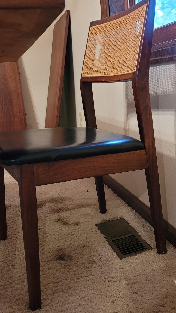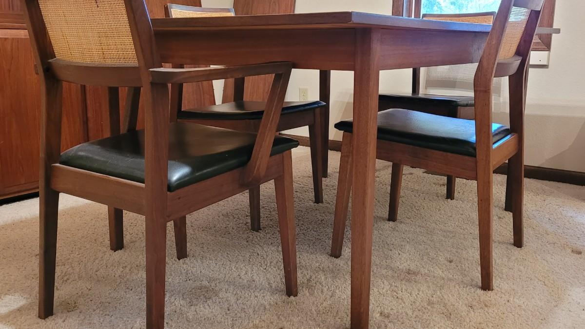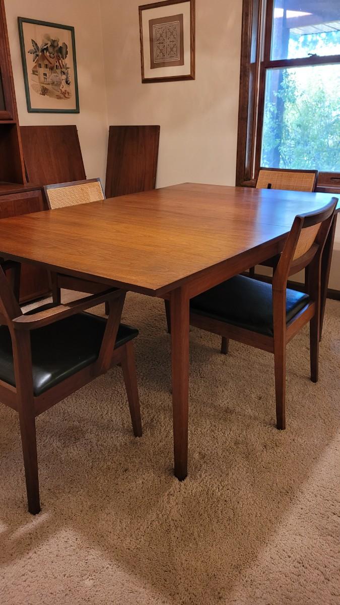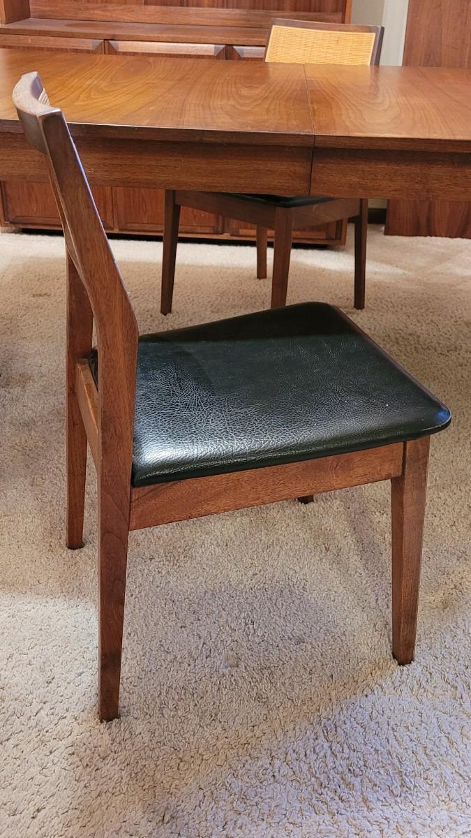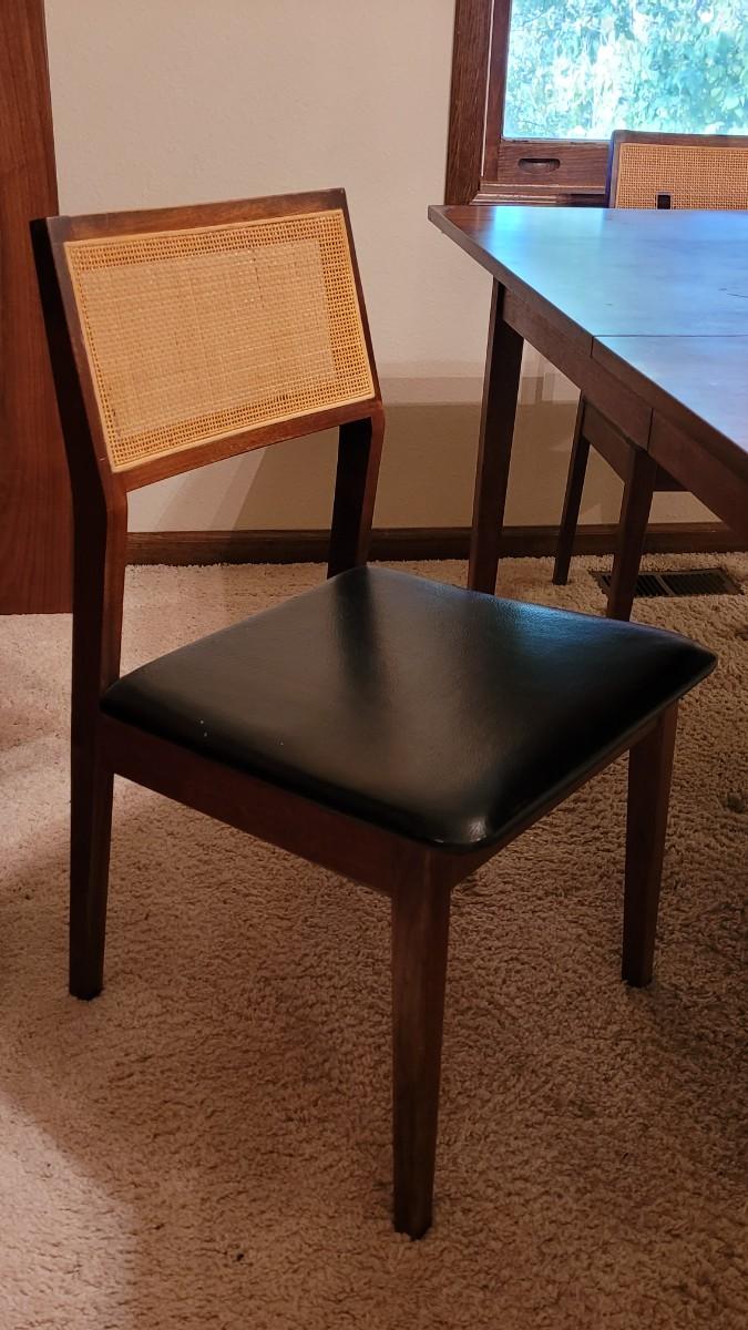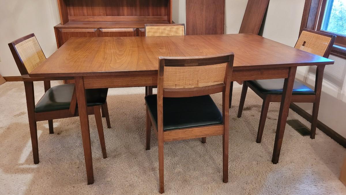 Lot 203: Mid Century Modern FOUNDERS American Walnut Dining Table with 2 Leaves and 4 Black Leather Seat Cane Back Chairs
