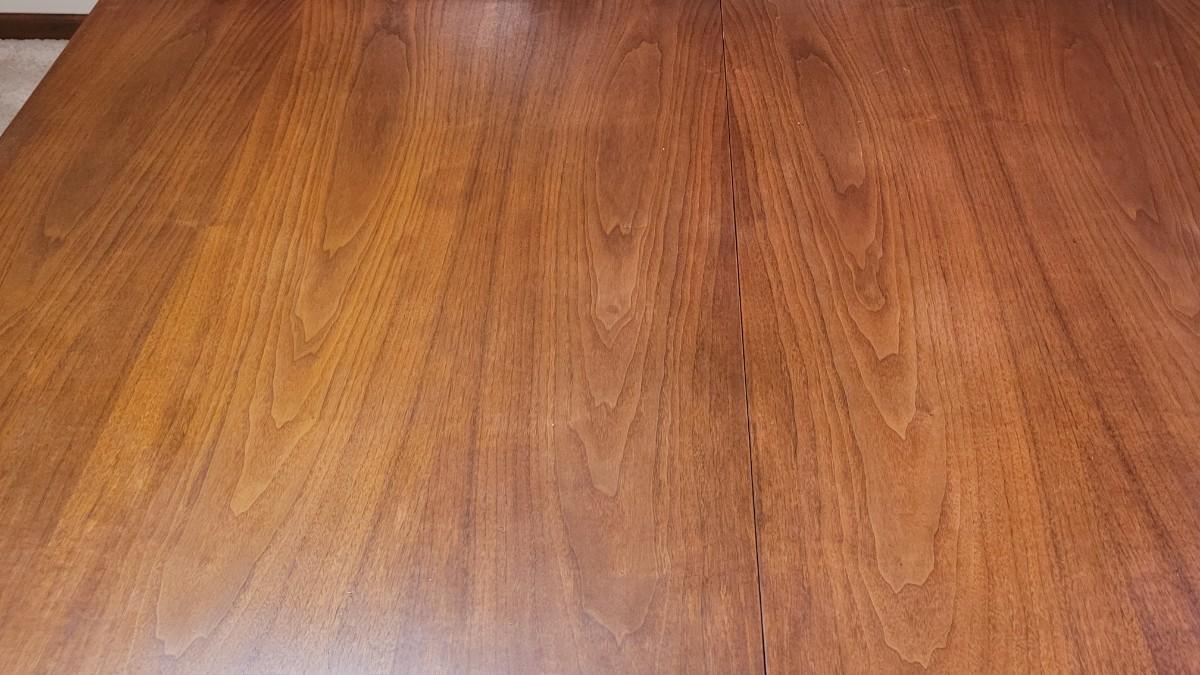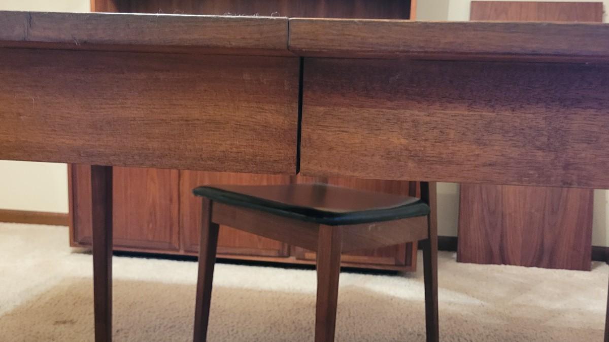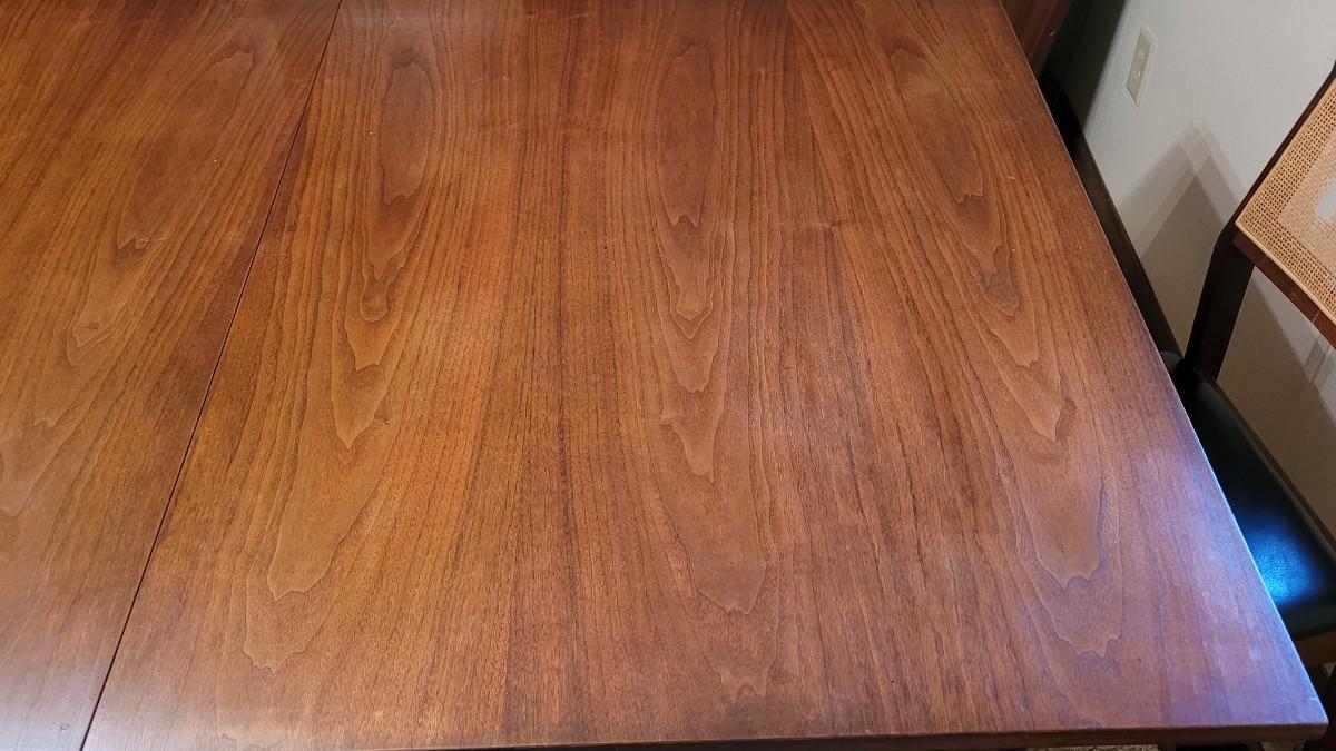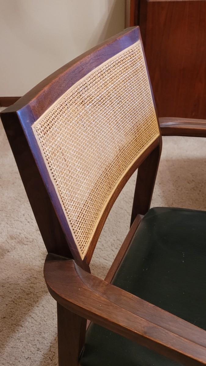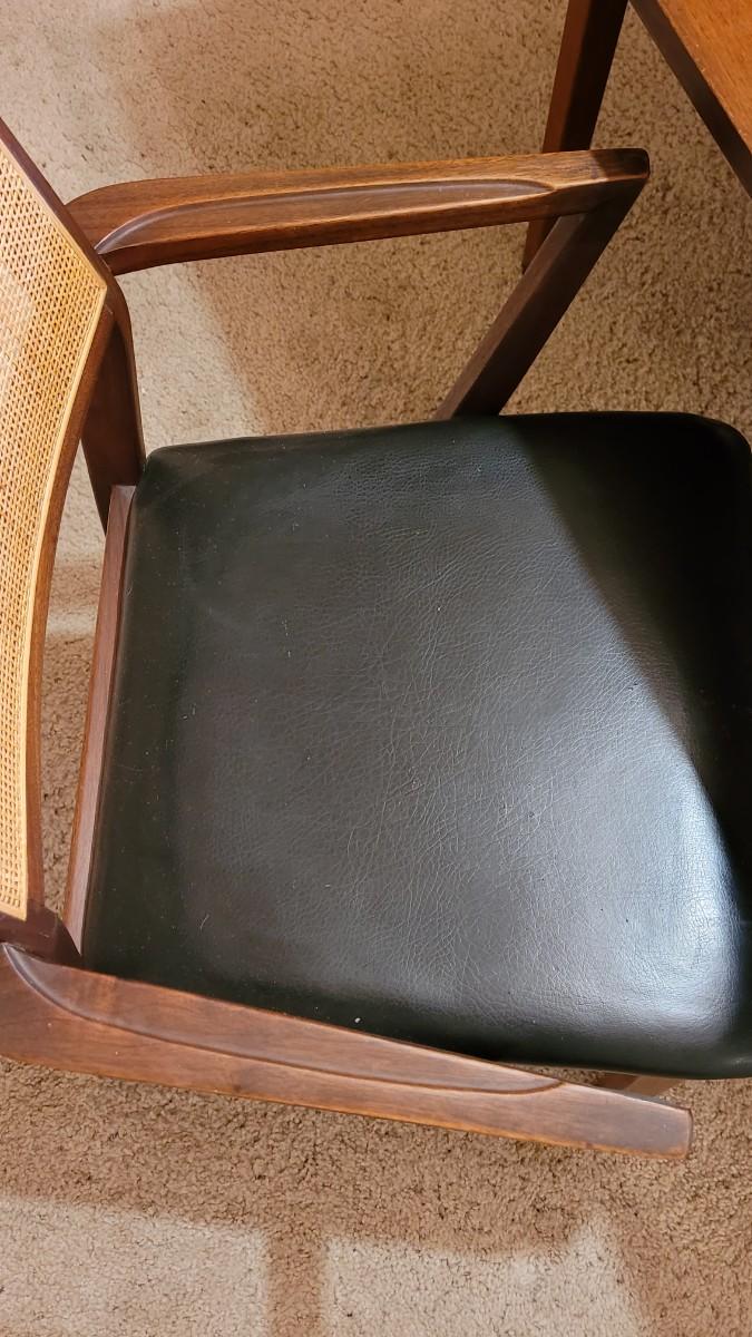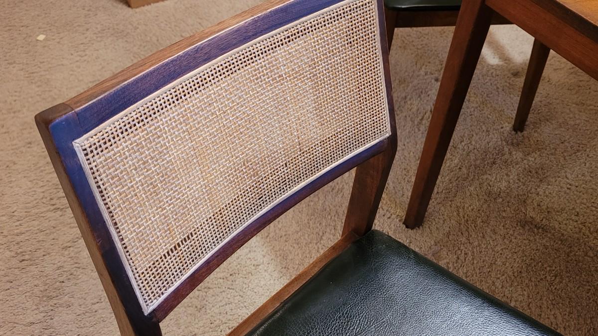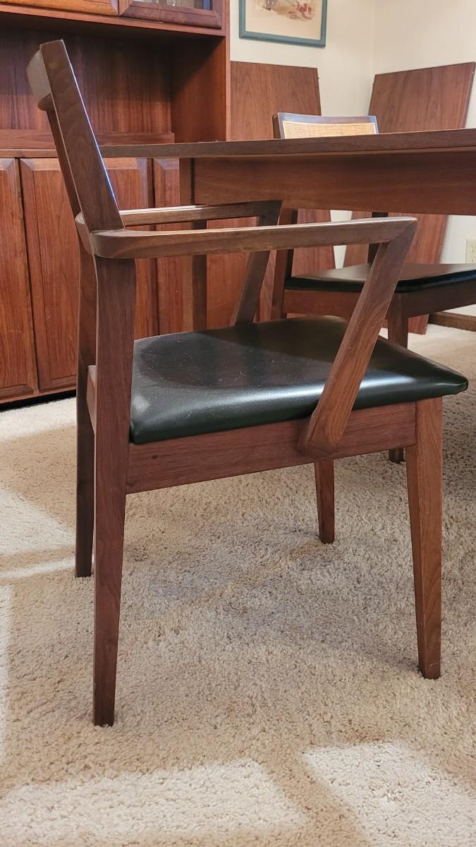 Lot 203: Mid Century Modern FOUNDERS American Walnut Dining Table with 2 Leaves and 4 Black Leather Seat Cane Back Chairs