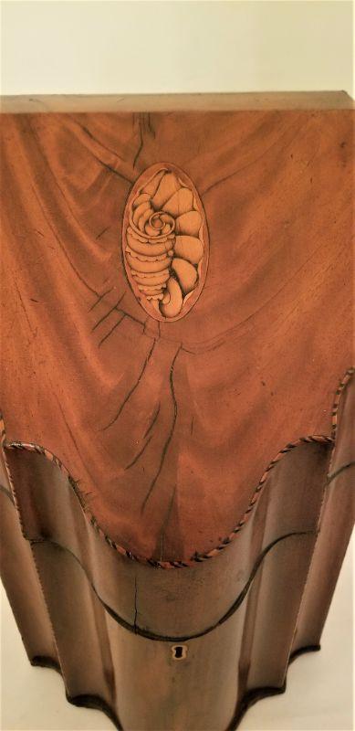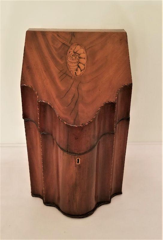 Maple/satinwood inlaid knife or cutlery box - ca. 1840 - Inlaid shell design on front. Antique condition. No key. Lift out divider for knives, etc. 14.5" tall, 8.5" across. Originally purchased at Morton's Auction here in New Orleans. Handsome piece.