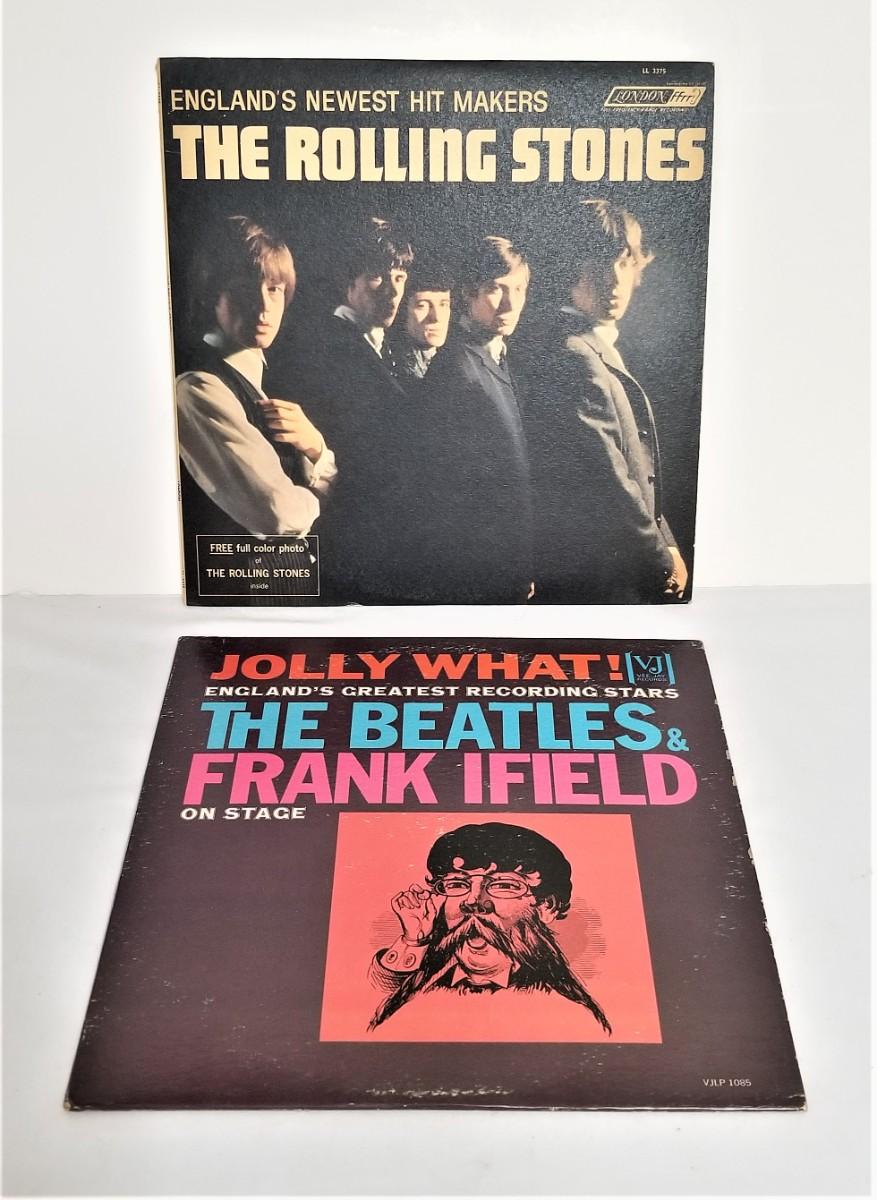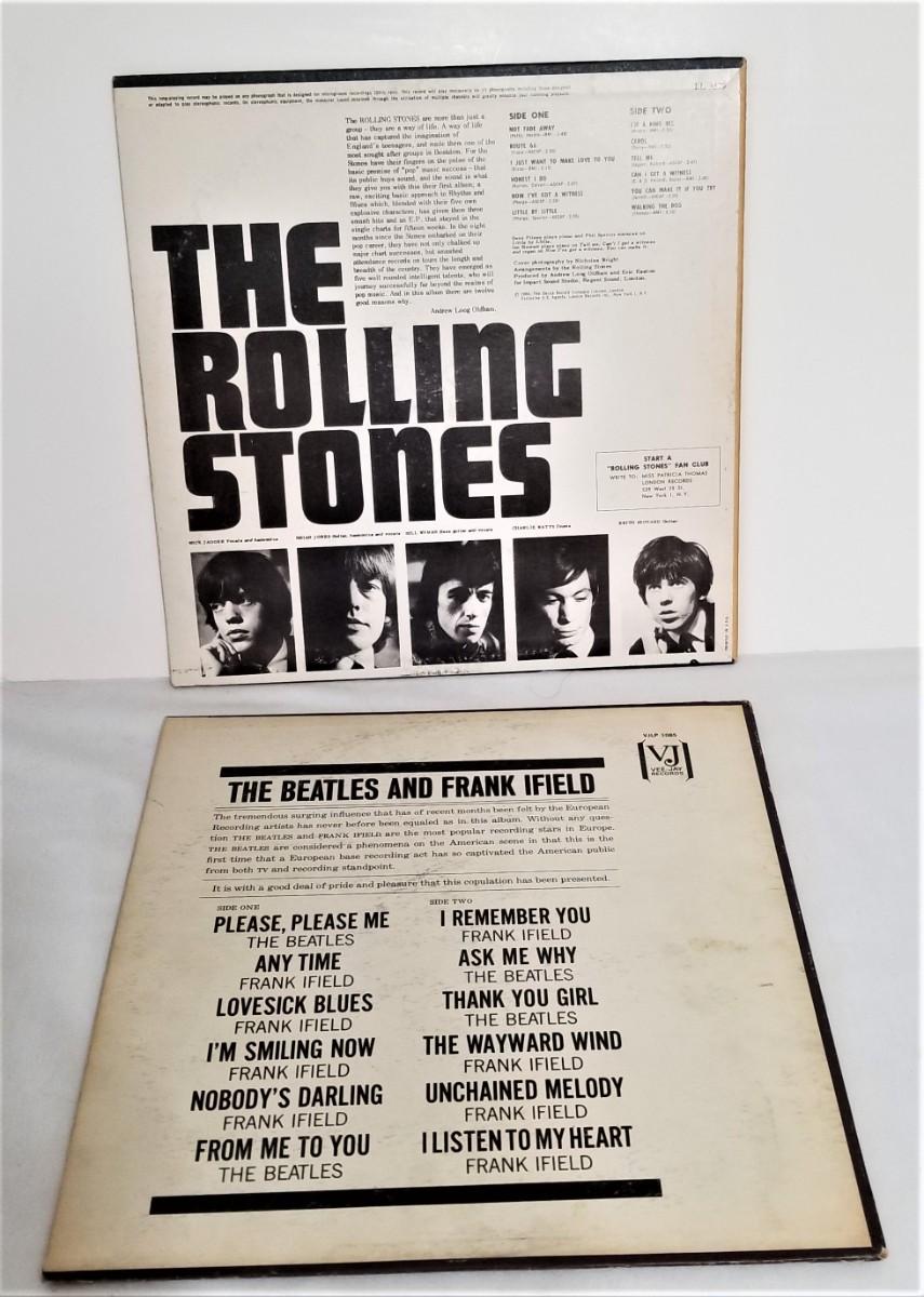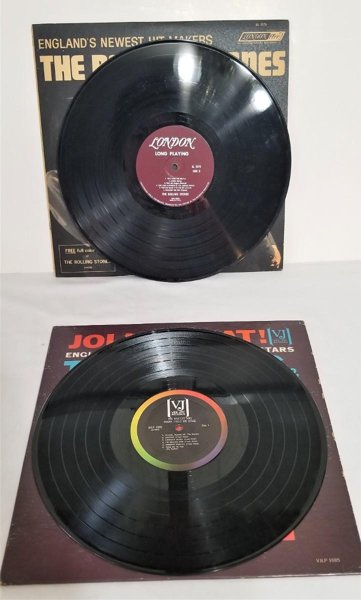 These two vintage Beetles and Rolling Stone albums are not very common. Beetles album is a VEE-Jay pressing. The Rolling Stones album is missing the photo that originally came inside - Decca London, 1964. The records themselves appear to be in good condition.