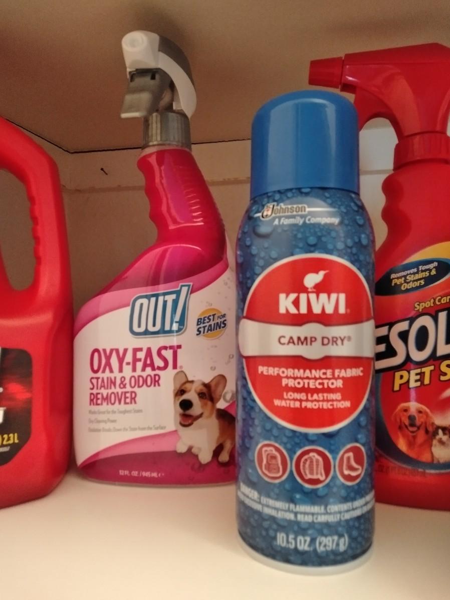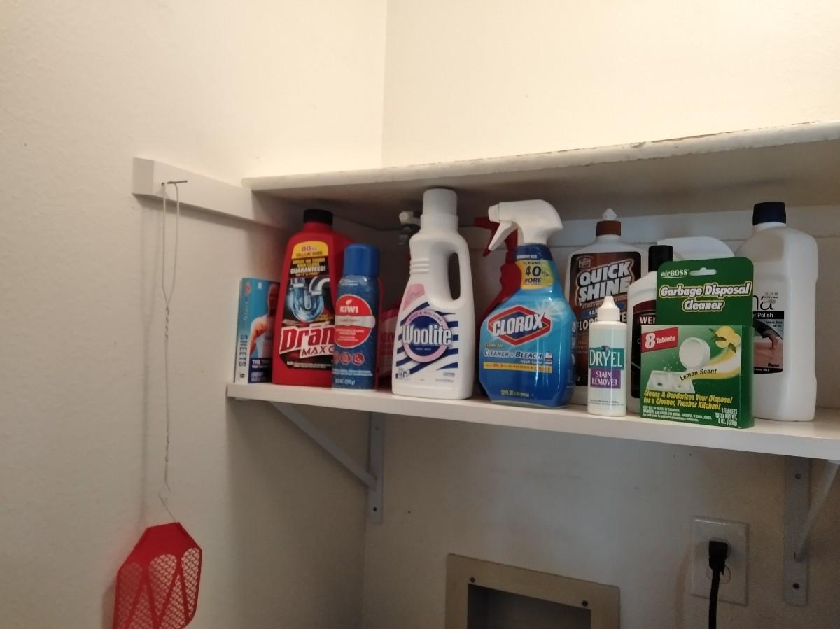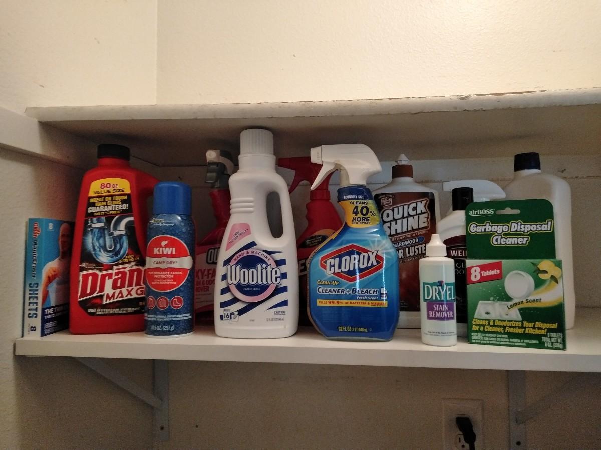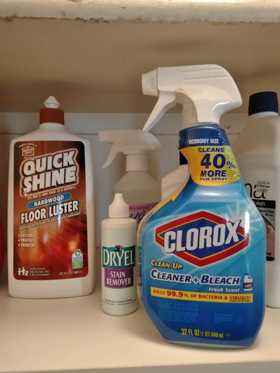 CLEANING CHEMICALS FULL TO NEARLY FULL BOTTLES, ALL HAVE A USABLE AMOUNT.