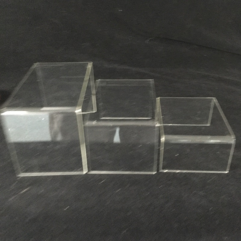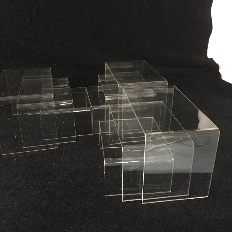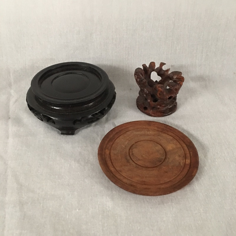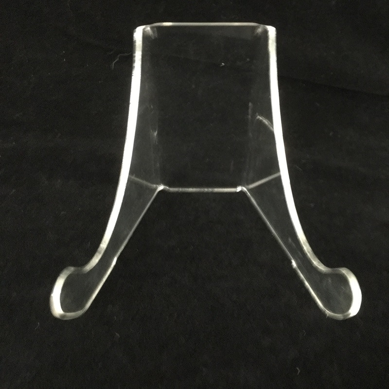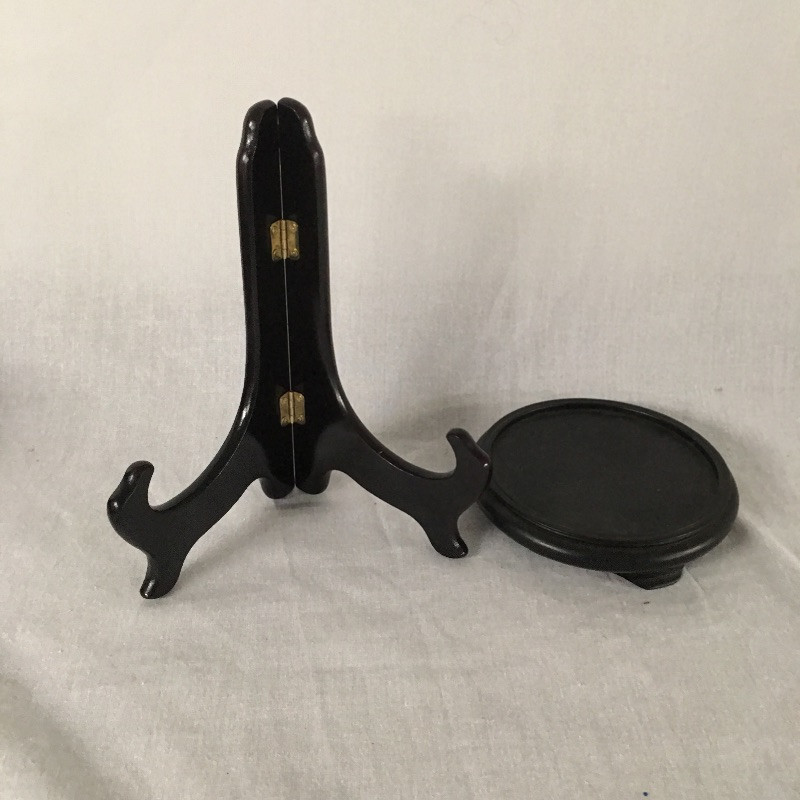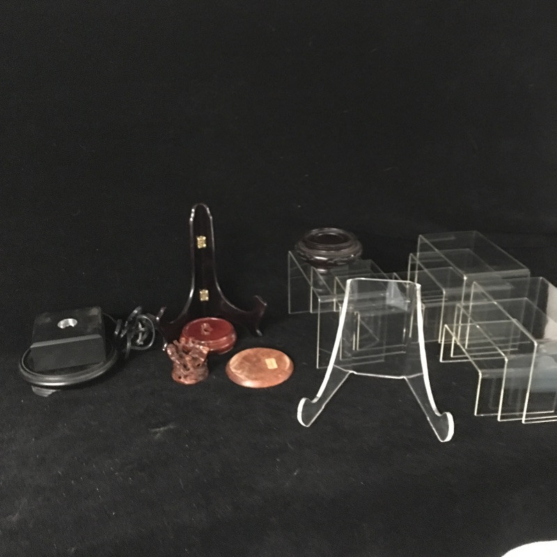 Selection of risers and plate holders including three sets of plexiglass risers, lighted stand, pair of plate holders and wooden stands. Largest plexiglass riser measures 4” x 7.25” x 4.5”.