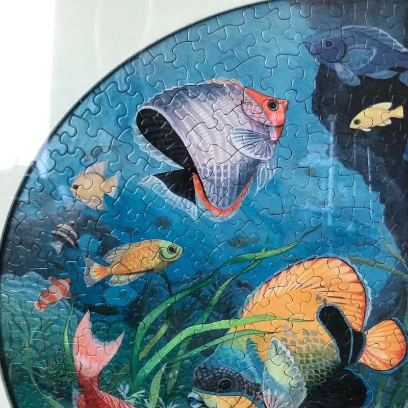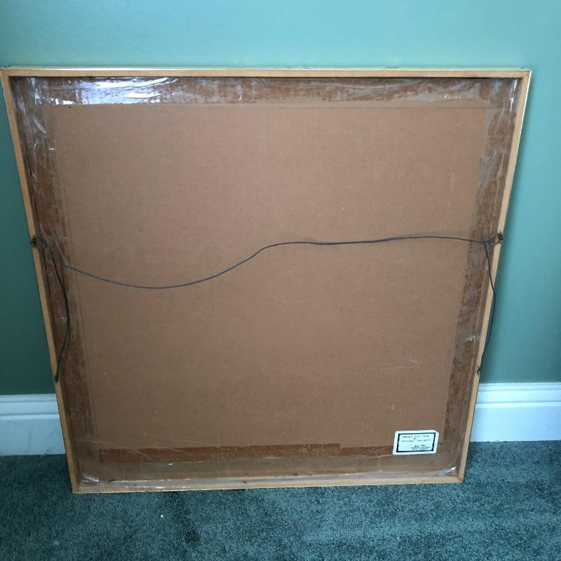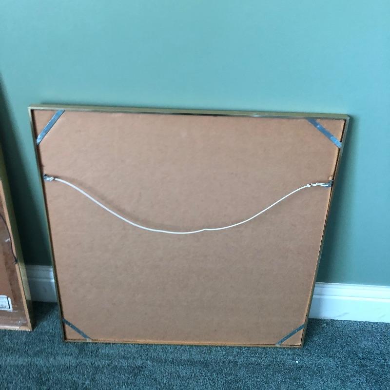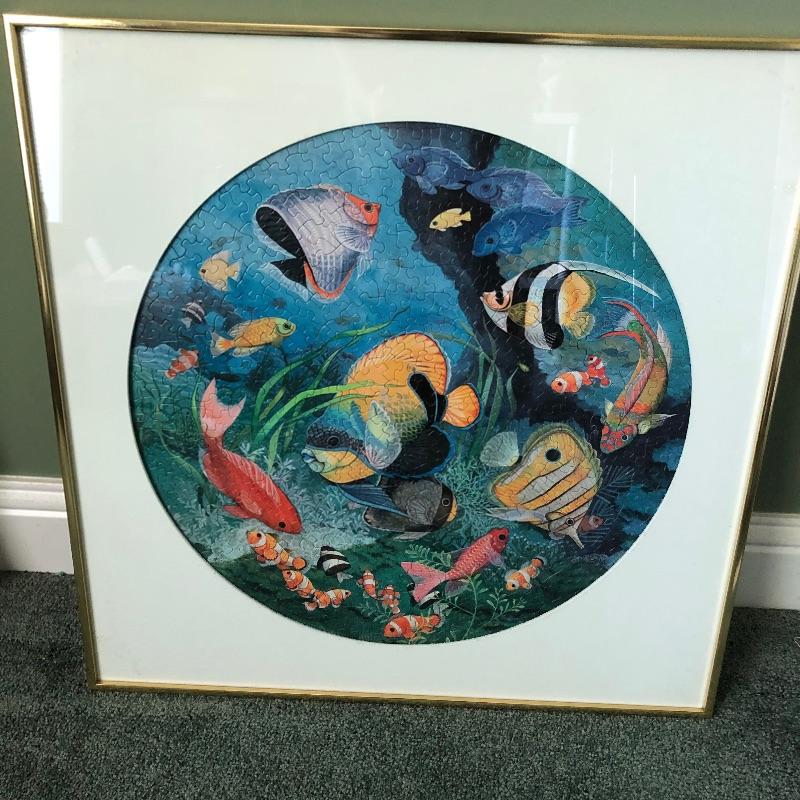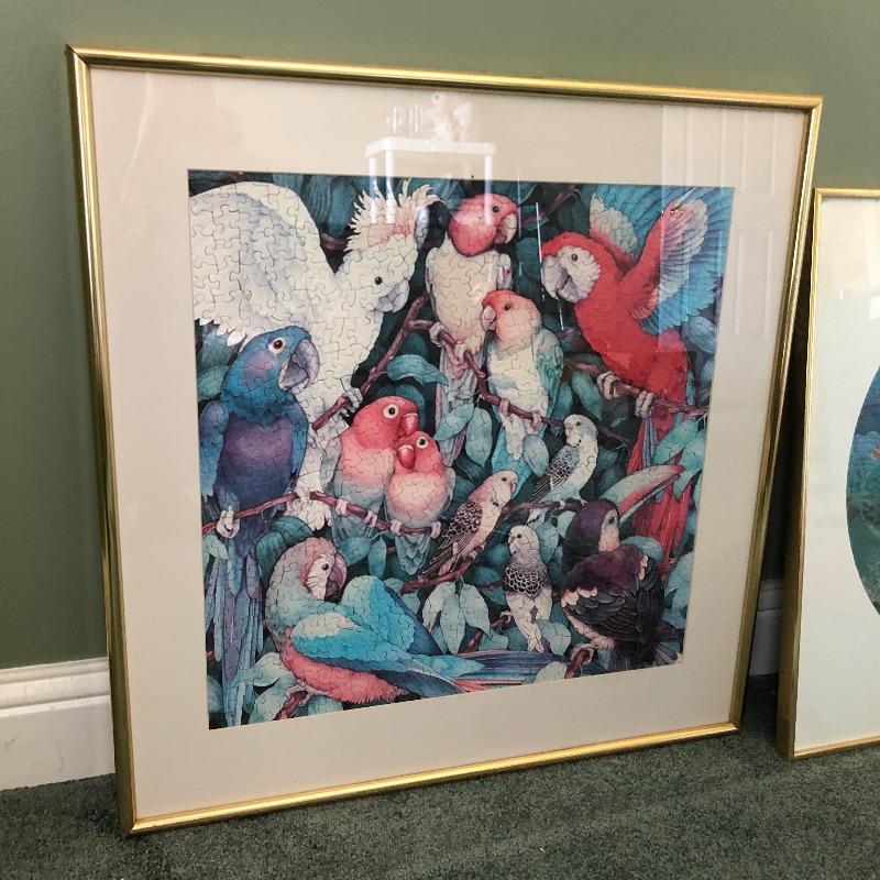 Not a walking stick you see every day, this quirky cane has a wood painted parrot for a handle and measures 37”. You wouldn’t know it until you get up close but both pieces of framed art are in fact jigsaw puzzles. Frames are gold colored and the puzzles are of parrots and the other an ocean scene. The parrot is the larger measuring 26” x 25”.
