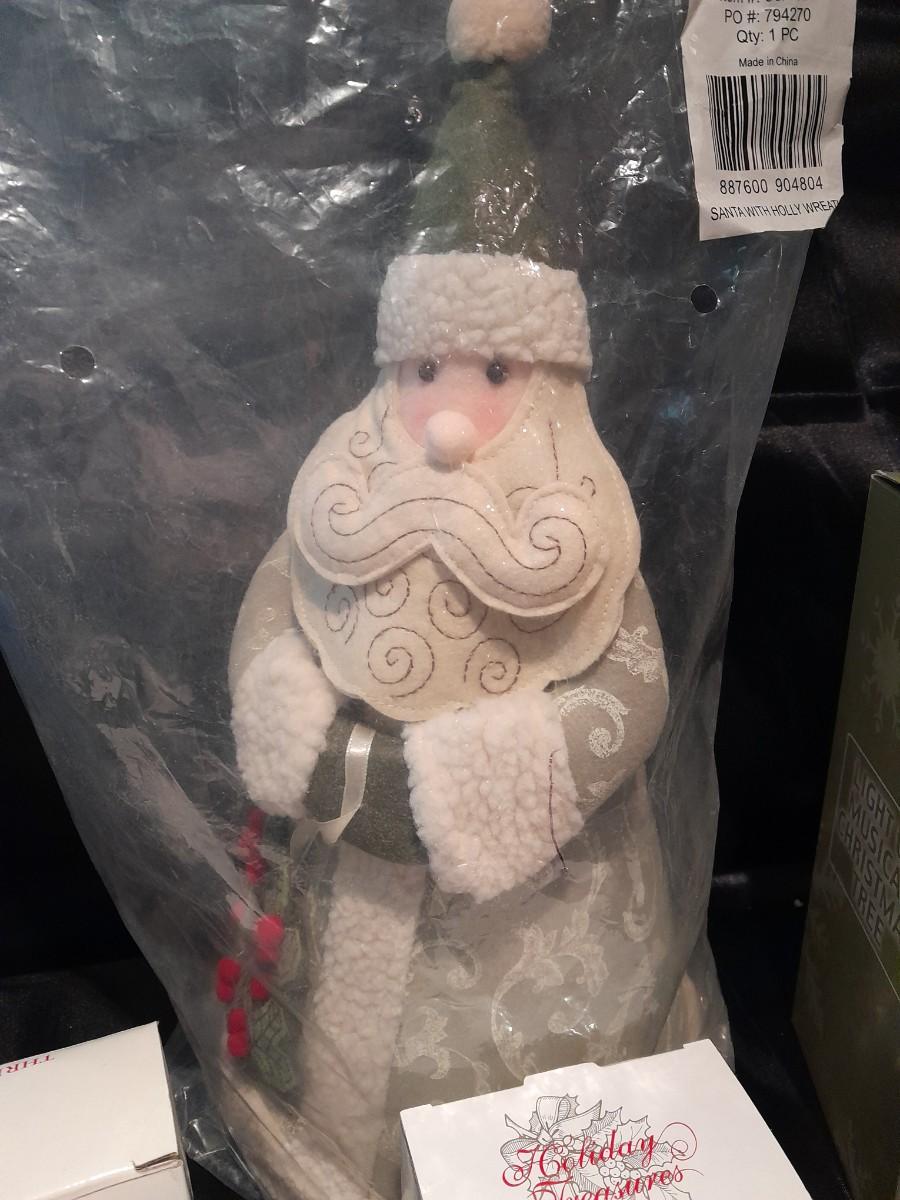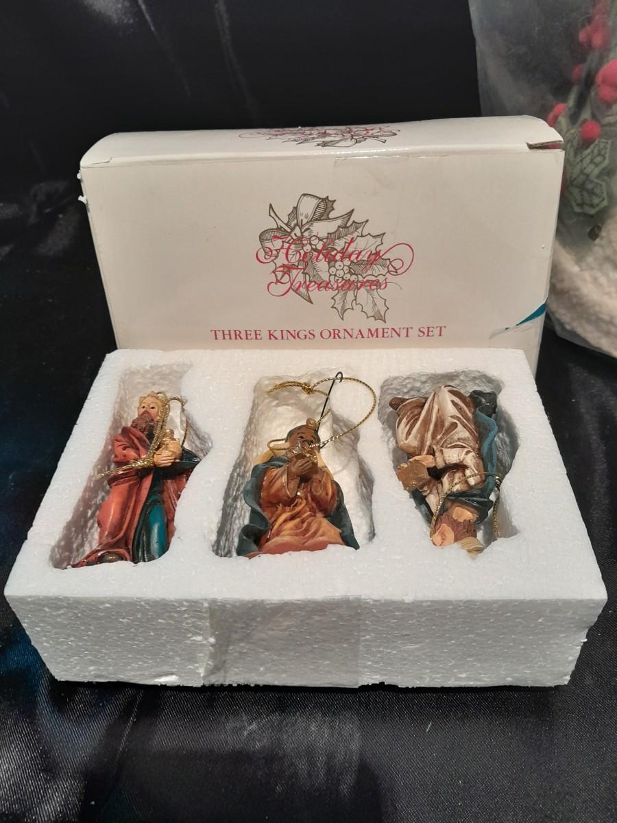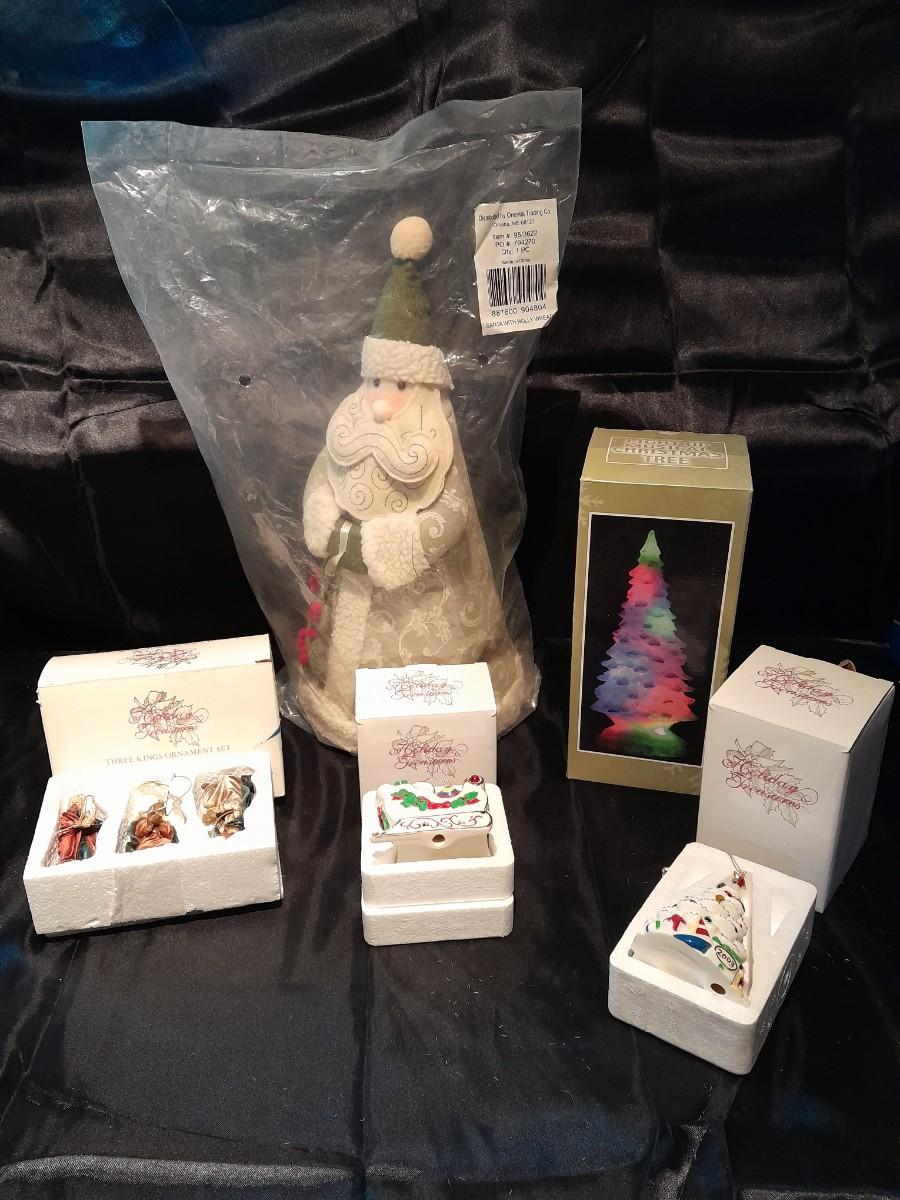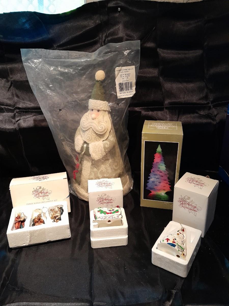 HOLIDAY TREASURES, THREE KINGS ORNAMENT SET, SANTA'S SLEIGH, AND 2003 TREE, A LIGHT UP MUSICAL TREE, AND PLUSH SANTA WITH HOLLY WREATH NEW IN PACKAGE