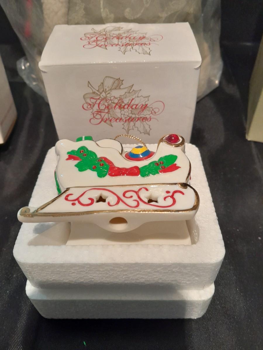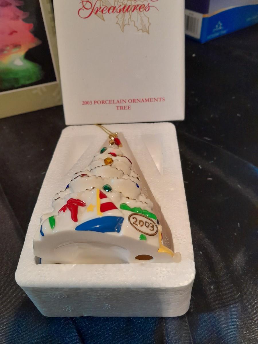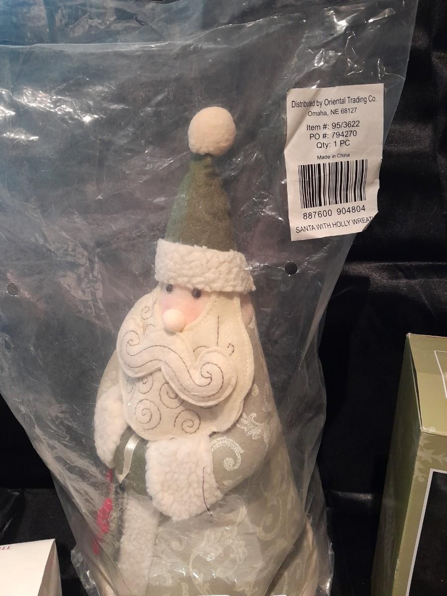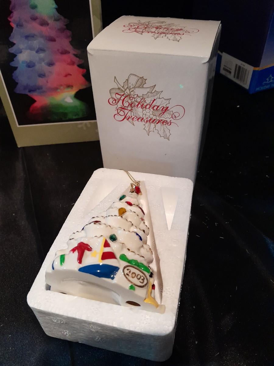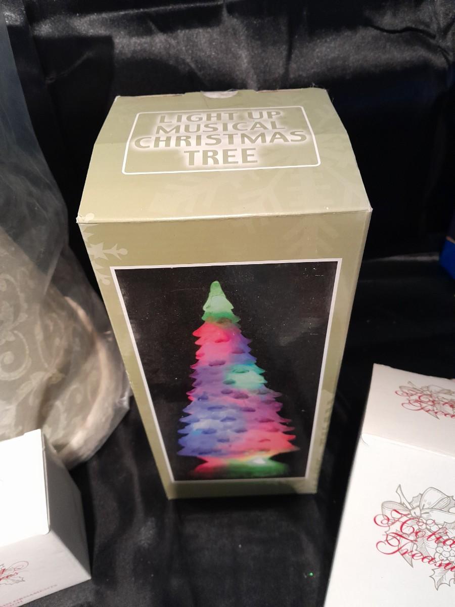 HOLIDAY TREASURES, THREE KINGS ORNAMENT SET, SANTA'S SLEIGH, AND 2003 TREE, A LIGHT UP MUSICAL TREE, AND PLUSH SANTA WITH HOLLY WREATH NEW IN PACKAGE