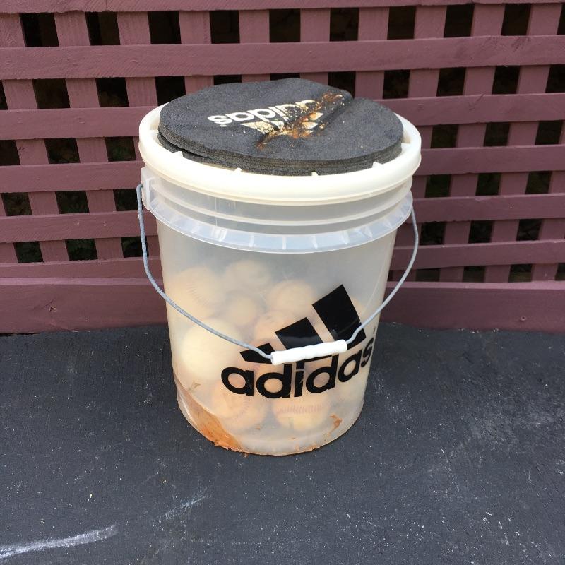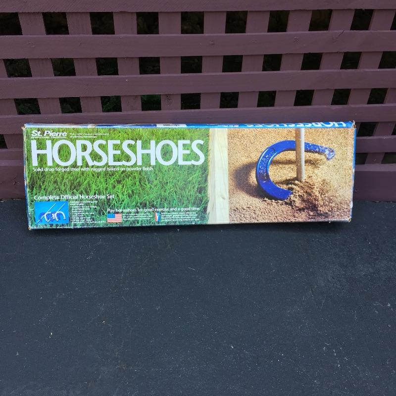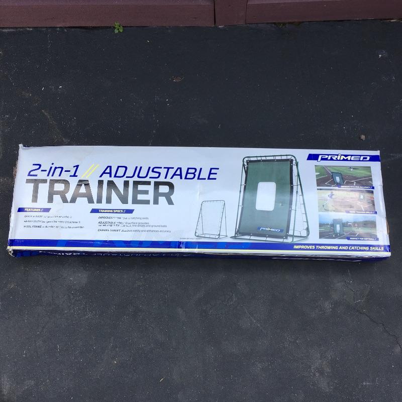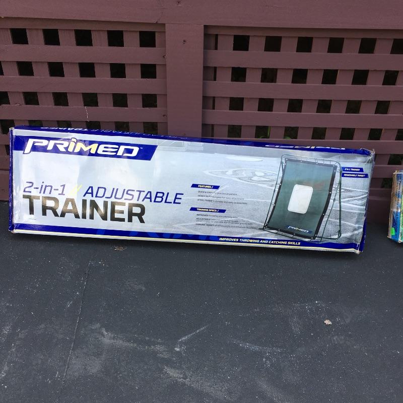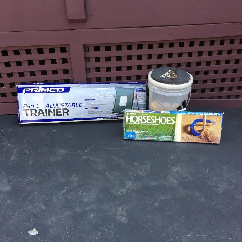 Horseshoes and baseball trainer. Lot includes fifteen baseballs in a Adidas bucket seat, St Pierre horseshoe set that is NIB and a Primed two in one adjustable trainer. Practice your throwing and catching with this great trainer, then have some fun with horseshoes.