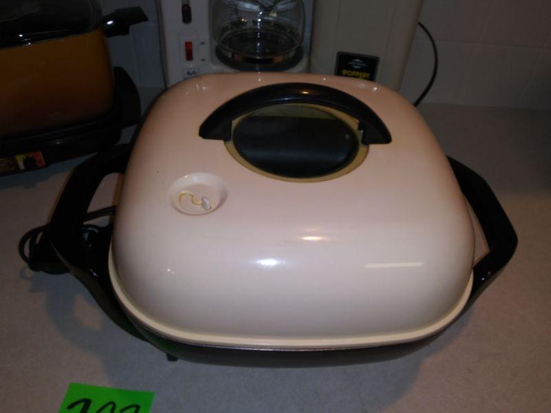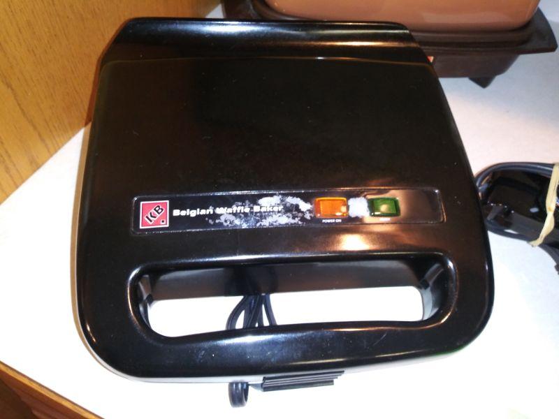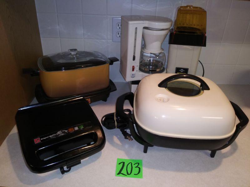 SINGLE COFFEE MAKER, CROCKPOT, ELECTRIC FRYING PAN, AIR POPCORN POPPER, AND A WAFFLE IRON