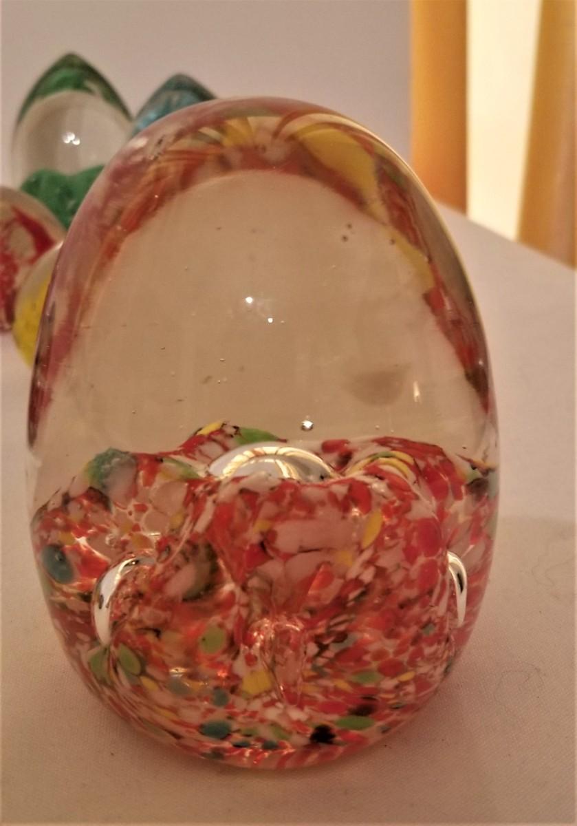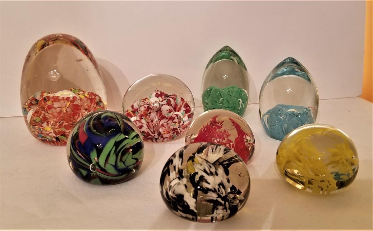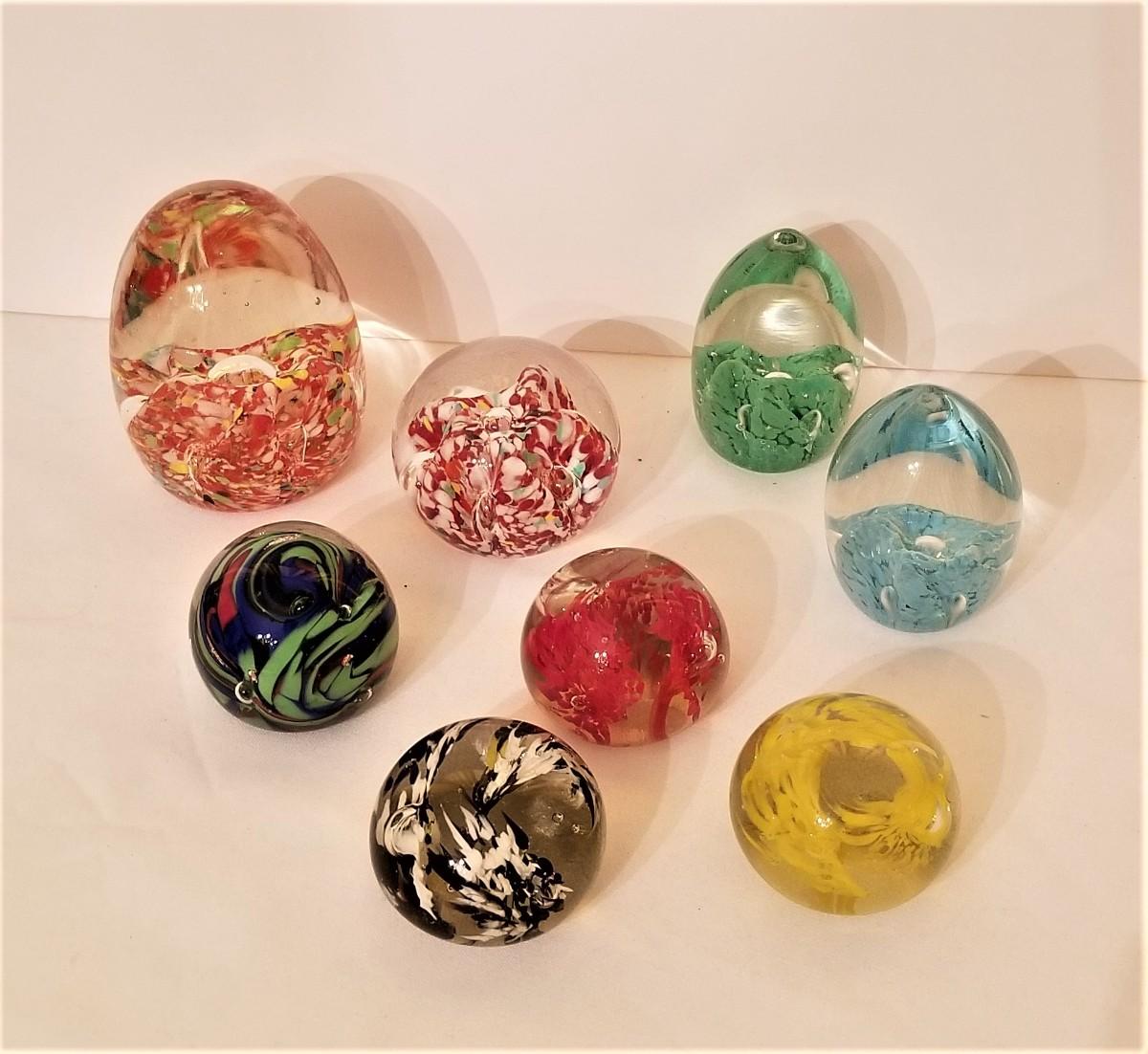 Nice lot 0f 8 studio glass paperweights (as shown). - none signed. One has a "Japan" foil label - largest is 3.75" tall, small firing error on side.