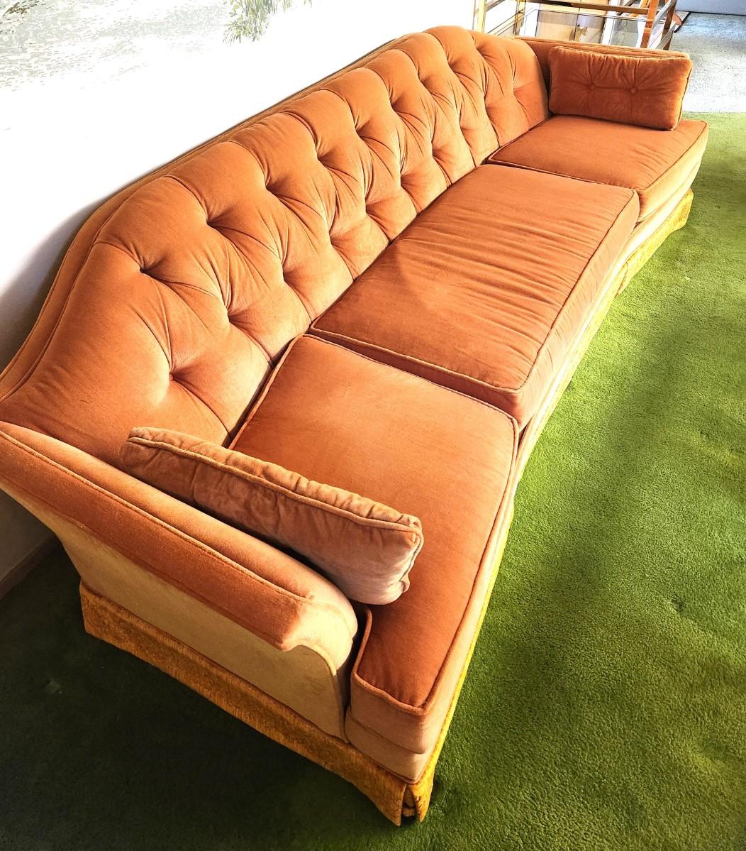 Groovy MCM unbranded (no maker noted) burnt orange velveteen sofa - original to the house - 98" across, 29" tall. Good vintage condition, no tears, etc. Clean.