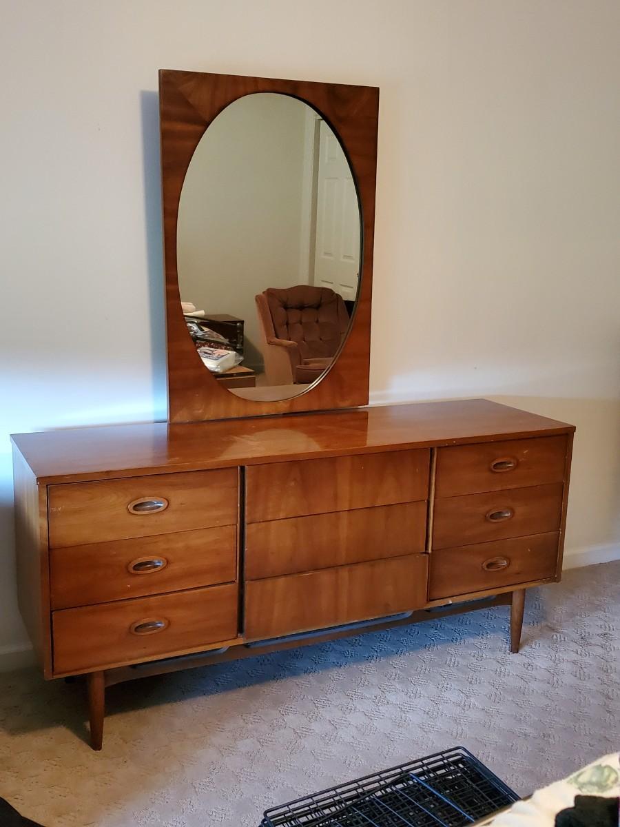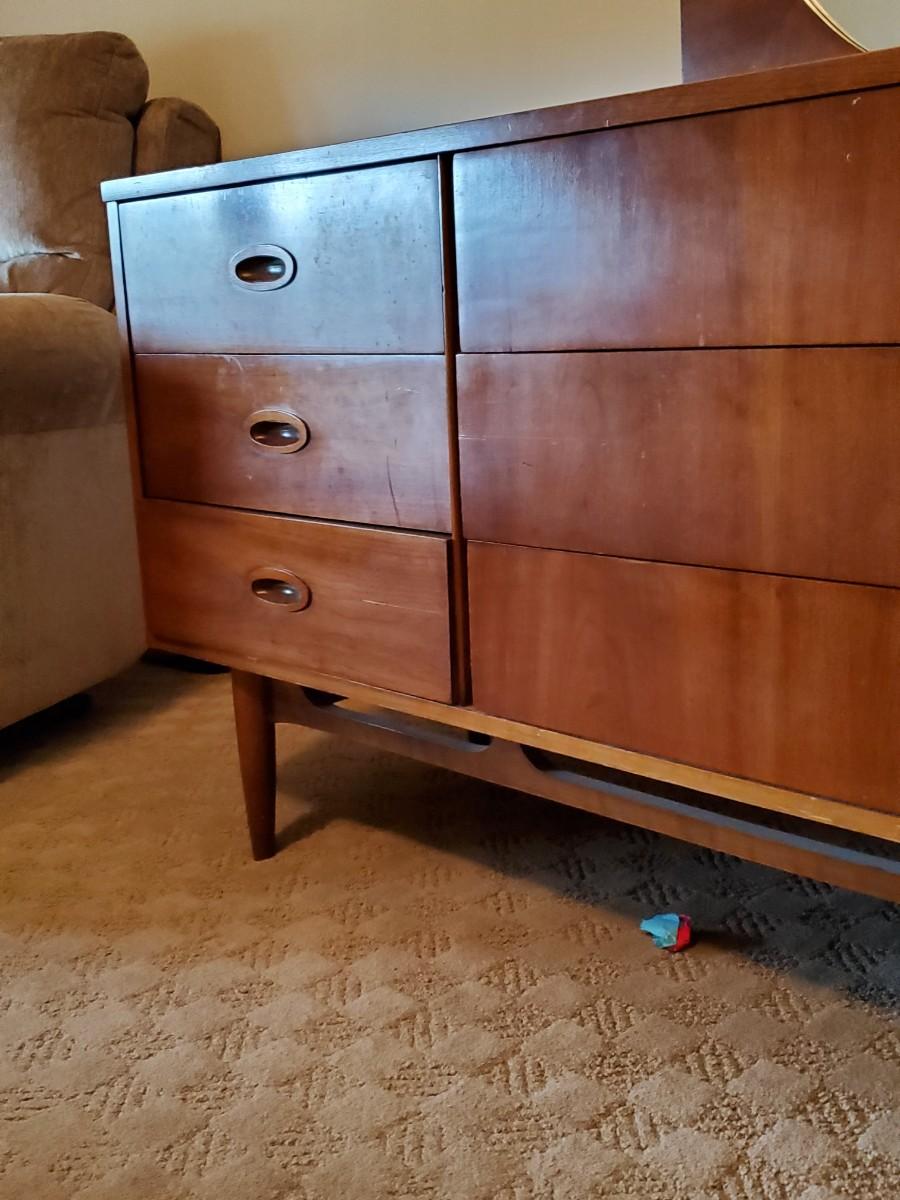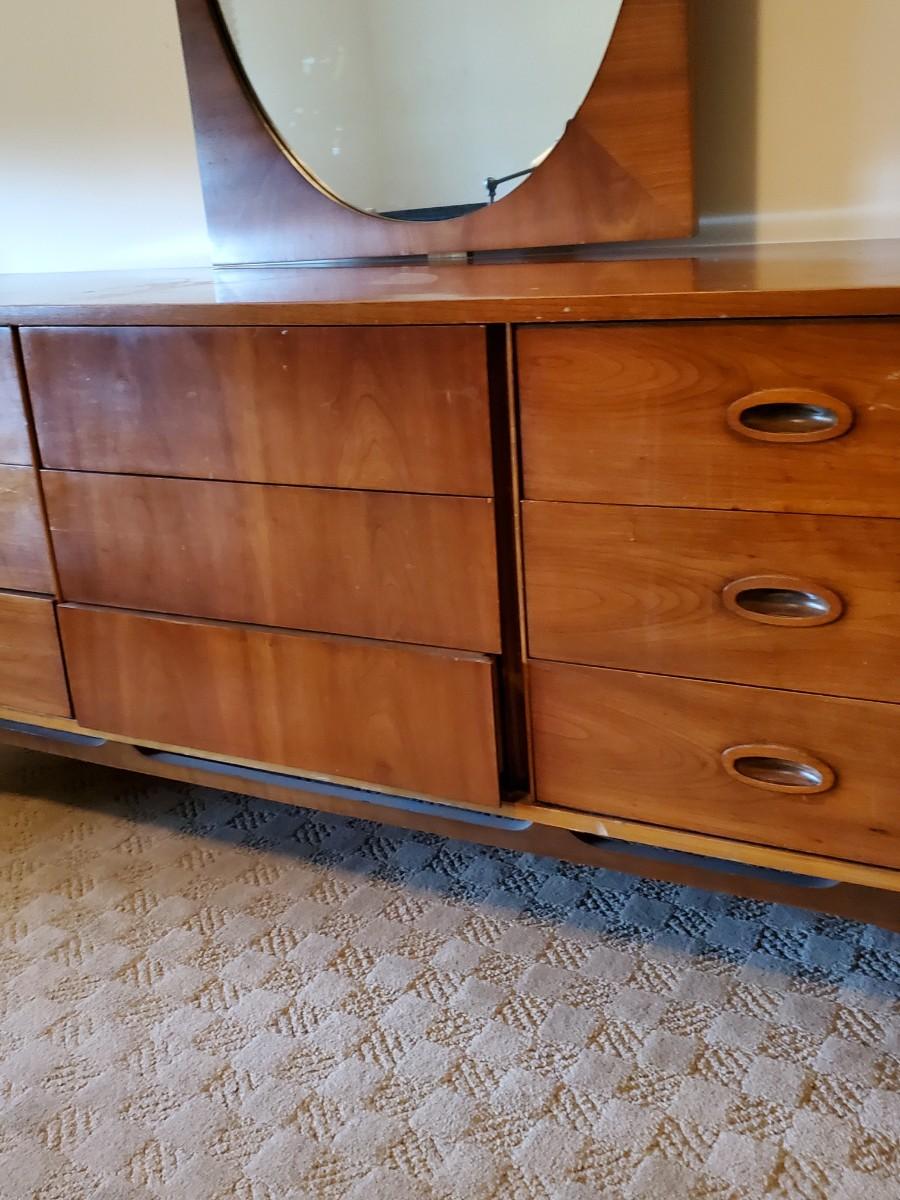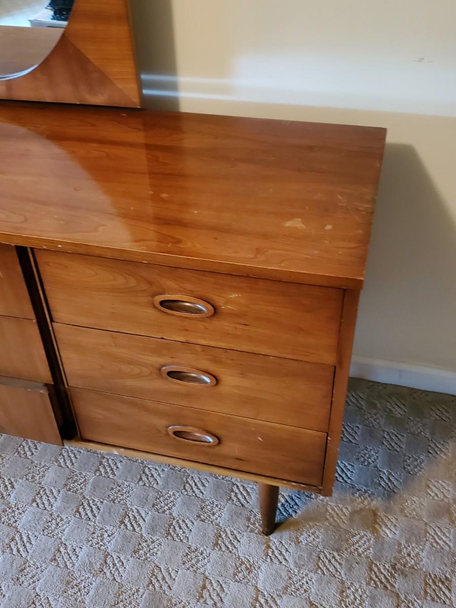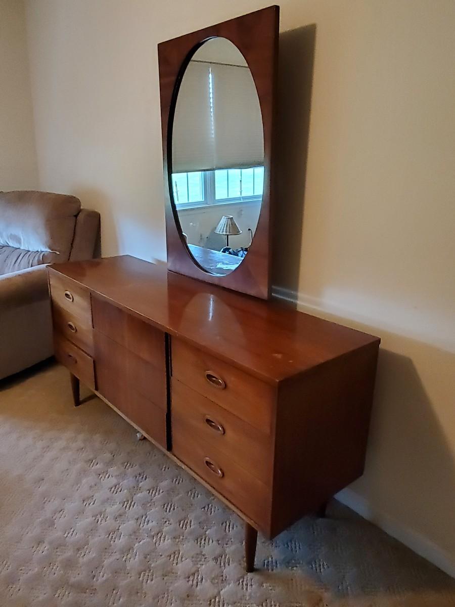 This piece is gorgeous and has great lines. It also has the wood cut-outs at the bottom. This does have some wear to the top and could be used as-is or refinished. Perfect for a dresser, or remove the mirror and use as media console. The mirror would look even better horizontal mounted on wall! Please see all pictures as they are the best representation of the items. The pictures show condition, measurements if taken, and what is included in the lot. Due to the large amount that we photograph and the time frame, we are not always able to take measurements. All items unless noted, are pre-owned and have been used. If you purchased furniture, you must bring help. We do not allow one person to carry large furniture out on their own. Bring help, tools and a truck for the safety of our client’s homes, and your personal safety. Any damages that result to the property including walls, and floors due to moving of the furniture will be charged to the buyer. Company policy. Thank you.