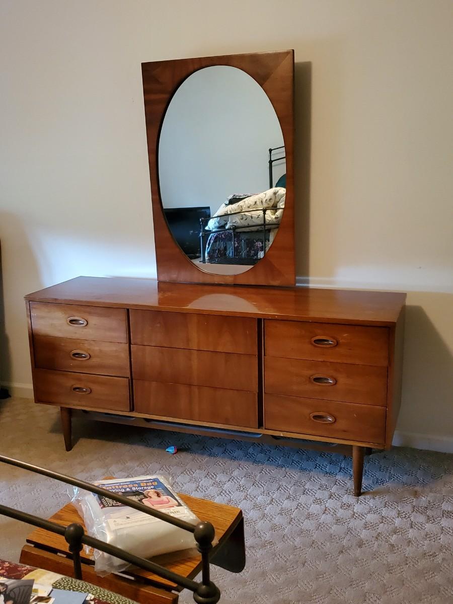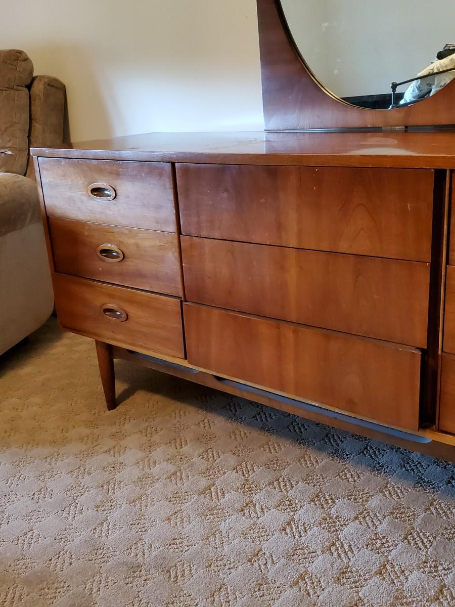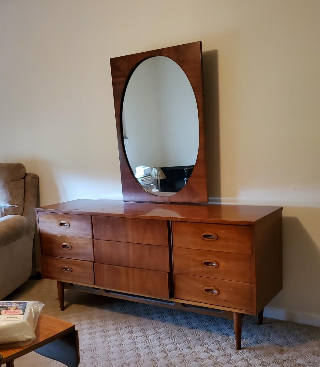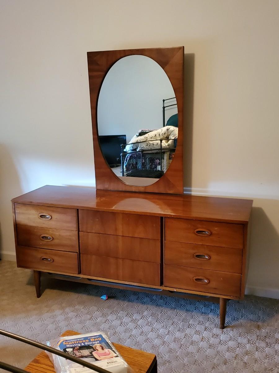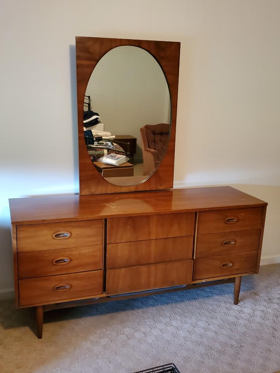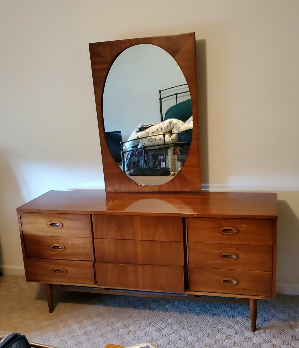 This piece is gorgeous and has great lines. It also has the wood cut-outs at the bottom. This does have some wear to the top and could be used as-is or refinished. Perfect for a dresser, or remove the mirror and use as media console. The mirror would look even better horizontal mounted on wall! Please see all pictures as they are the best representation of the items. The pictures show condition, measurements if taken, and what is included in the lot. Due to the large amount that we photograph and the time frame, we are not always able to take measurements. All items unless noted, are pre-owned and have been used. If you purchased furniture, you must bring help. We do not allow one person to carry large furniture out on their own. Bring help, tools and a truck for the safety of our client’s homes, and your personal safety. Any damages that result to the property including walls, and floors due to moving of the furniture will be charged to the buyer. Company policy. Thank you.