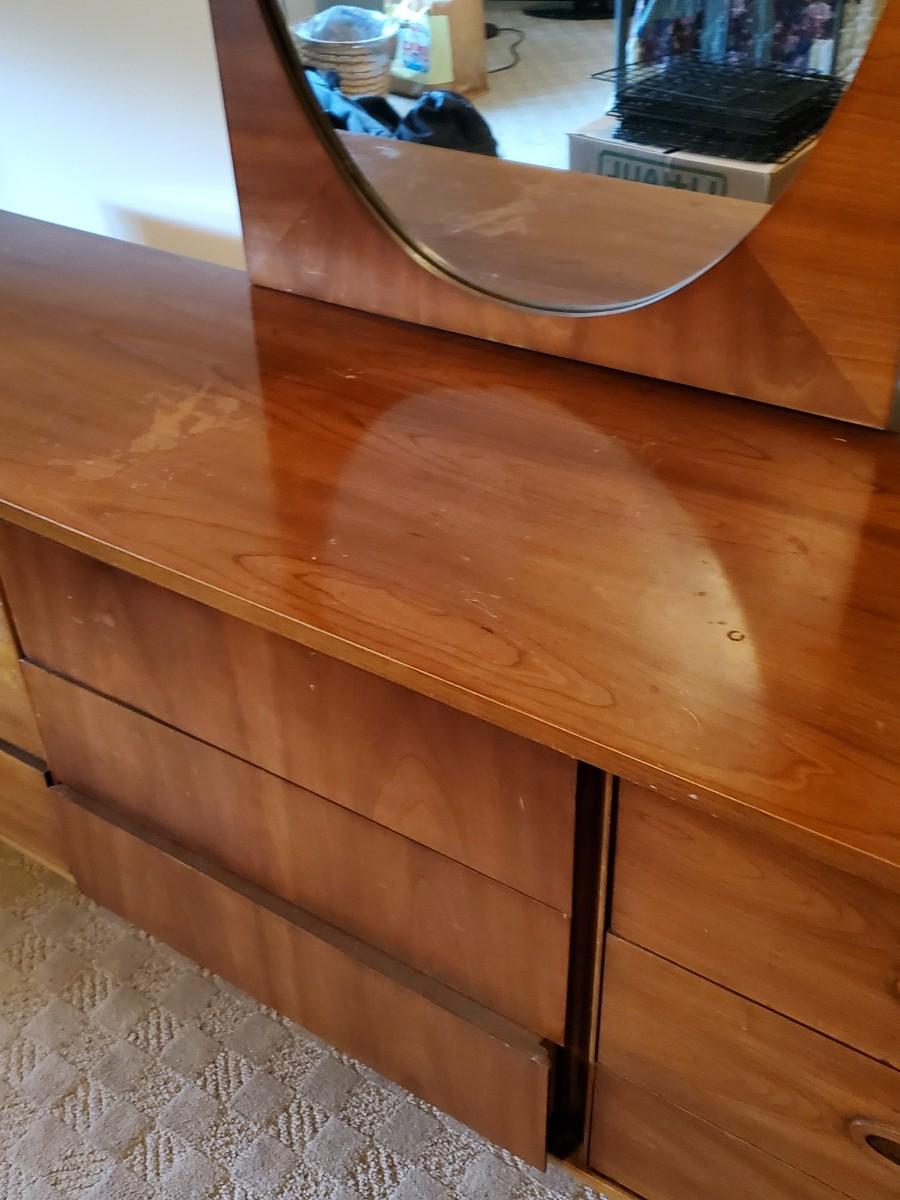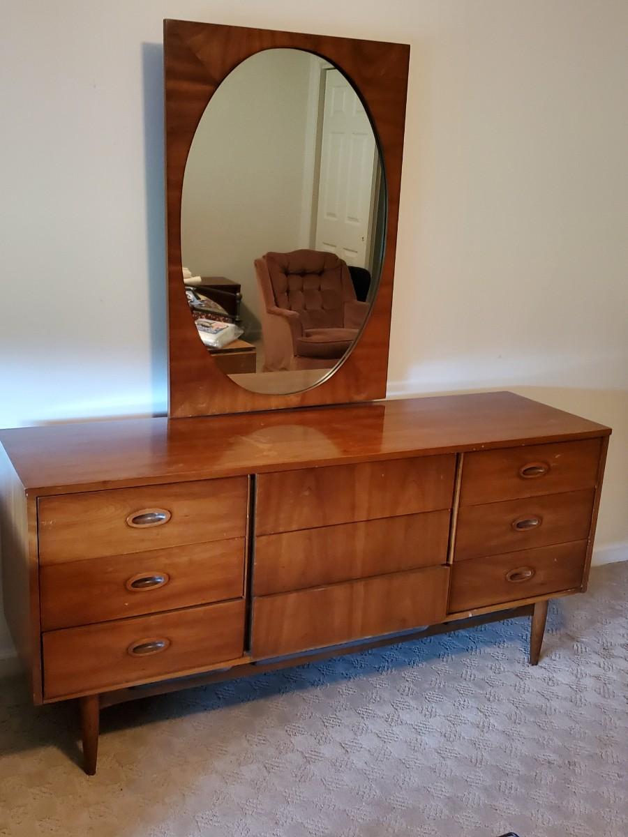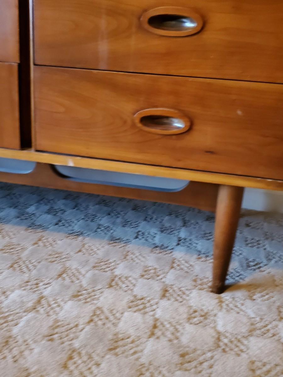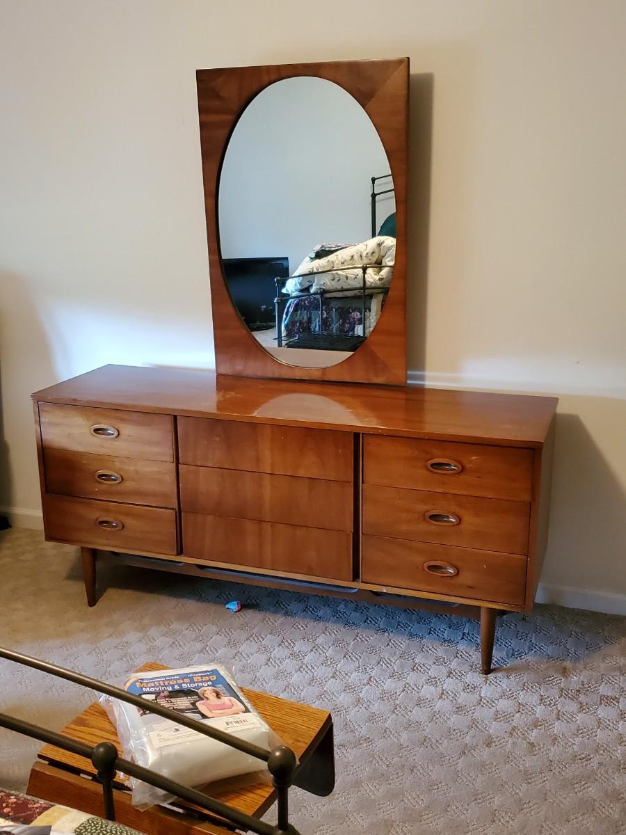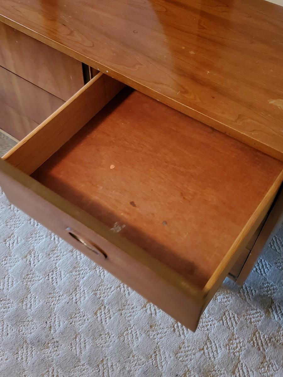 This piece is gorgeous and has great lines. It also has the wood cut-outs at the bottom. This does have some wear to the top and could be used as-is or refinished. Perfect for a dresser, or remove the mirror and use as media console. The mirror would look even better horizontal mounted on wall! Please see all pictures as they are the best representation of the items. The pictures show condition, measurements if taken, and what is included in the lot. Due to the large amount that we photograph and the time frame, we are not always able to take measurements. All items unless noted, are pre-owned and have been used. If you purchased furniture, you must bring help. We do not allow one person to carry large furniture out on their own. Bring help, tools and a truck for the safety of our client’s homes, and your personal safety. Any damages that result to the property including walls, and floors due to moving of the furniture will be charged to the buyer. Company policy. Thank you.