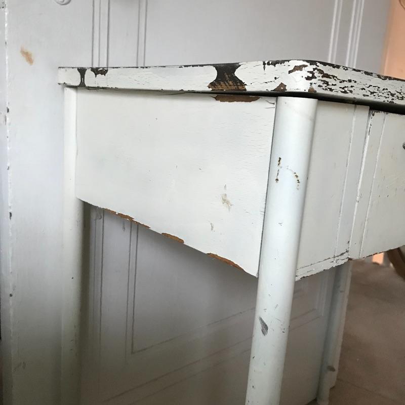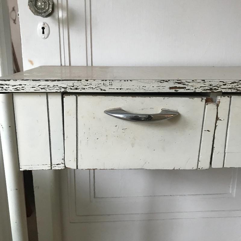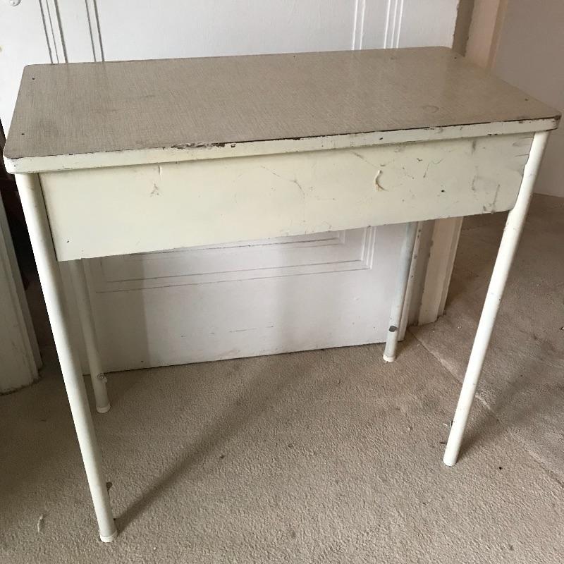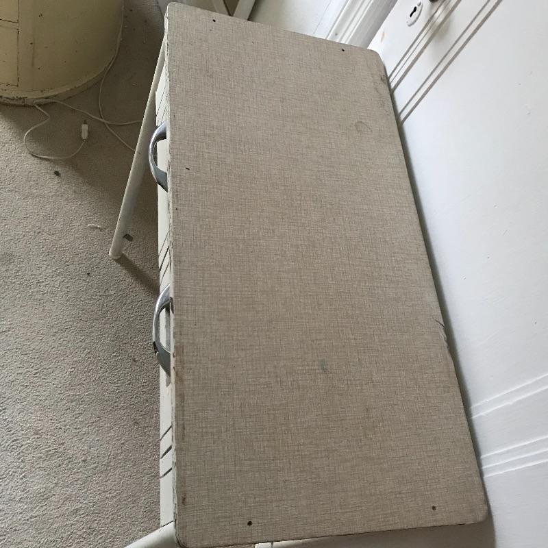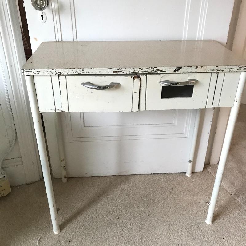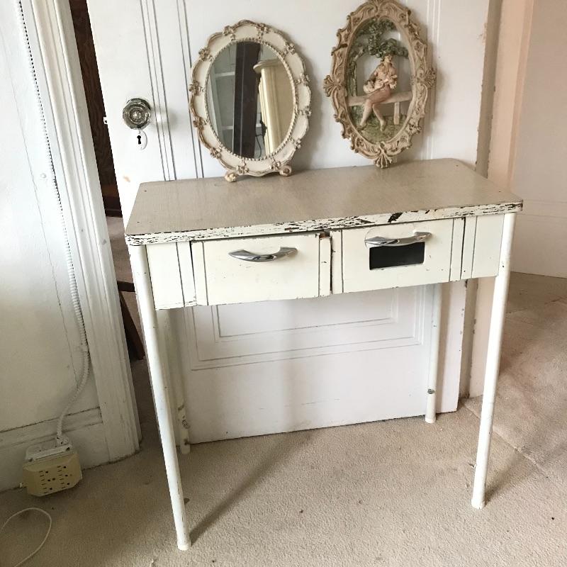 Fun MCM ivory linoleum topped wood table was used in a dressing room in its previous life. Table has attachments on its metal legs for a lower shelf, shelf not included. One drawer even has a glass window! Table measures approximately 27.5” x 13.5” x 28.25”. Table is accompanied by a vintage mirror and a presumably hand painted figuring art. The figurine wall decor stands about 14” high and has a small chip in the bottom left area, see photos. No shipping.