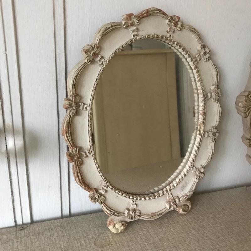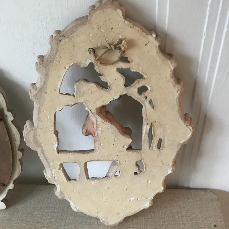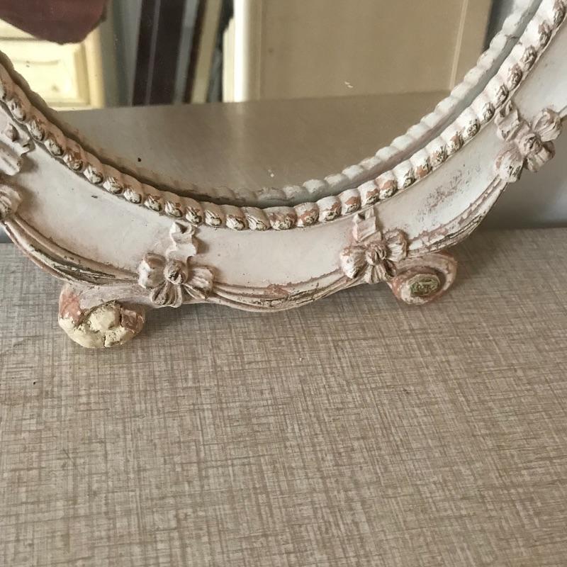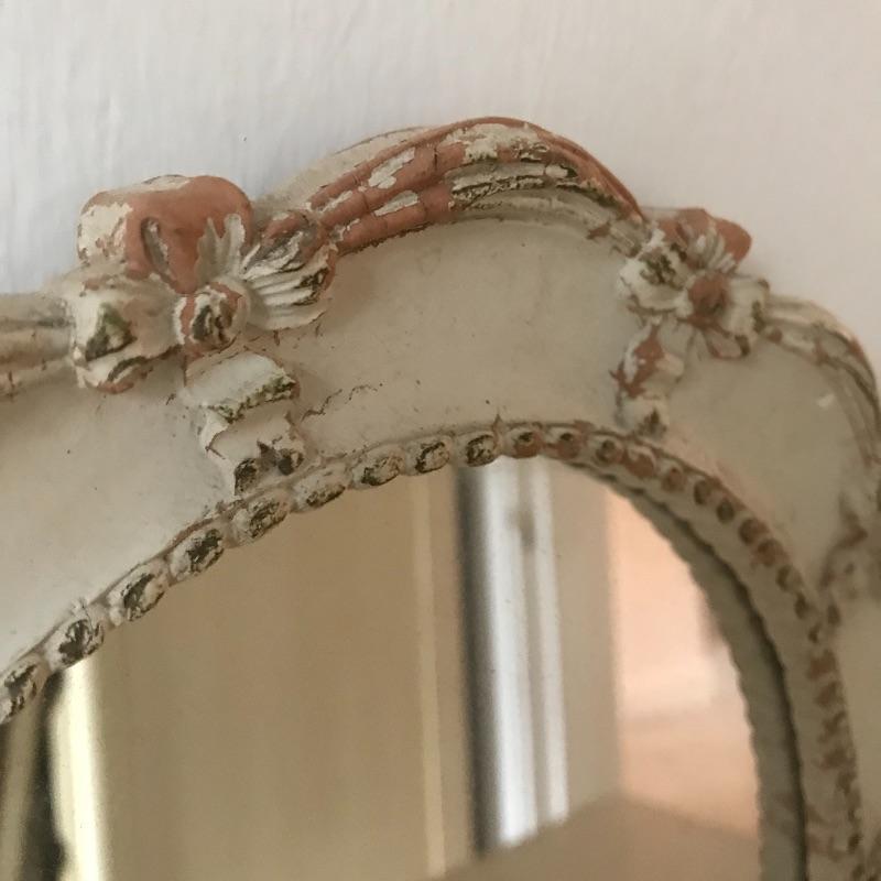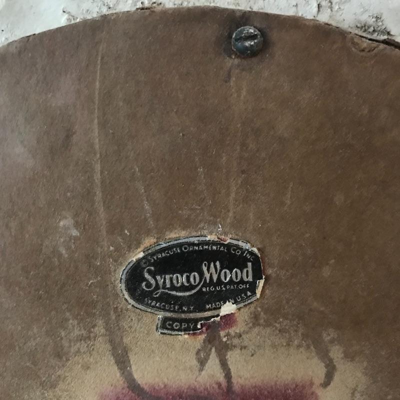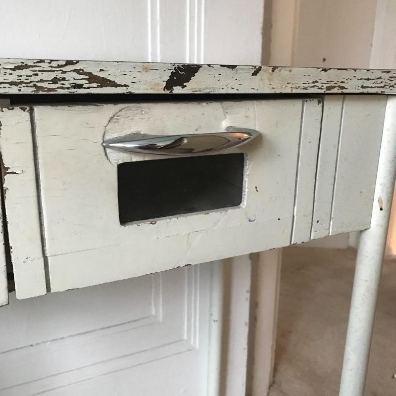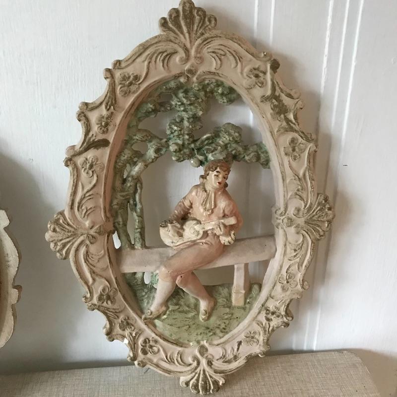 Fun MCM ivory linoleum topped wood table was used in a dressing room in its previous life. Table has attachments on its metal legs for a lower shelf, shelf not included. One drawer even has a glass window! Table measures approximately 27.5” x 13.5” x 28.25”. Table is accompanied by a vintage mirror and a presumably hand painted figuring art. The figurine wall decor stands about 14” high and has a small chip in the bottom left area, see photos. No shipping.
