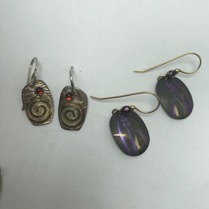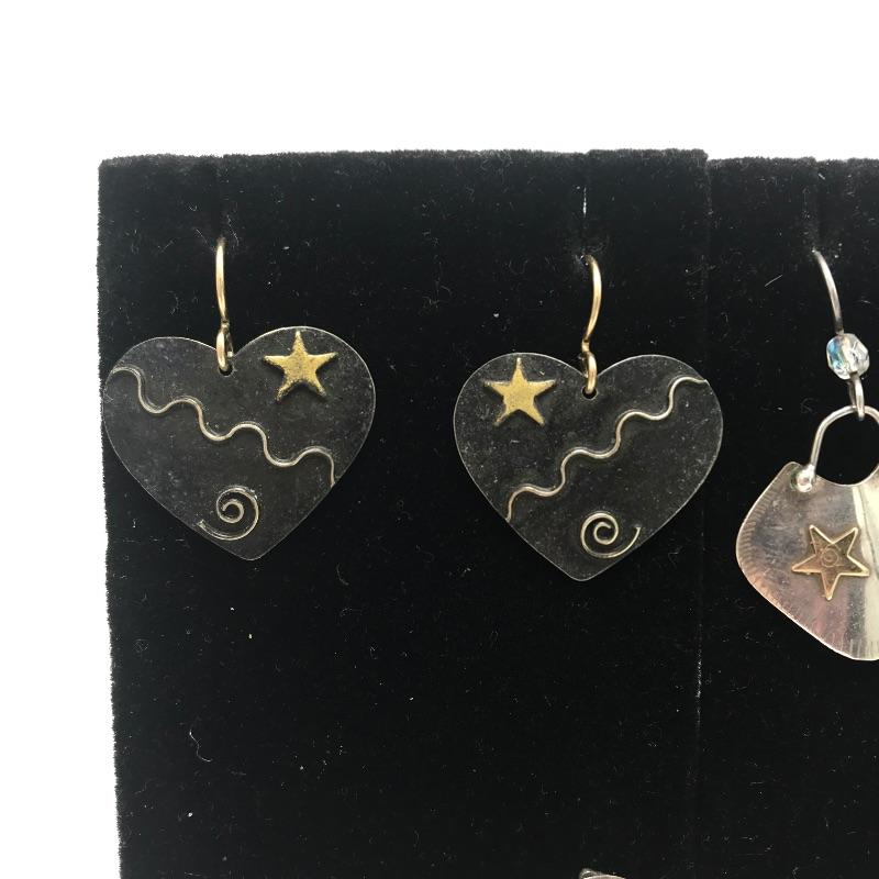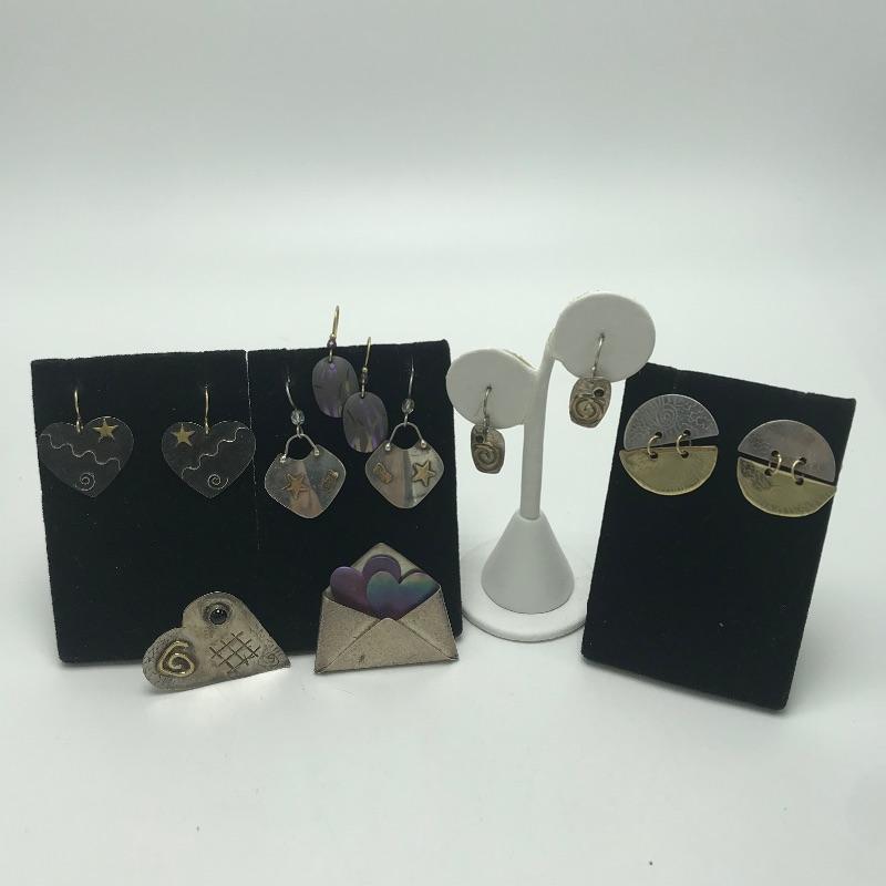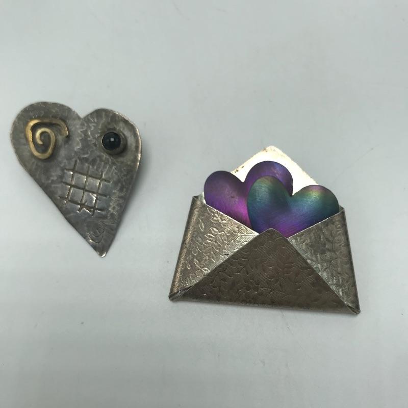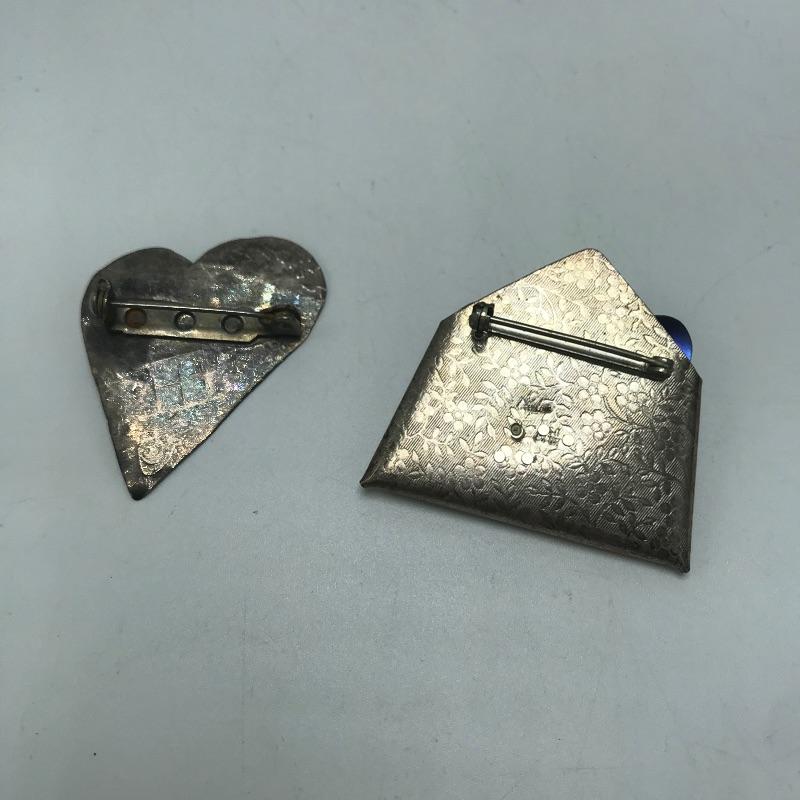 Unique and one of a kind metal art you can wear. Five pairs of earrings for pierced ears and two brooches. The heart in envelope brooch has a partial Sterling mark, other pieces’ markings are noted in photos.