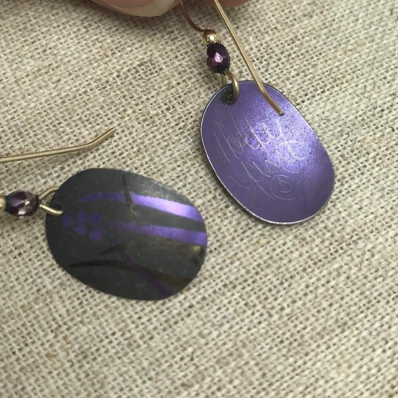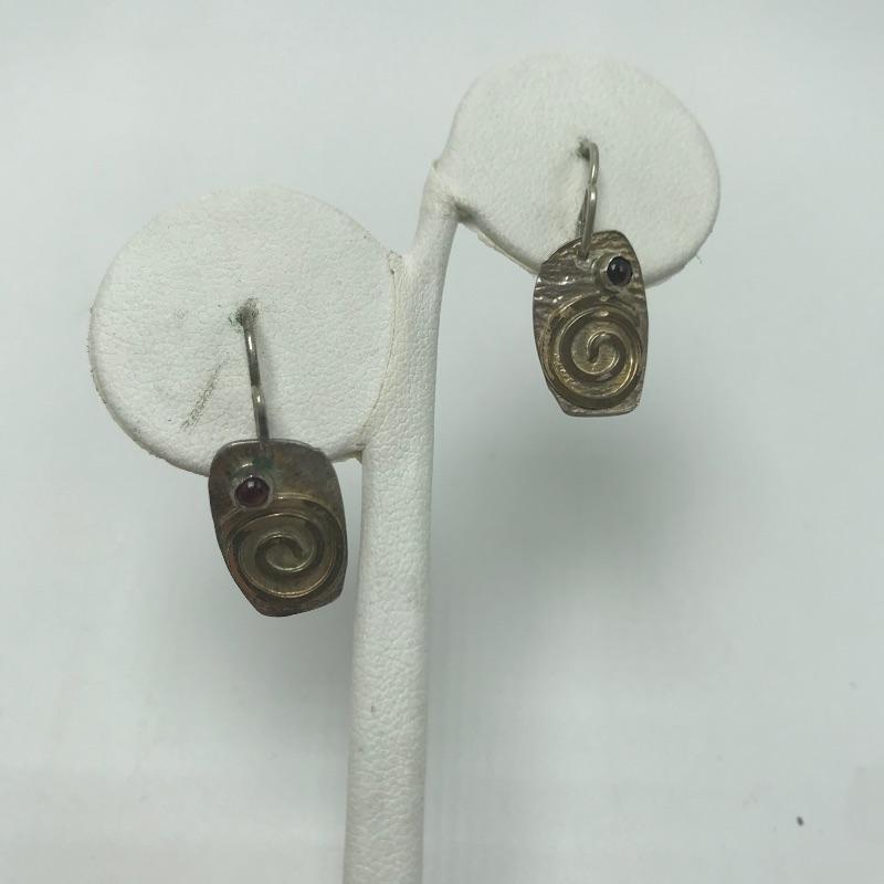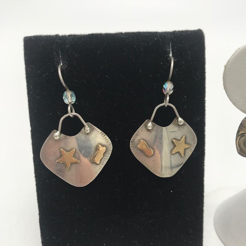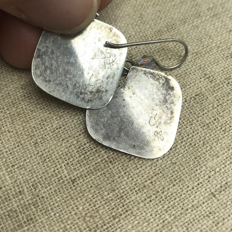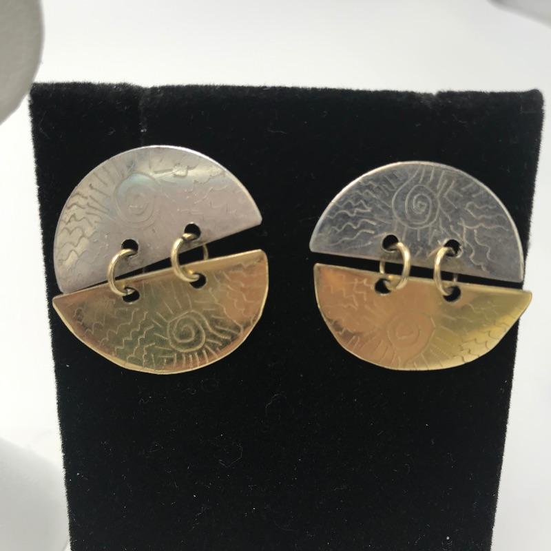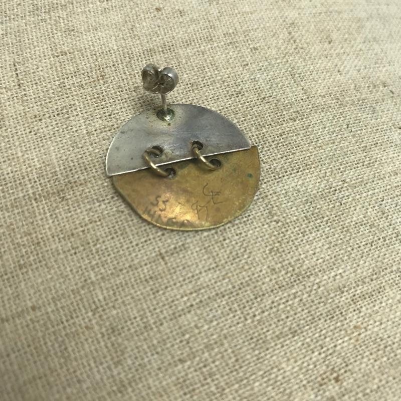 Unique and one of a kind metal art you can wear. Five pairs of earrings for pierced ears and two brooches. The heart in envelope brooch has a partial Sterling mark, other pieces’ markings are noted in photos.