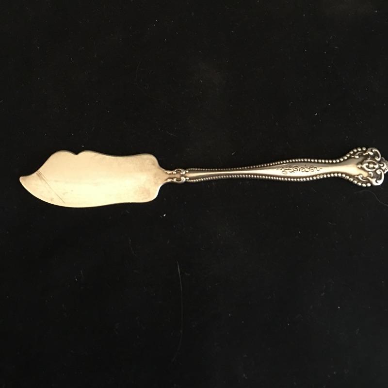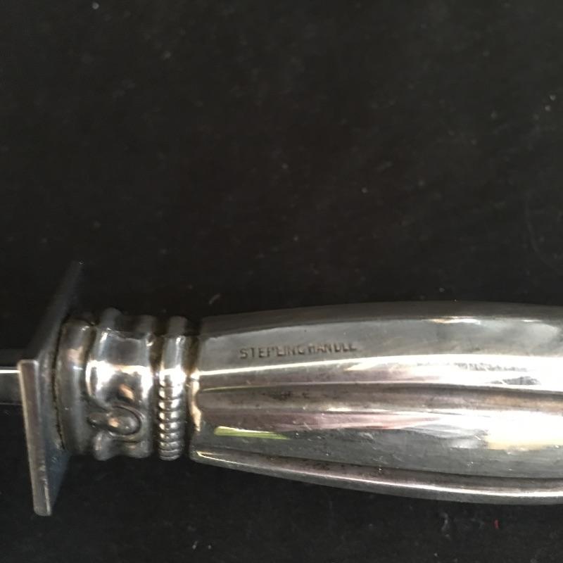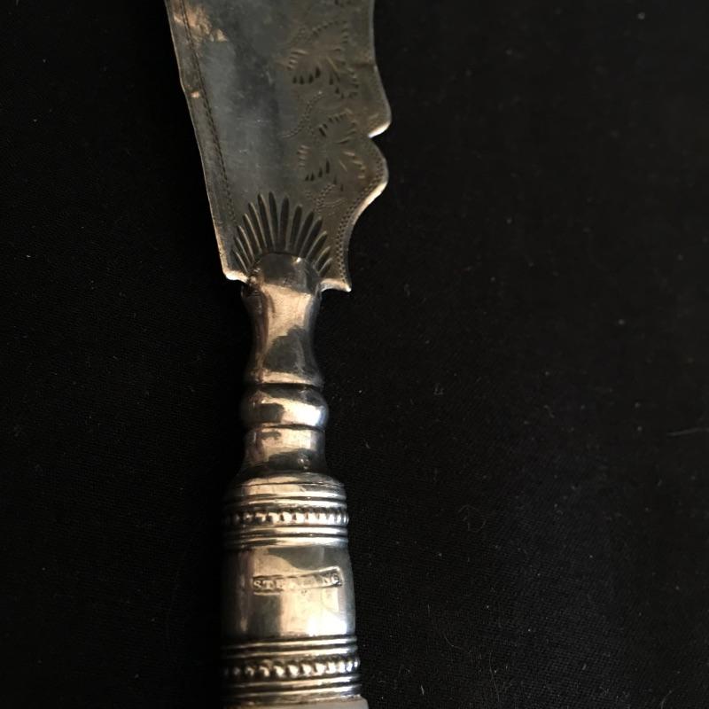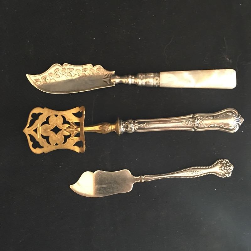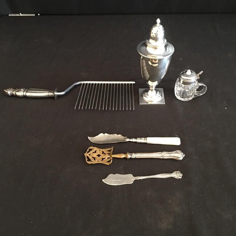 Sterling service pieces. These include a tall salt/pepper shaker(marked sterling), a butter knife(marked sterling). a mother of pearl handled knife engraved with 1787 Wilder Webb on back (marked sterling), a glass and sterling mustard jar, an angel food cake server (marked sterling handle) and a gold and silver asparagus server. Some great high class pieces here for your next dinner party. Shipping available. Starting price is near melt value.