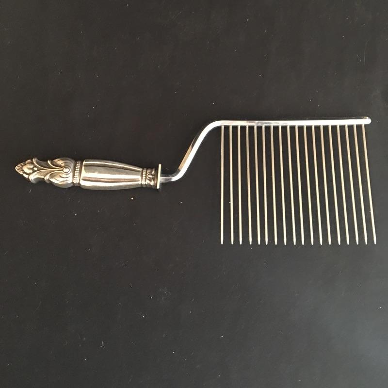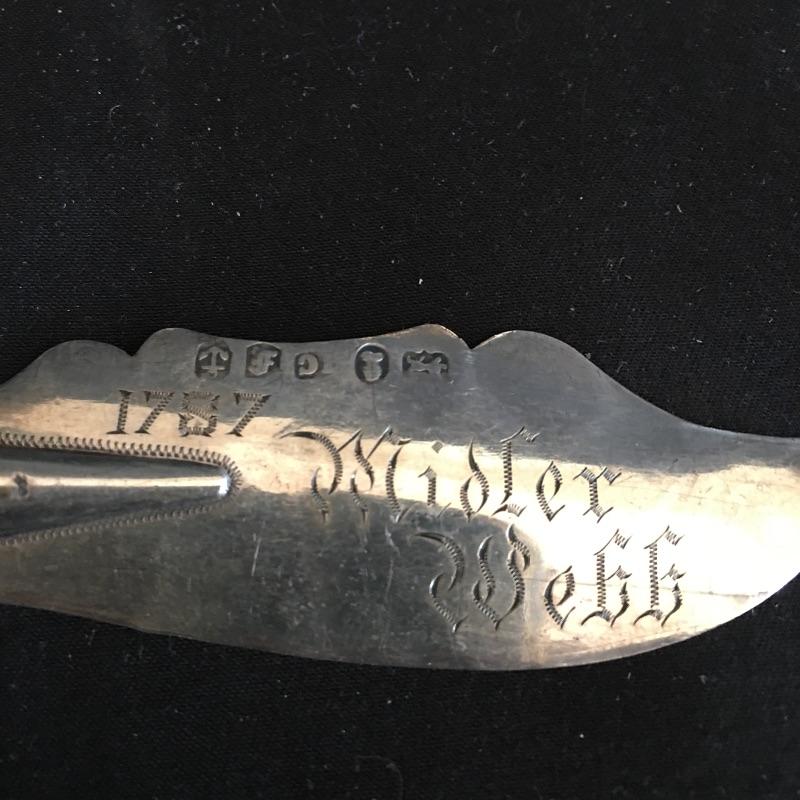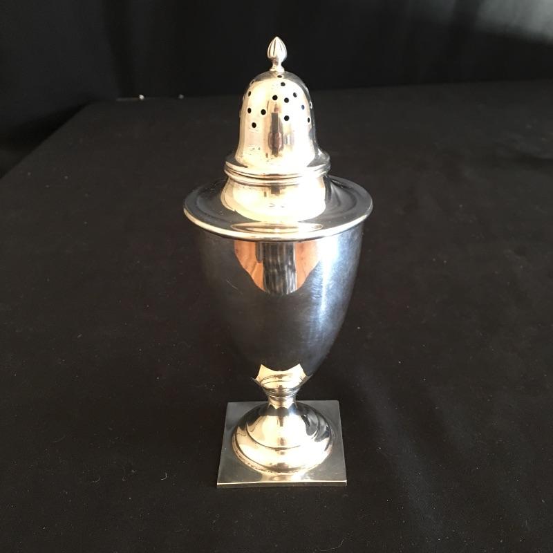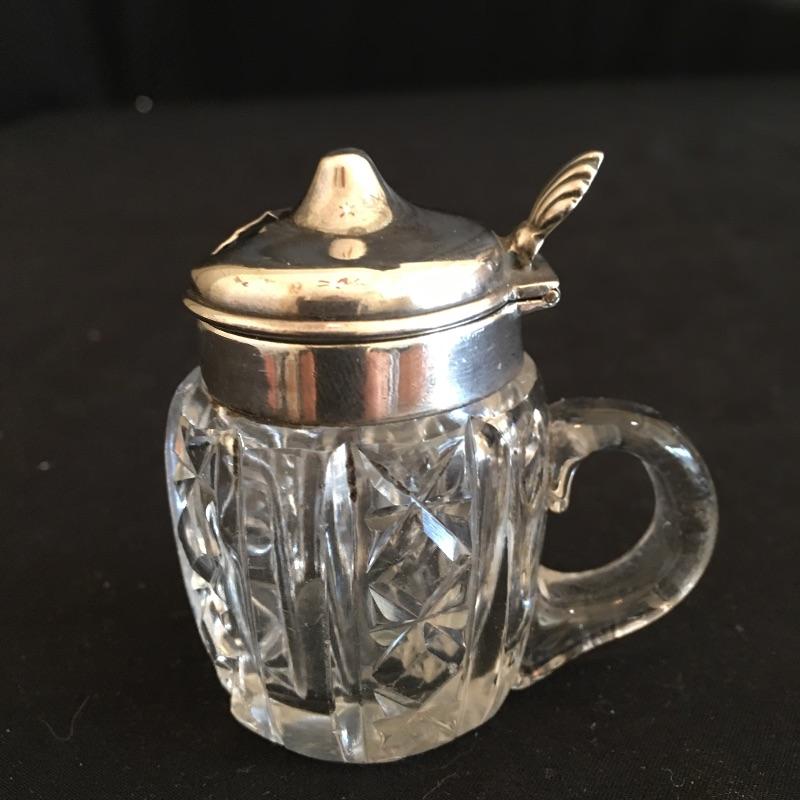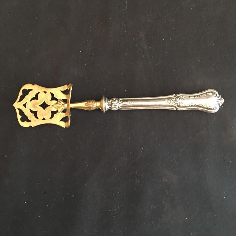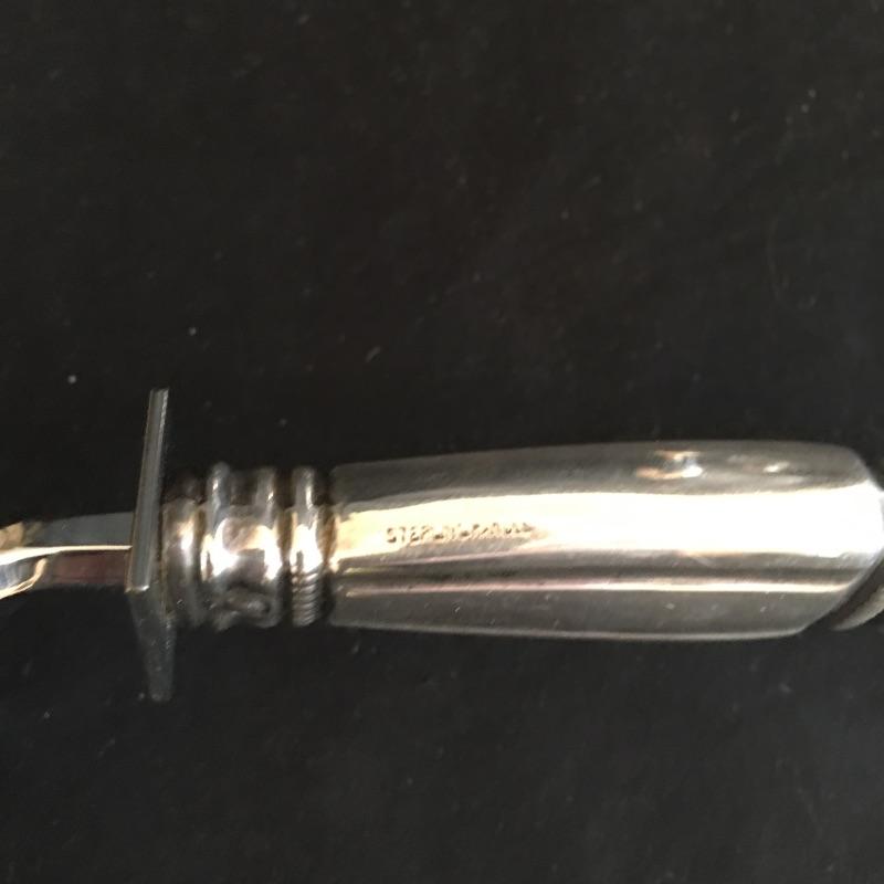 Sterling service pieces. These include a tall salt/pepper shaker(marked sterling), a butter knife(marked sterling). a mother of pearl handled knife engraved with 1787 Wilder Webb on back (marked sterling), a glass and sterling mustard jar, an angel food cake server (marked sterling handle) and a gold and silver asparagus server. Some great high class pieces here for your next dinner party. Shipping available. Starting price is near melt value.