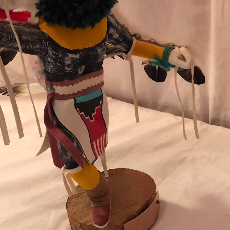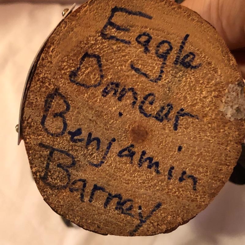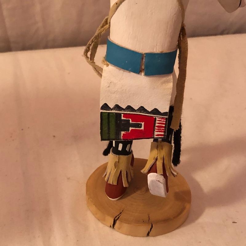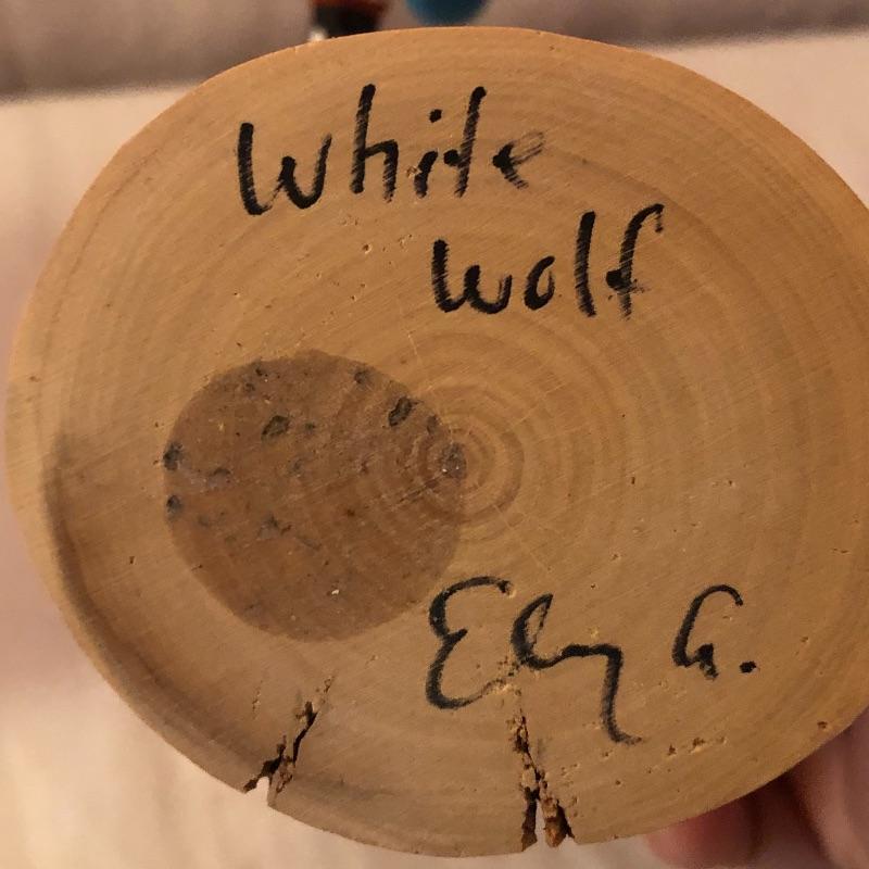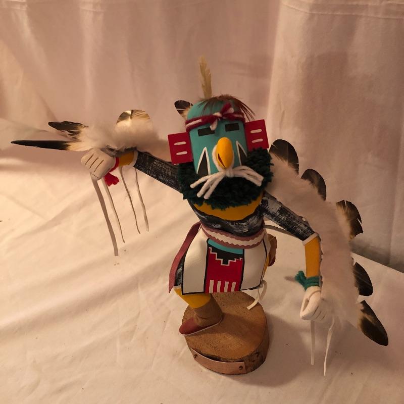 This lot includes two Kachina dolls-one “Eagle Dancer” and the other “White Wolf.” The Eagle Dancer is approximately 12” high, appears to be made of wood and is signed by Benjamin Barnay. The plaque is removable. The White Wolf measures 10” high, appears to be made of wood and is signed. Note the arm is broken yet can be repaired. Shipping Available.