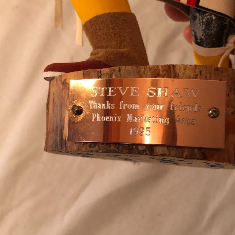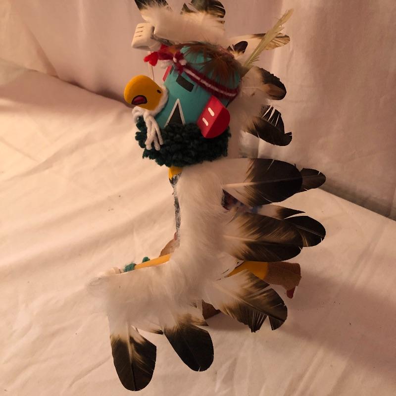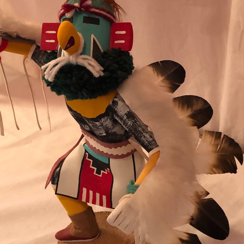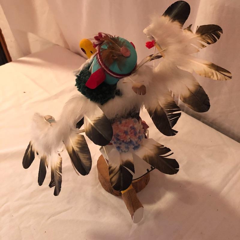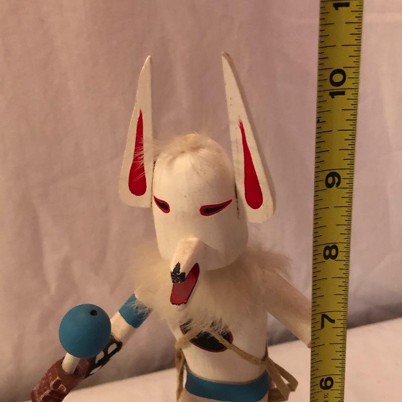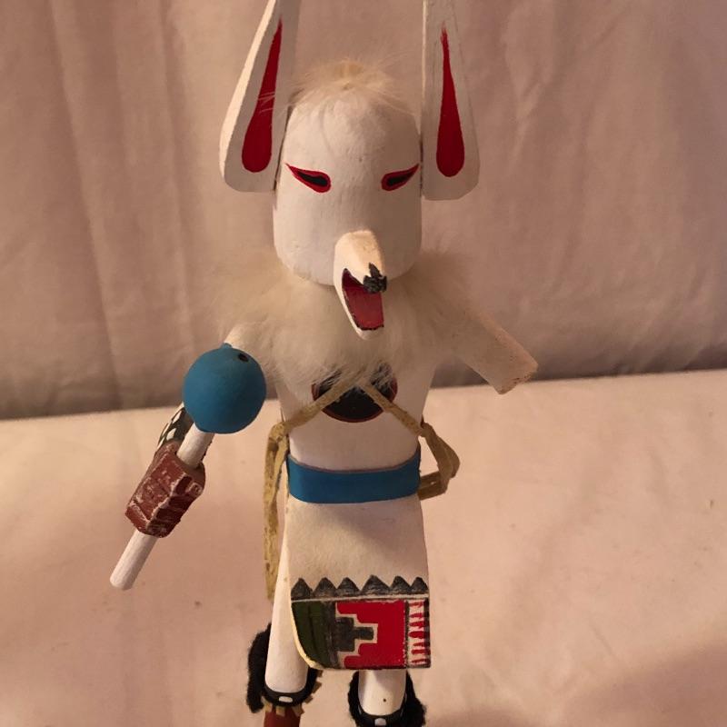 This lot includes two Kachina dolls-one “Eagle Dancer” and the other “White Wolf.” The Eagle Dancer is approximately 12” high, appears to be made of wood and is signed by Benjamin Barnay. The plaque is removable. The White Wolf measures 10” high, appears to be made of wood and is signed. Note the arm is broken yet can be repaired. Shipping Available.