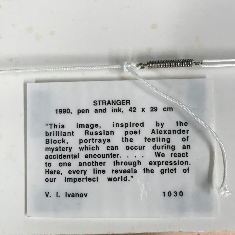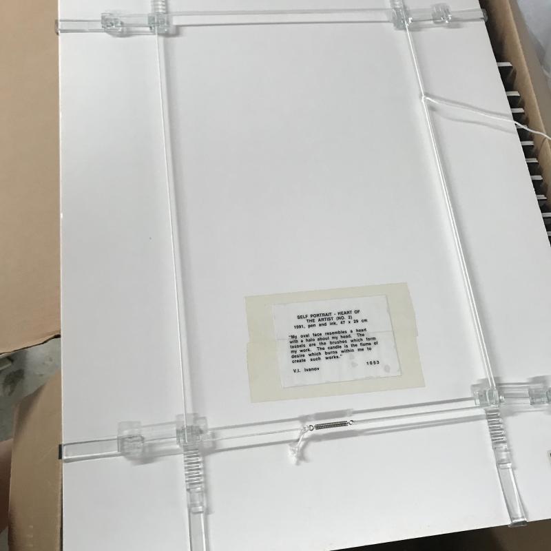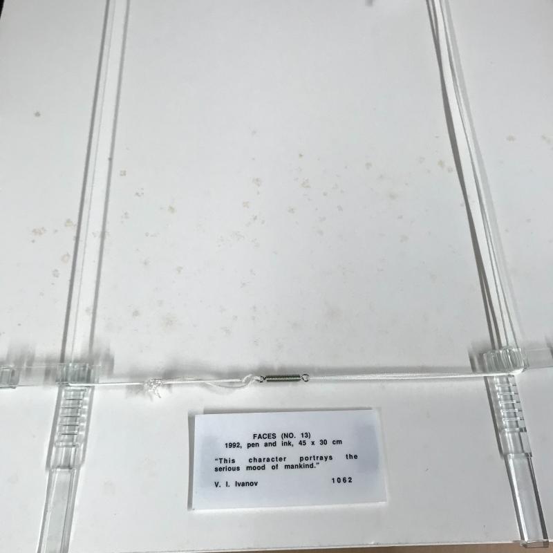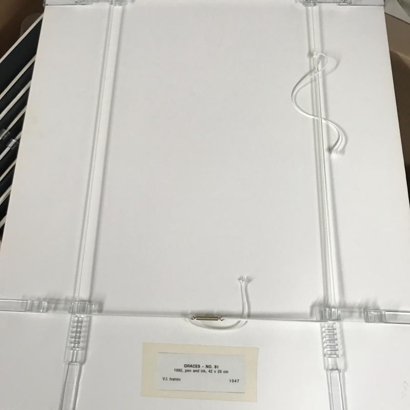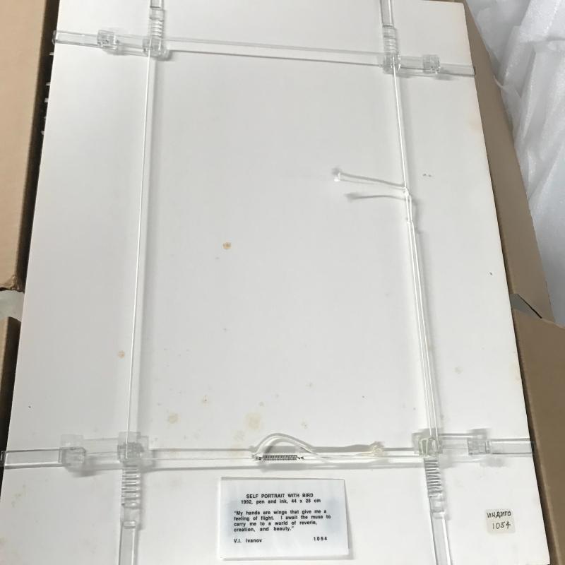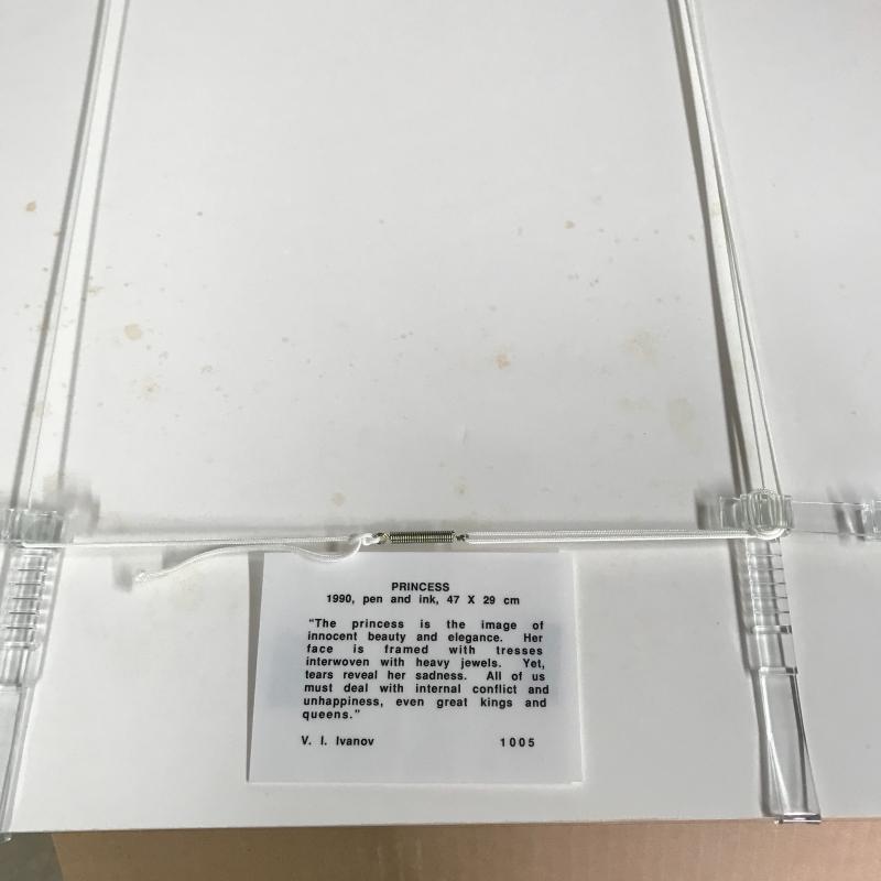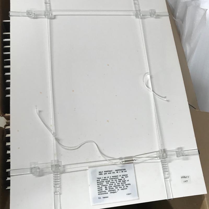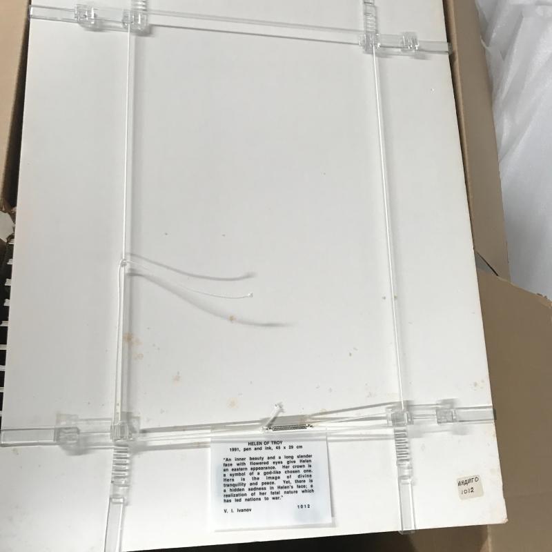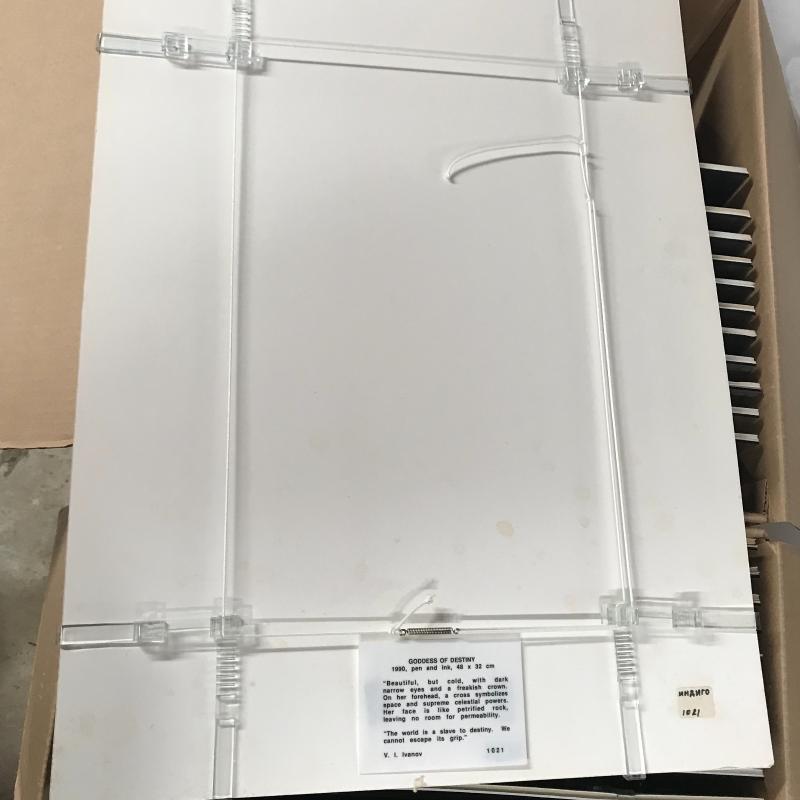 Fascinating large collection of Victor Ivanov pen and ink pieces in glass panels ready to be hung and exhibited. Some pieces appear to be originals. While there are 32 of the largest glass frames at 18” x 24”. Most all have descriptions and dimensions on a card on the back, although the adhesive is wearing off. Matting is mostly black with some brown, gray or patterned. Some binding clips have come off or broken. Some glass is chipped, but hardly noticeable. Lot also includes 2 wooden frames (black frame is 20” x 27” and blue/gray at 18” x 26”), and copies stored in photo album slips. See photos. Lots 203-206 include Victor Ivanov art. No shipping.