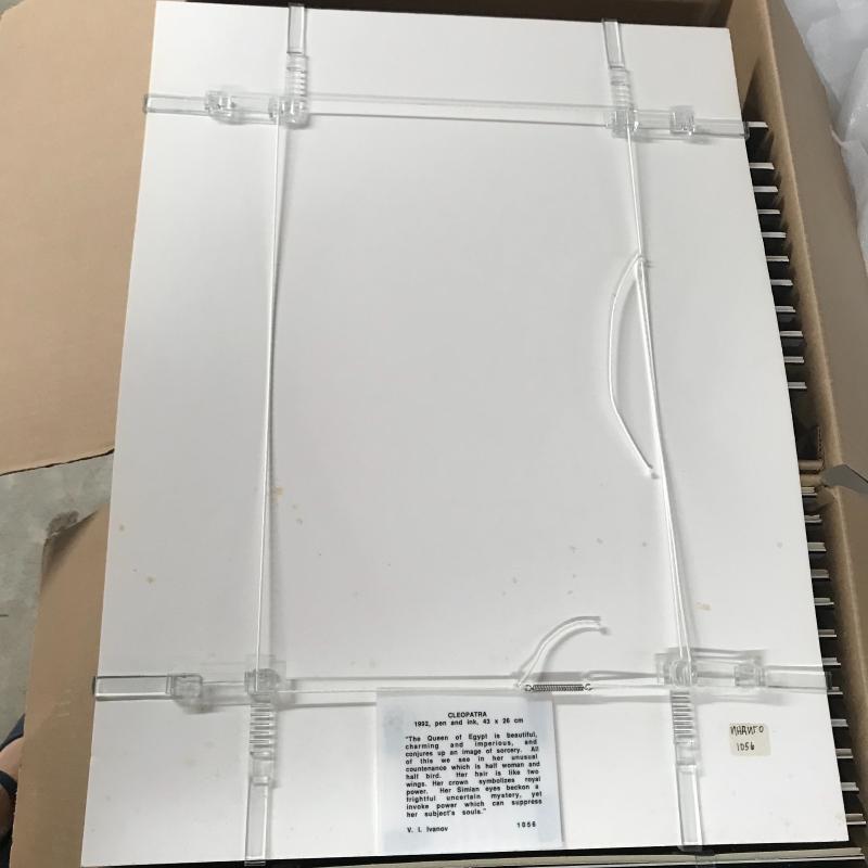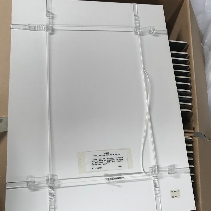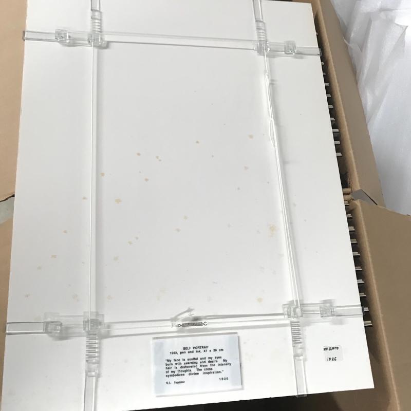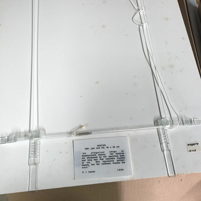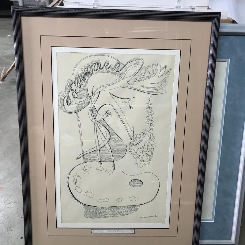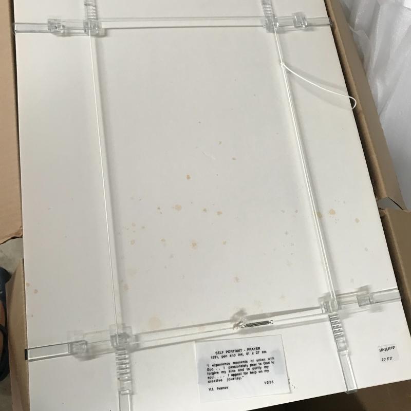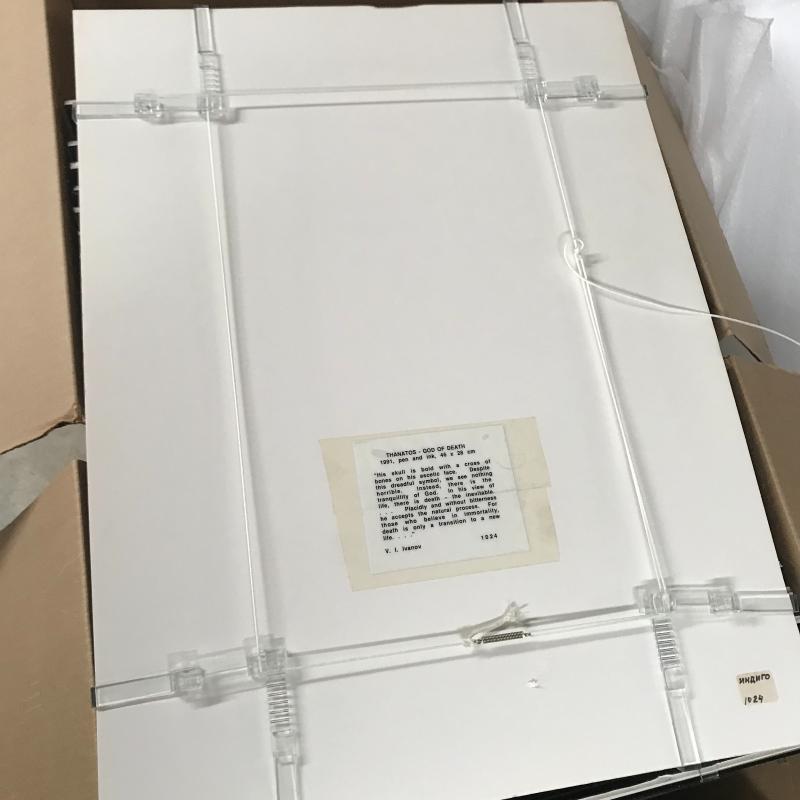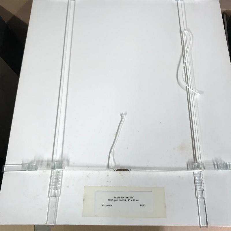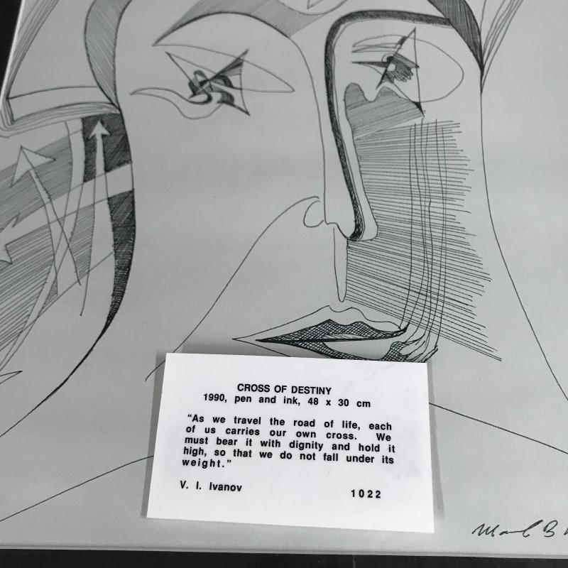 Fascinating large collection of Victor Ivanov pen and ink pieces in glass panels ready to be hung and exhibited. Some pieces appear to be originals. While there are 32 of the largest glass frames at 18” x 24”. Most all have descriptions and dimensions on a card on the back, although the adhesive is wearing off. Matting is mostly black with some brown, gray or patterned. Some binding clips have come off or broken. Some glass is chipped, but hardly noticeable. Lot also includes 2 wooden frames (black frame is 20” x 27” and blue/gray at 18” x 26”), and copies stored in photo album slips. See photos. Lots 203-206 include Victor Ivanov art. No shipping.
