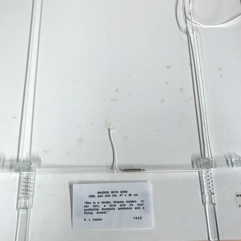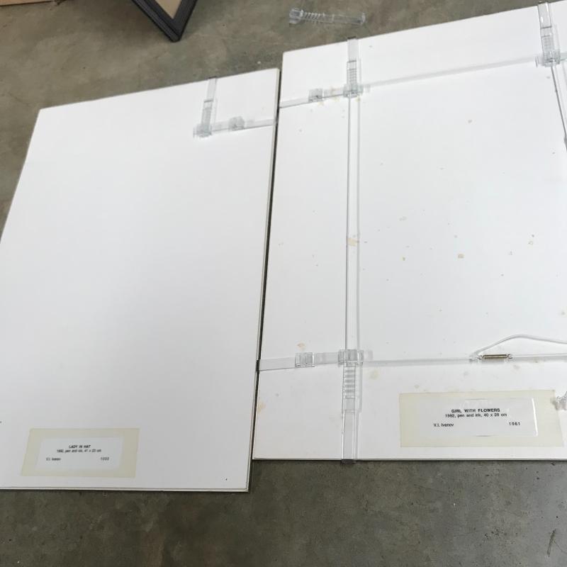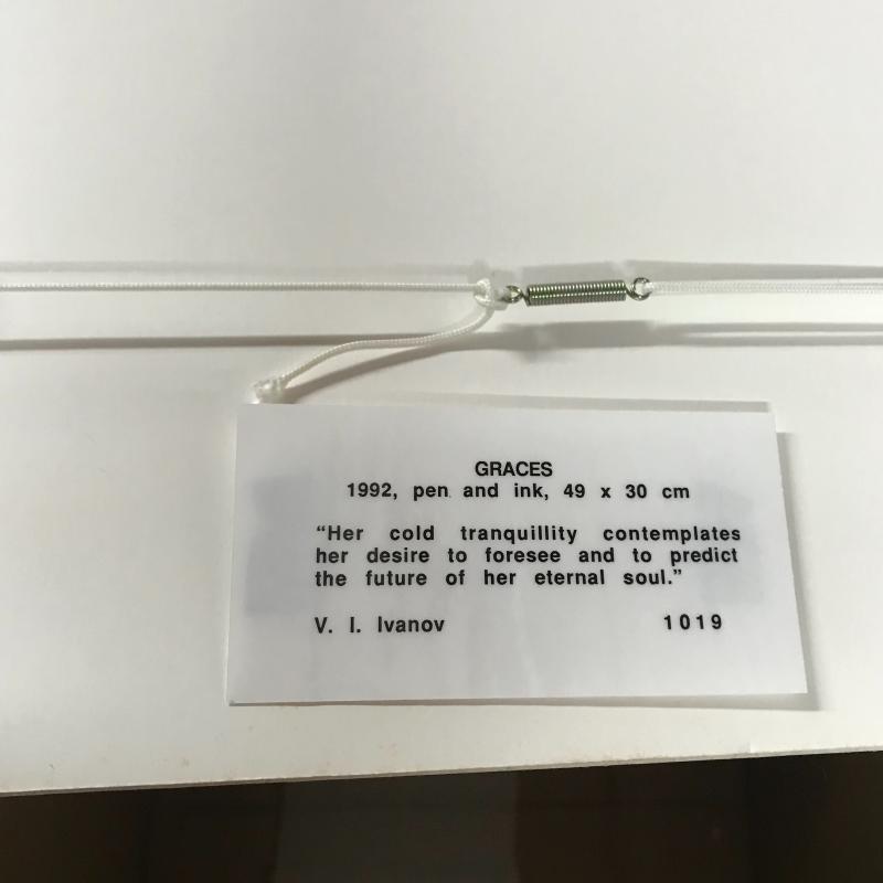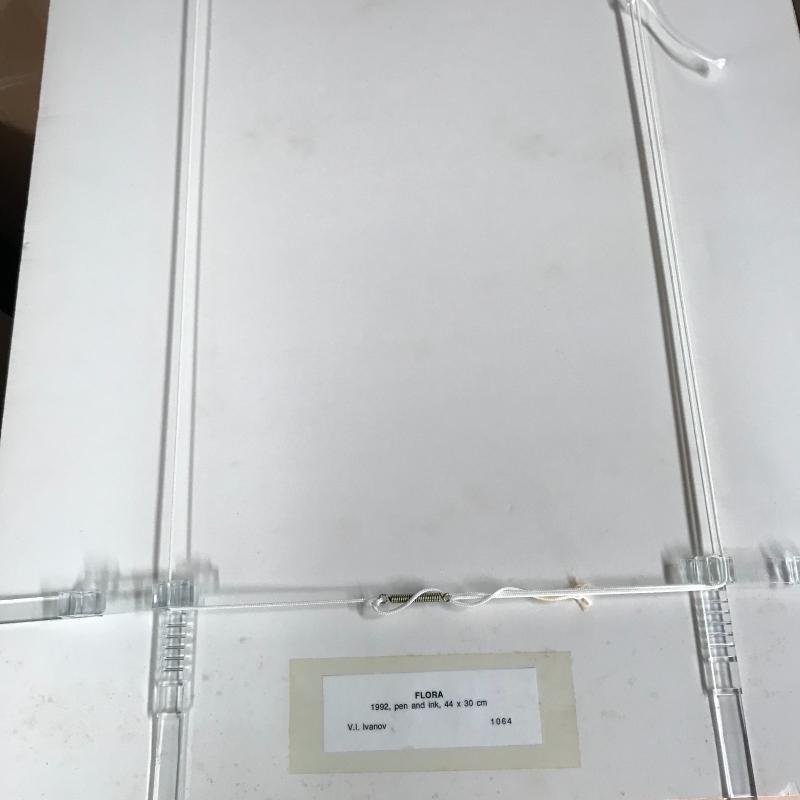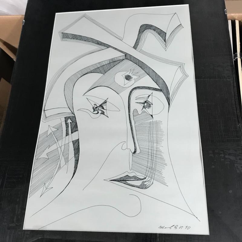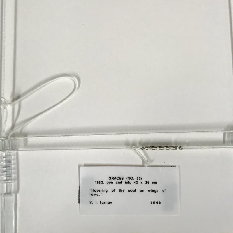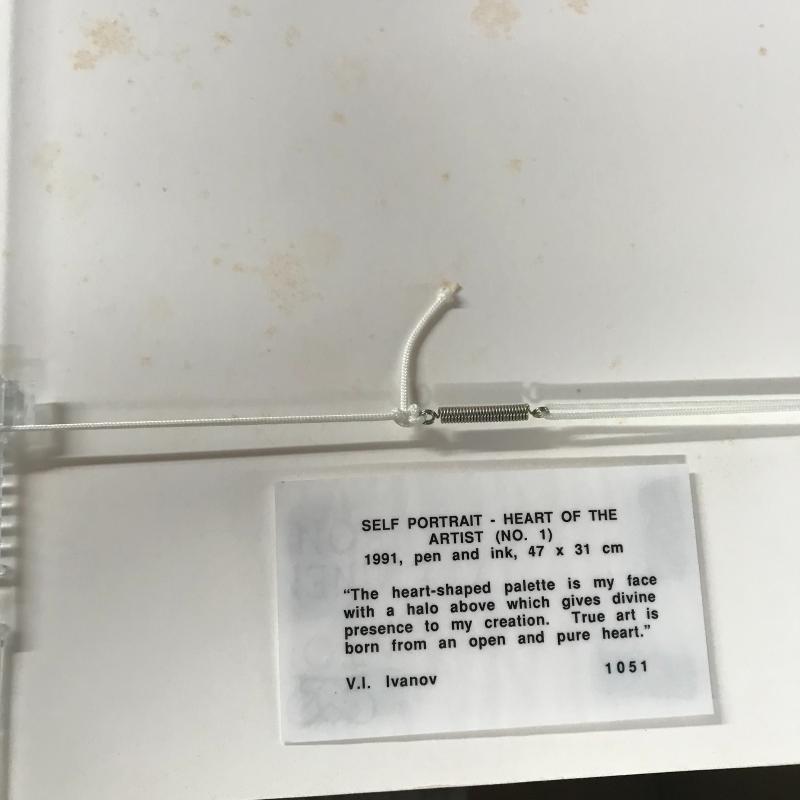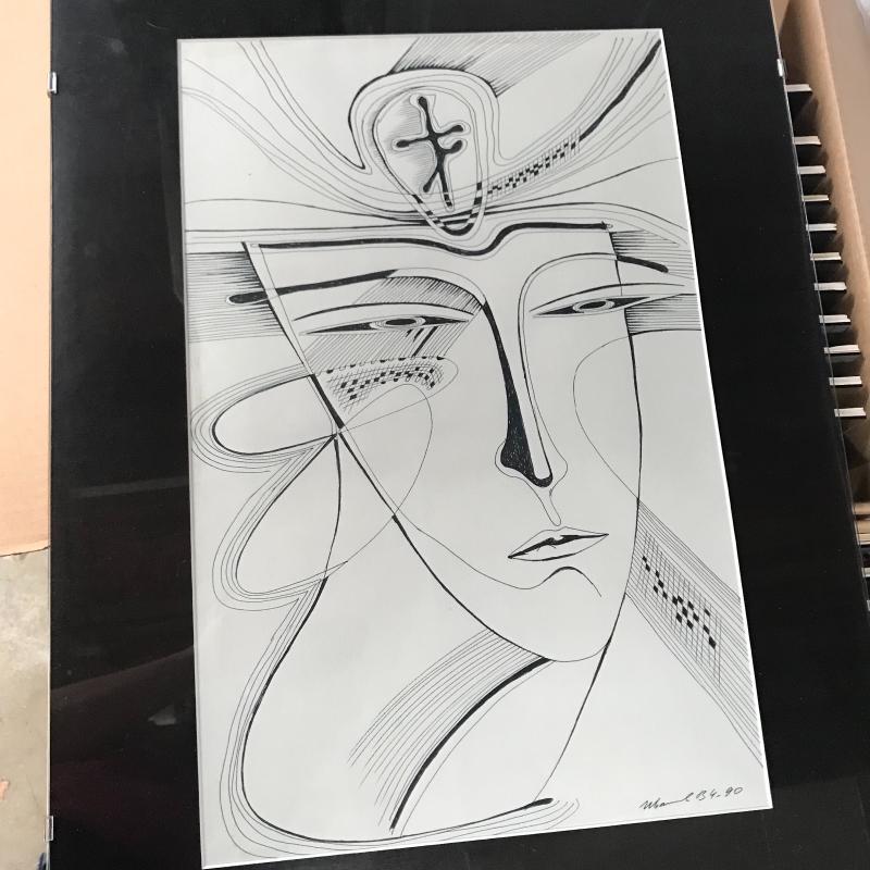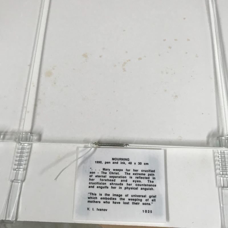 Fascinating large collection of Victor Ivanov pen and ink pieces in glass panels ready to be hung and exhibited. Some pieces appear to be originals. While there are 32 of the largest glass frames at 18” x 24”. Most all have descriptions and dimensions on a card on the back, although the adhesive is wearing off. Matting is mostly black with some brown, gray or patterned. Some binding clips have come off or broken. Some glass is chipped, but hardly noticeable. Lot also includes 2 wooden frames (black frame is 20” x 27” and blue/gray at 18” x 26”), and copies stored in photo album slips. See photos. Lots 203-206 include Victor Ivanov art. No shipping.