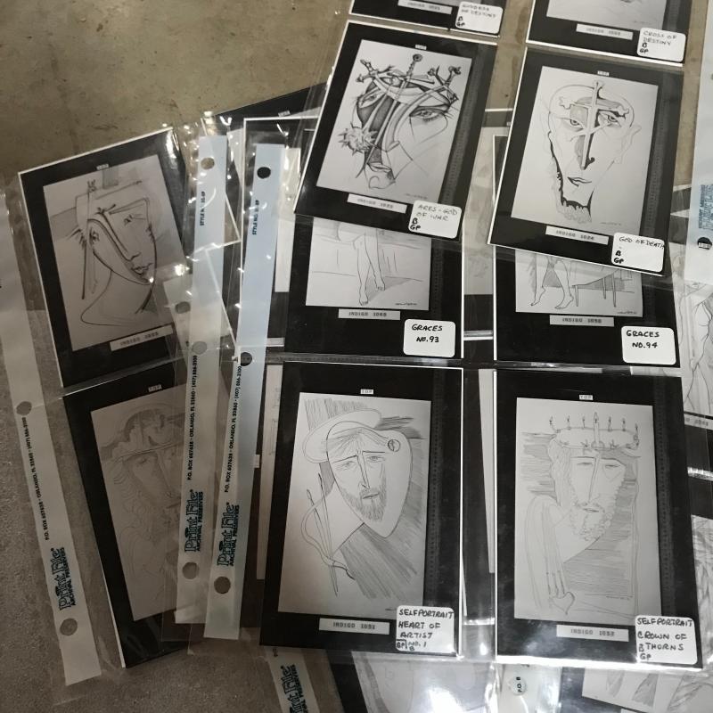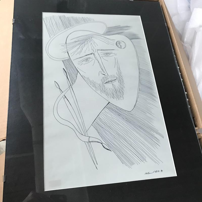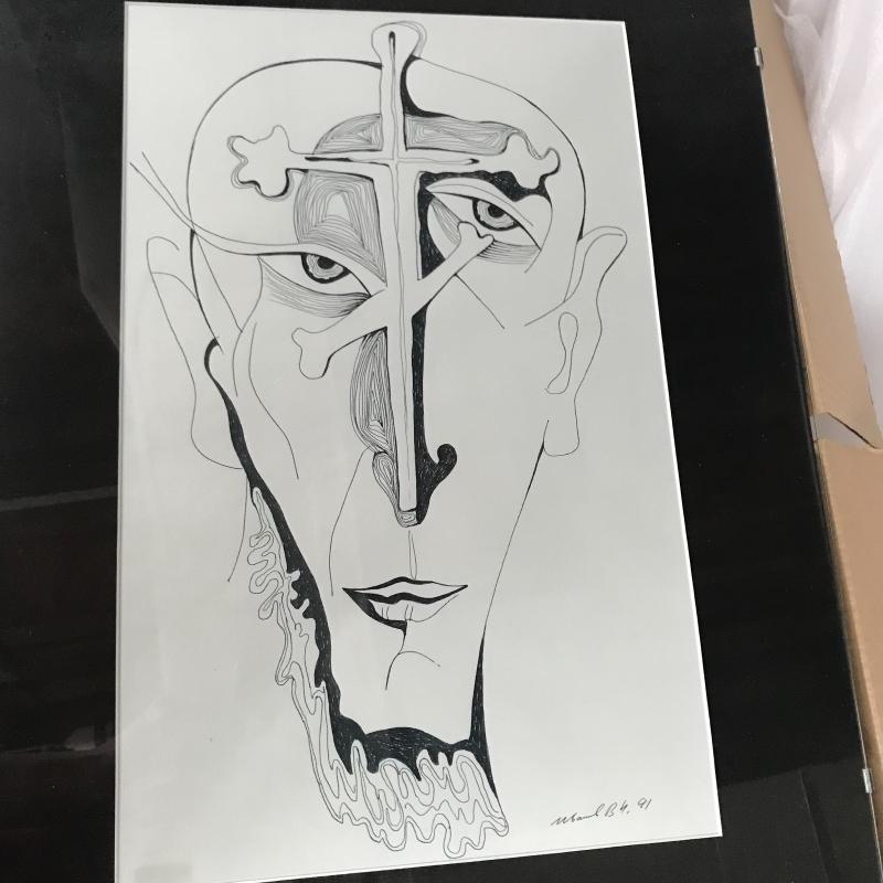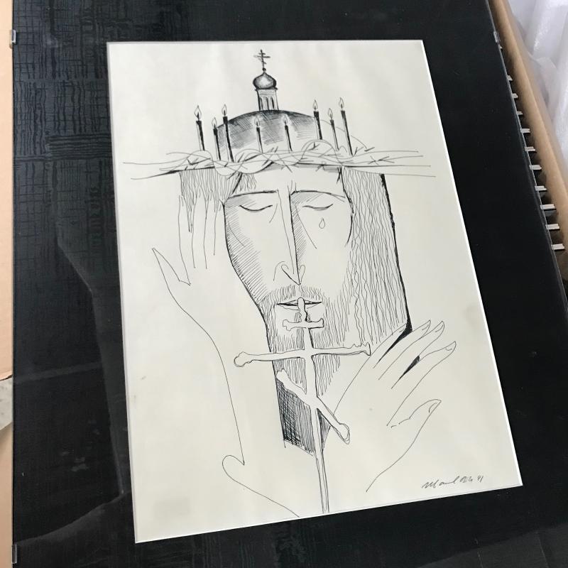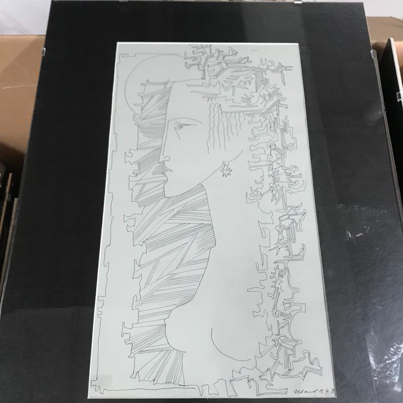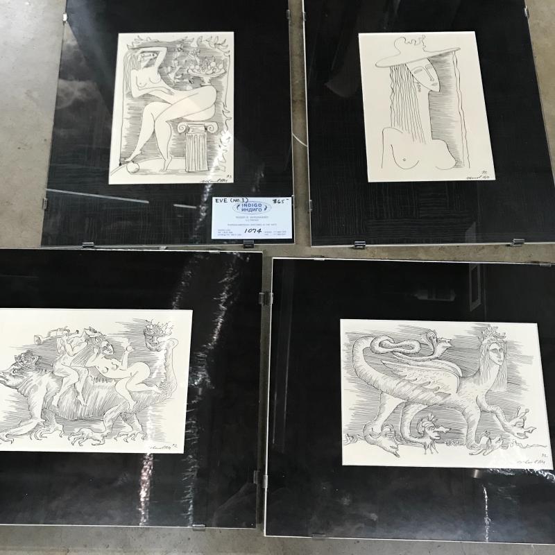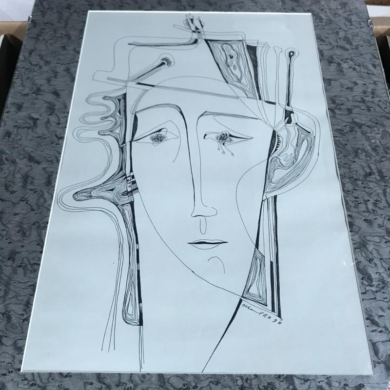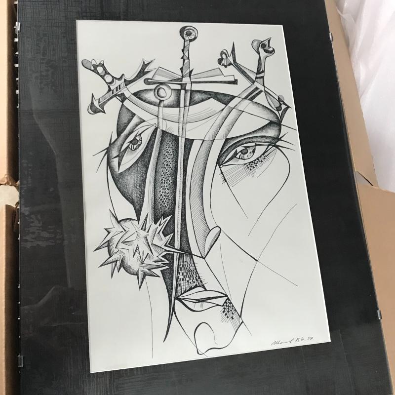 Fascinating large collection of Victor Ivanov pen and ink pieces in glass panels ready to be hung and exhibited. Some pieces appear to be originals. While there are 32 of the largest glass frames at 18” x 24”. Most all have descriptions and dimensions on a card on the back, although the adhesive is wearing off. Matting is mostly black with some brown, gray or patterned. Some binding clips have come off or broken. Some glass is chipped, but hardly noticeable. Lot also includes 2 wooden frames (black frame is 20” x 27” and blue/gray at 18” x 26”), and copies stored in photo album slips. See photos. Lots 203-206 include Victor Ivanov art. No shipping.