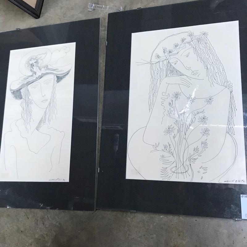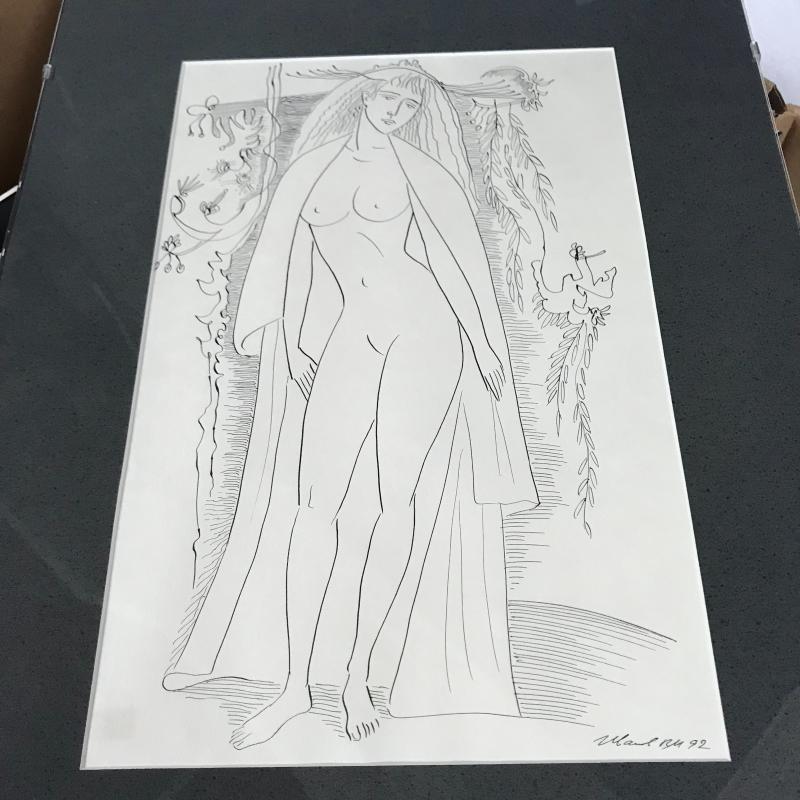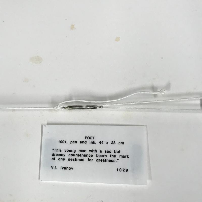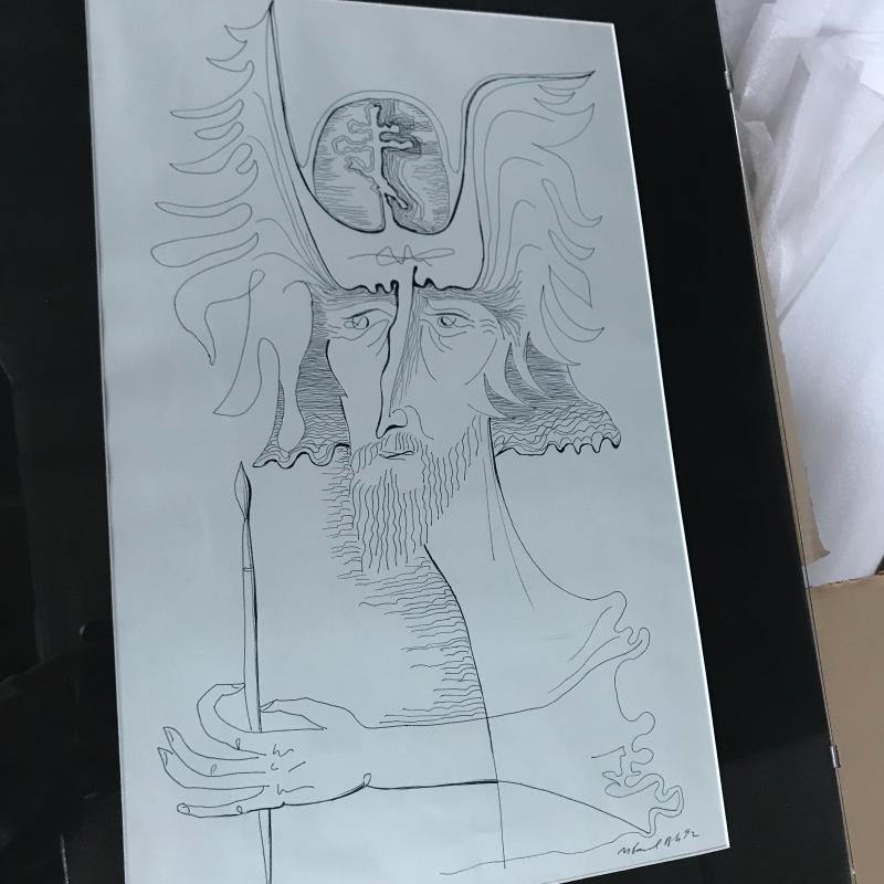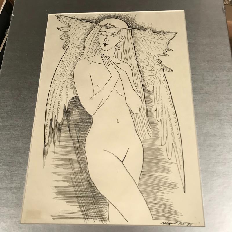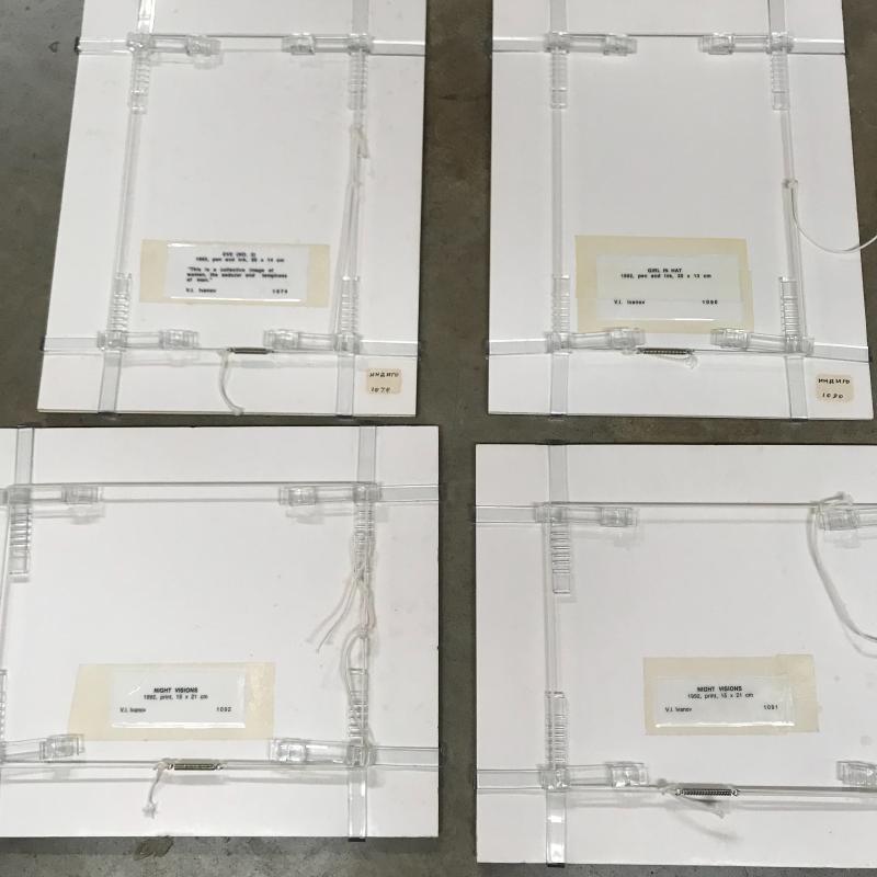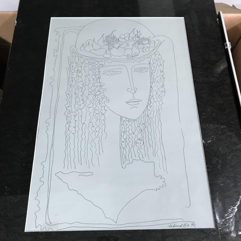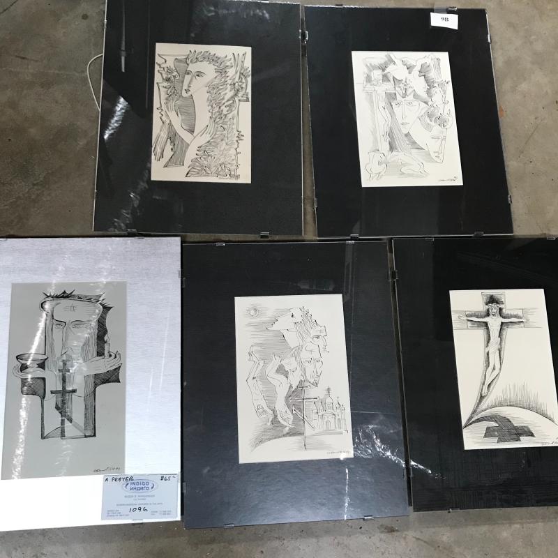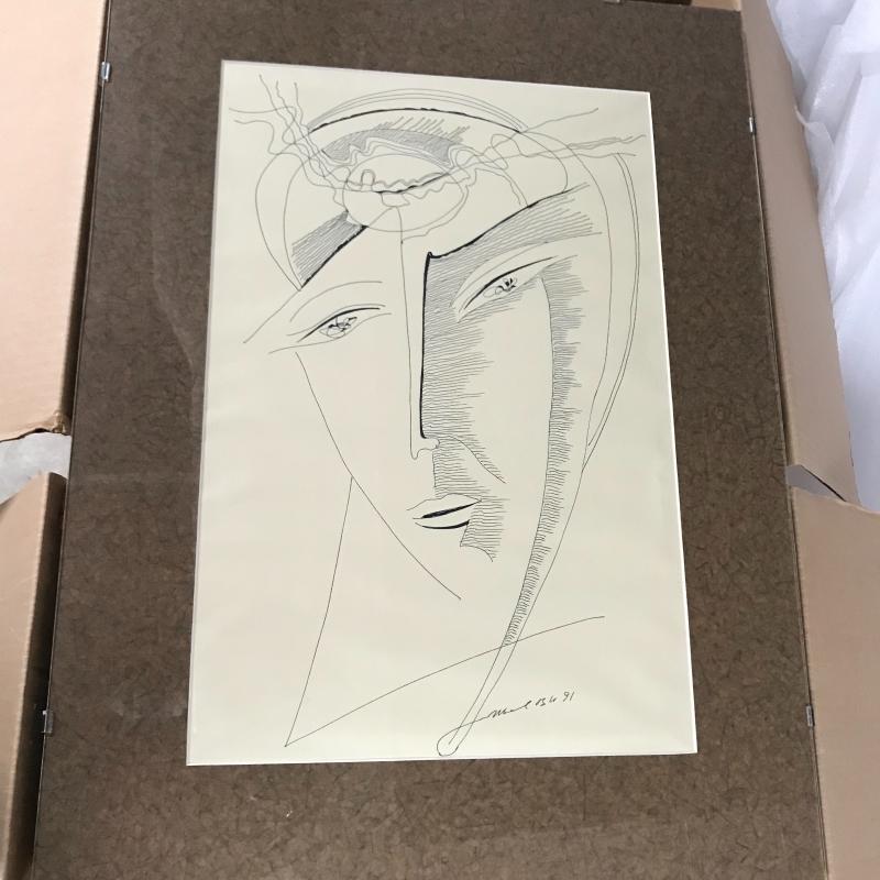 Fascinating large collection of Victor Ivanov pen and ink pieces in glass panels ready to be hung and exhibited. Some pieces appear to be originals. While there are 32 of the largest glass frames at 18” x 24”. Most all have descriptions and dimensions on a card on the back, although the adhesive is wearing off. Matting is mostly black with some brown, gray or patterned. Some binding clips have come off or broken. Some glass is chipped, but hardly noticeable. Lot also includes 2 wooden frames (black frame is 20” x 27” and blue/gray at 18” x 26”), and copies stored in photo album slips. See photos. Lots 203-206 include Victor Ivanov art. No shipping.