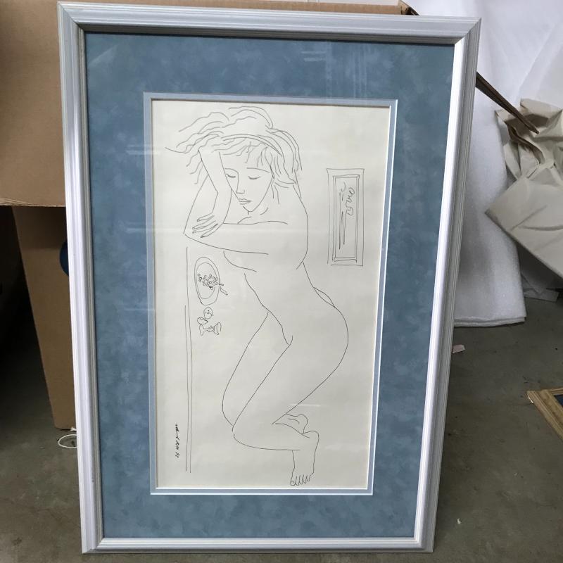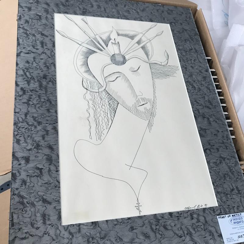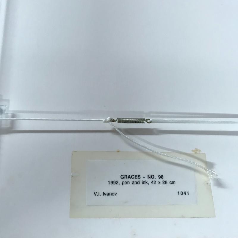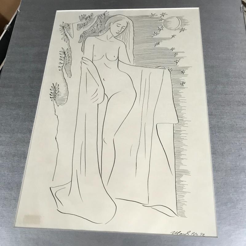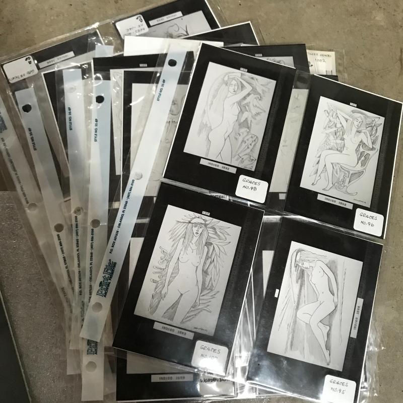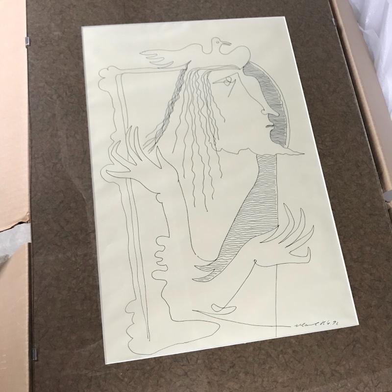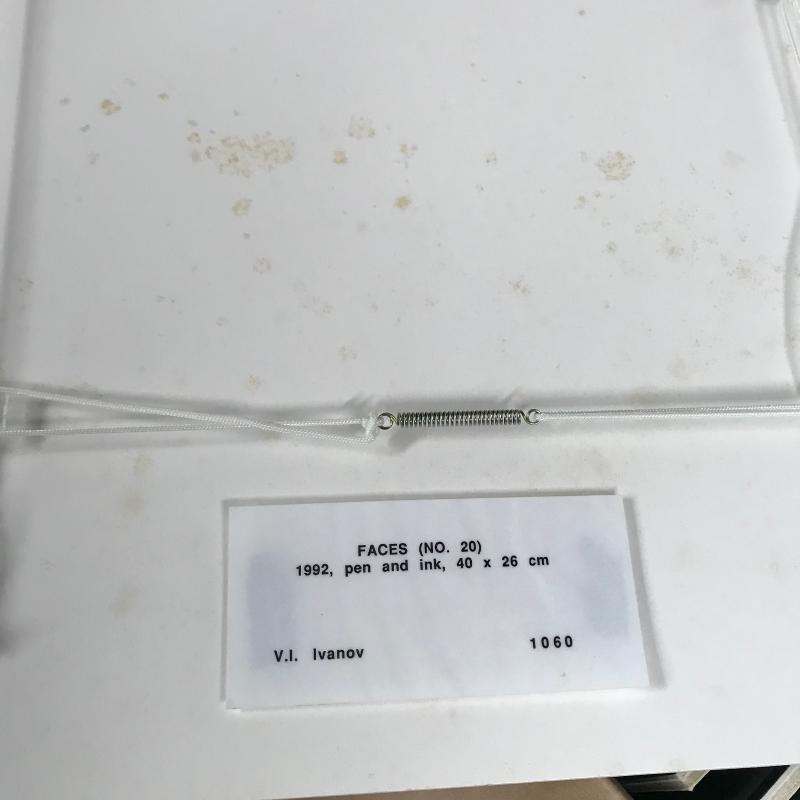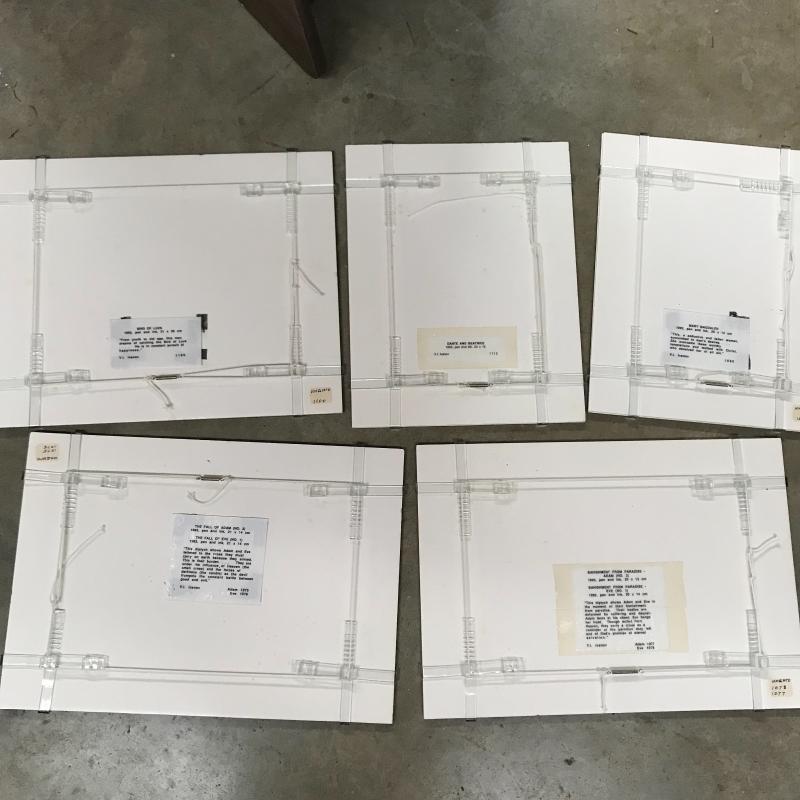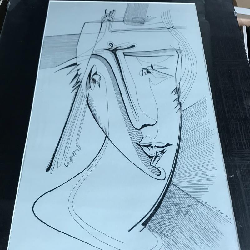 Fascinating large collection of Victor Ivanov pen and ink pieces in glass panels ready to be hung and exhibited. Some pieces appear to be originals. While there are 32 of the largest glass frames at 18” x 24”. Most all have descriptions and dimensions on a card on the back, although the adhesive is wearing off. Matting is mostly black with some brown, gray or patterned. Some binding clips have come off or broken. Some glass is chipped, but hardly noticeable. Lot also includes 2 wooden frames (black frame is 20” x 27” and blue/gray at 18” x 26”), and copies stored in photo album slips. See photos. Lots 203-206 include Victor Ivanov art. No shipping.