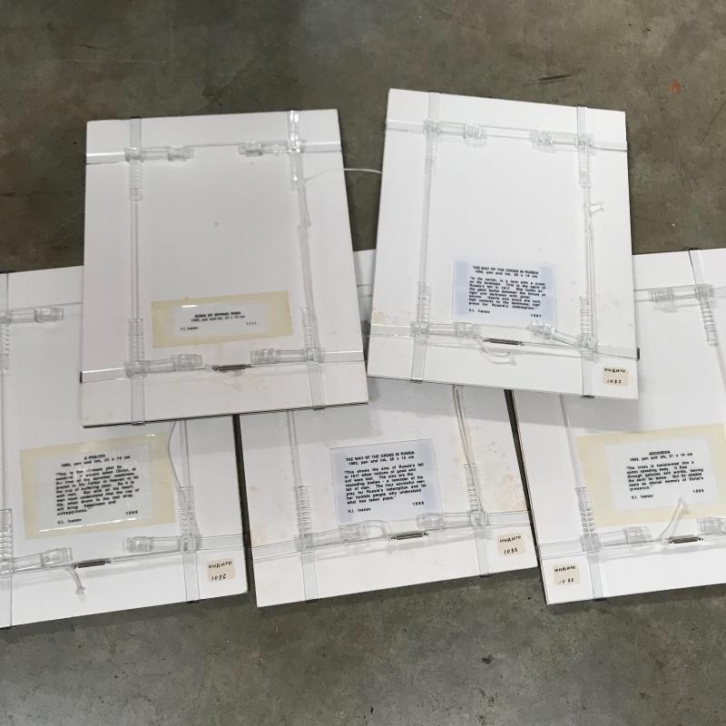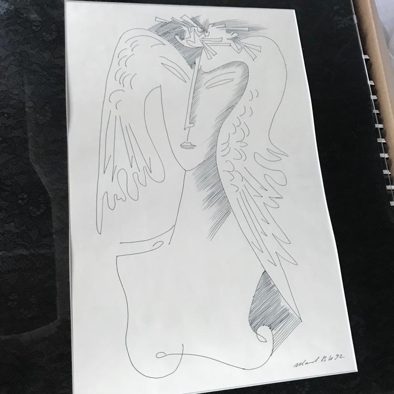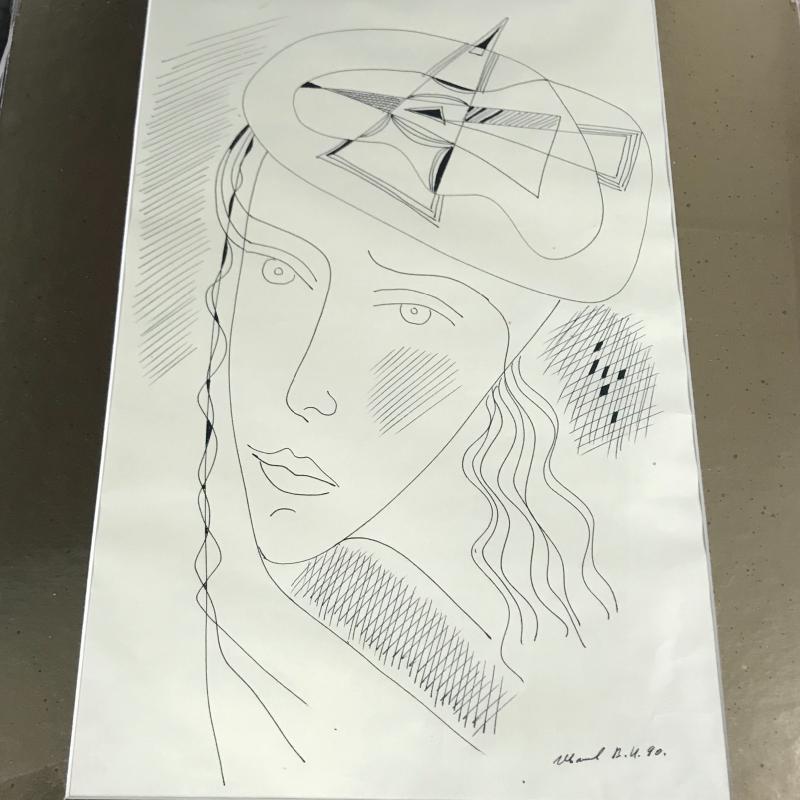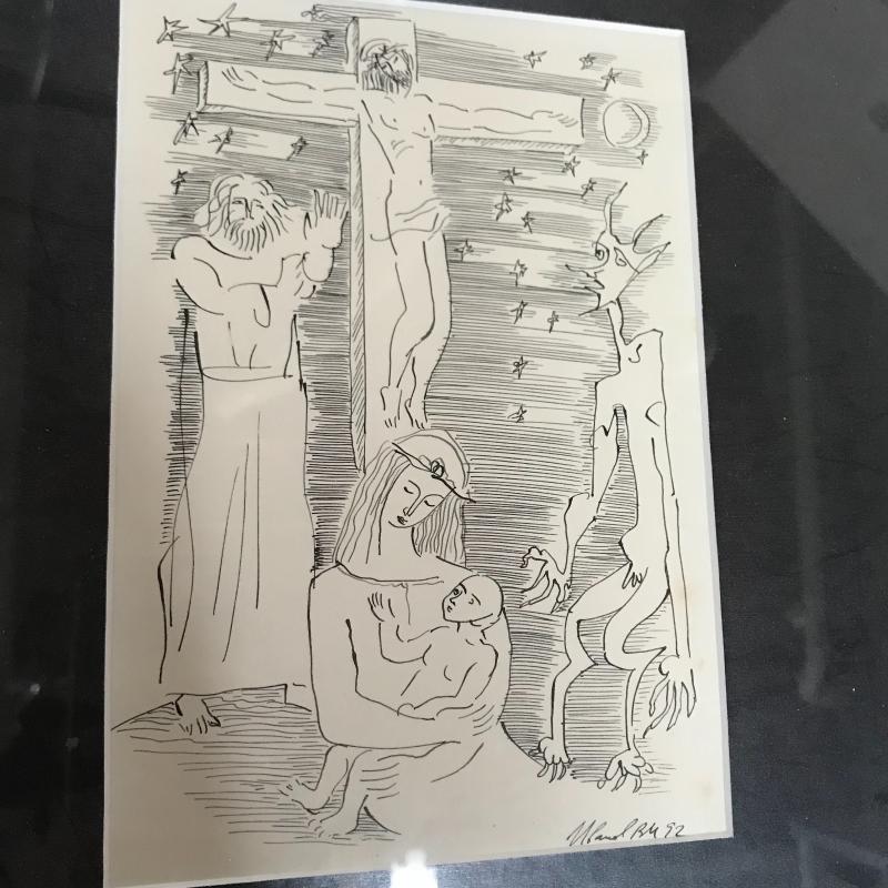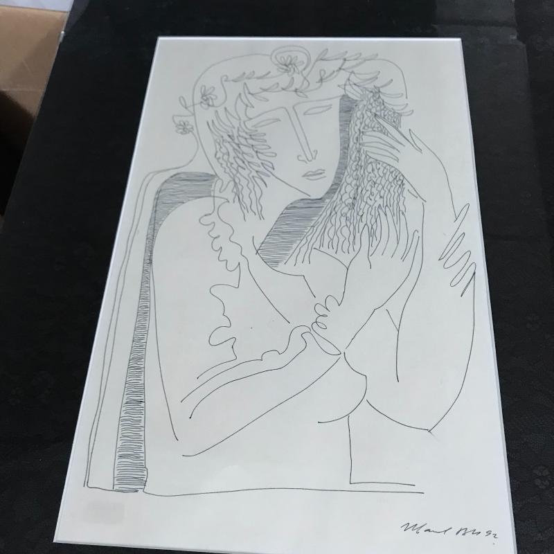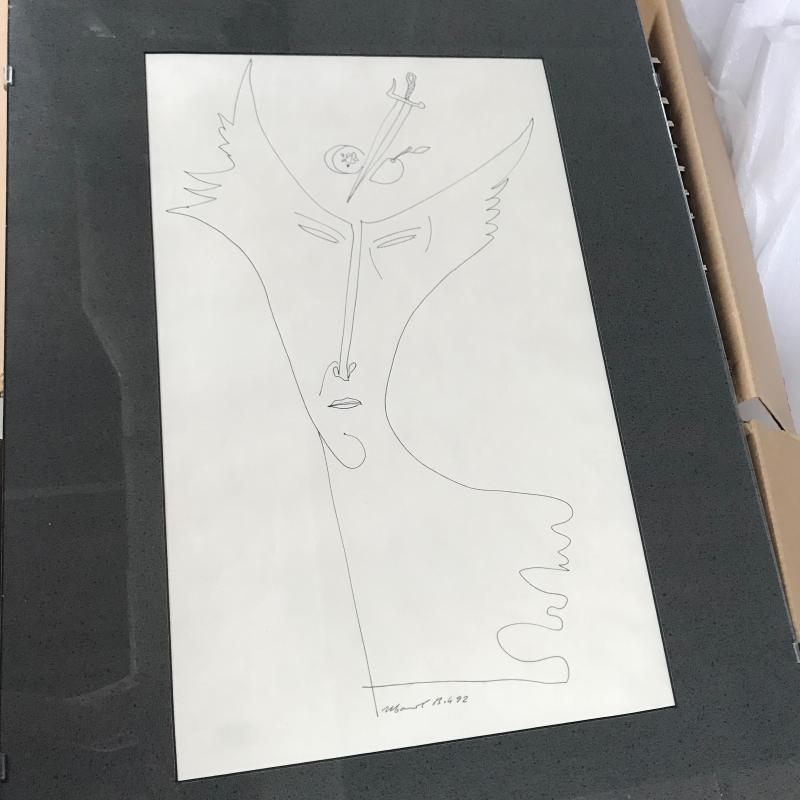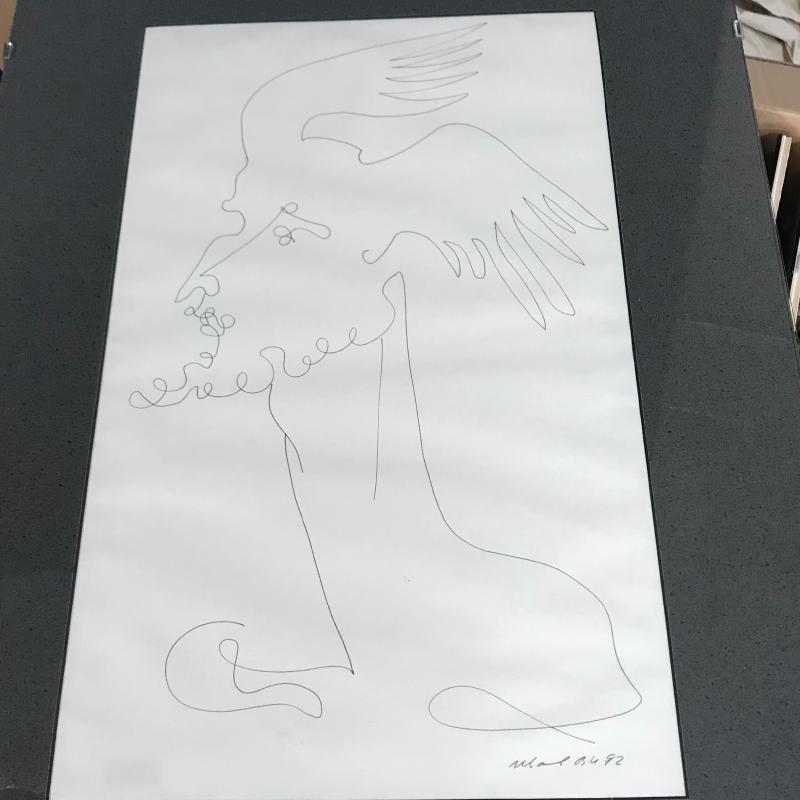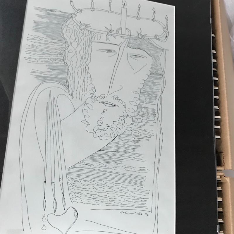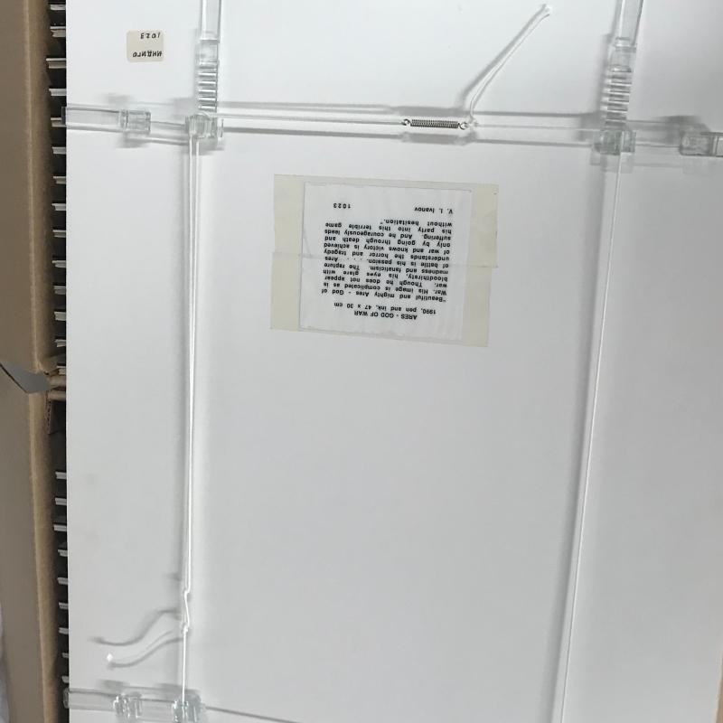 Fascinating large collection of Victor Ivanov pen and ink pieces in glass panels ready to be hung and exhibited. Some pieces appear to be originals. While there are 32 of the largest glass frames at 18” x 24”. Most all have descriptions and dimensions on a card on the back, although the adhesive is wearing off. Matting is mostly black with some brown, gray or patterned. Some binding clips have come off or broken. Some glass is chipped, but hardly noticeable. Lot also includes 2 wooden frames (black frame is 20” x 27” and blue/gray at 18” x 26”), and copies stored in photo album slips. See photos. Lots 203-206 include Victor Ivanov art. No shipping.