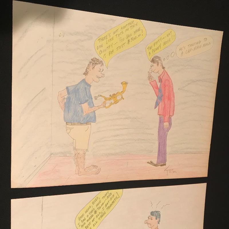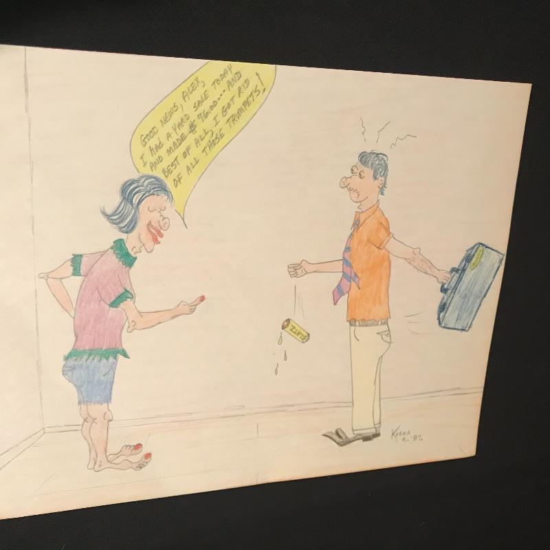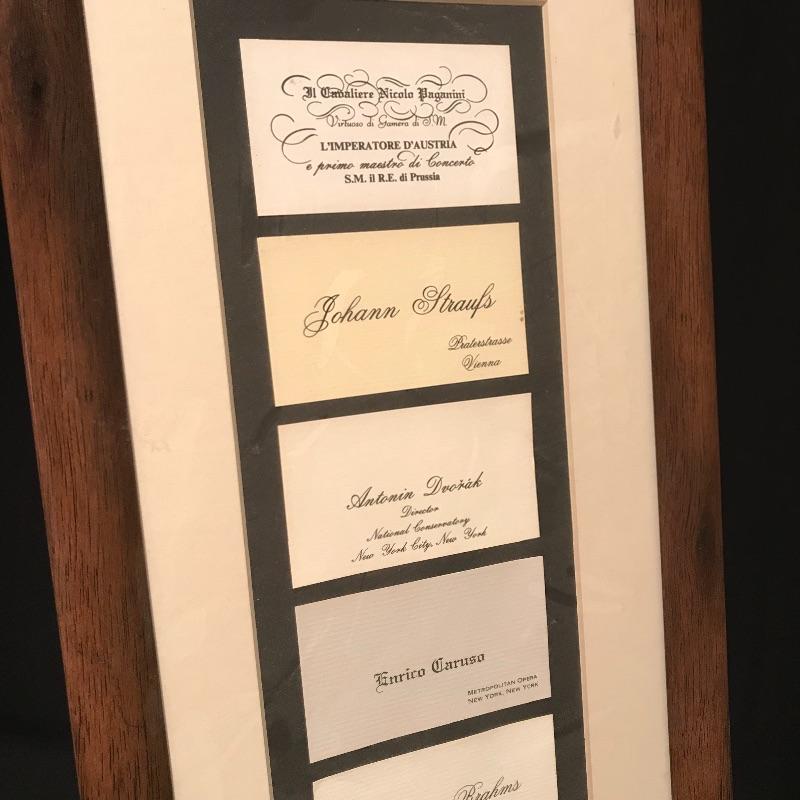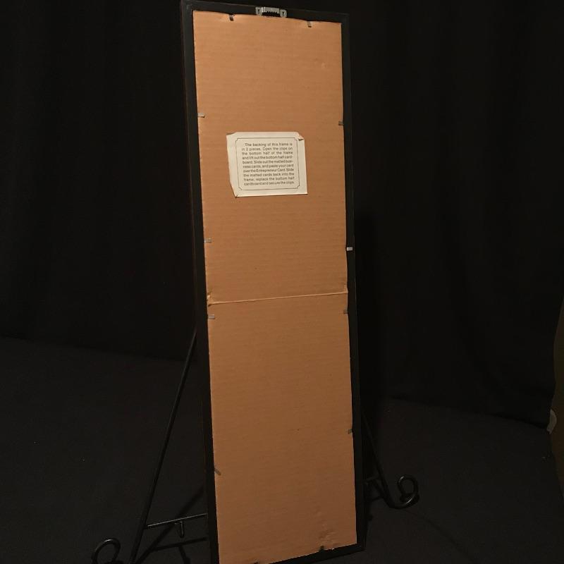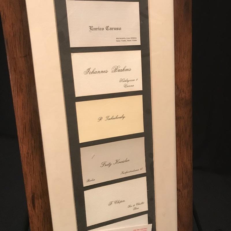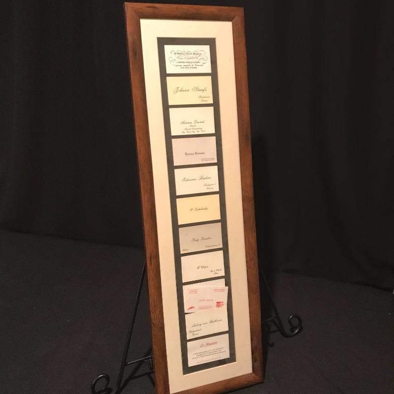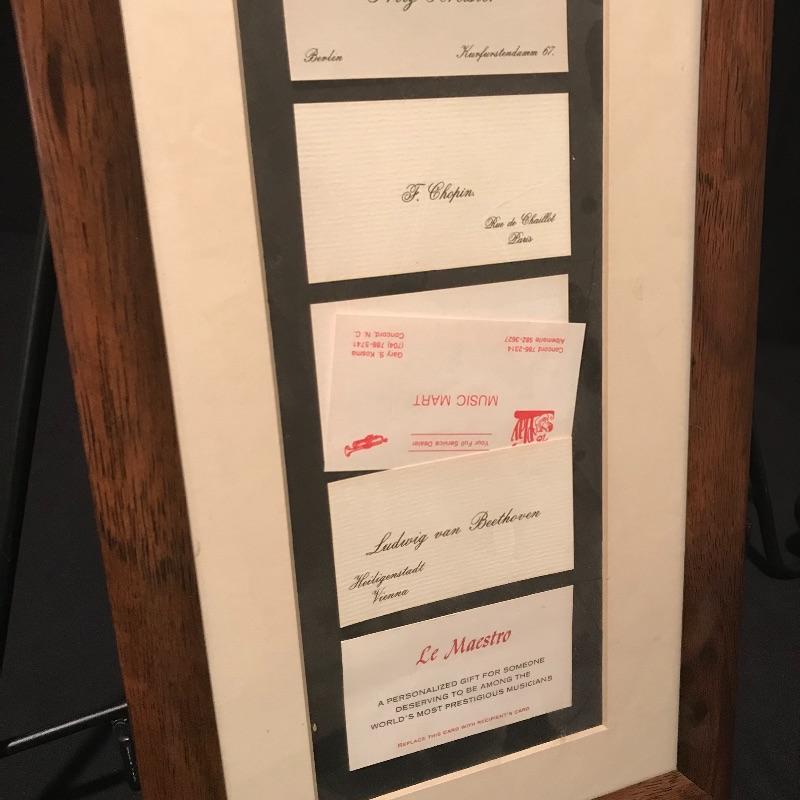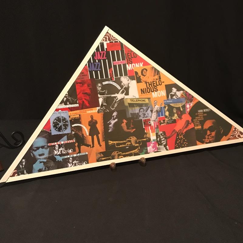 Awesome gift for the Jazz lover in your life! Vincent Bach Bundy Selmer lamp converted into a table lamp with a three step wooden base. Lamp turns on when plugged in. Lamp shade has some blemishes, but is overall in nice shape. There is a small dent in the lamp, see photos. Lamp is accompanied by a fun business card display with would-be cards from composers like Beethoven and Chopin and even a spot for your own card! Personalized art is also included, two comics for any trumpet collector and a funky triangle jazz compilation! Lamp stands approximately 35” tall with shade, 32” without. Business card frame measures approximately 9” x 30”. Local pick up only.