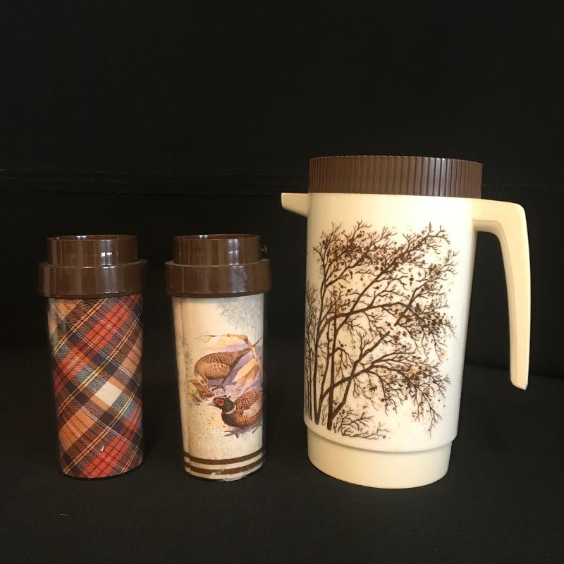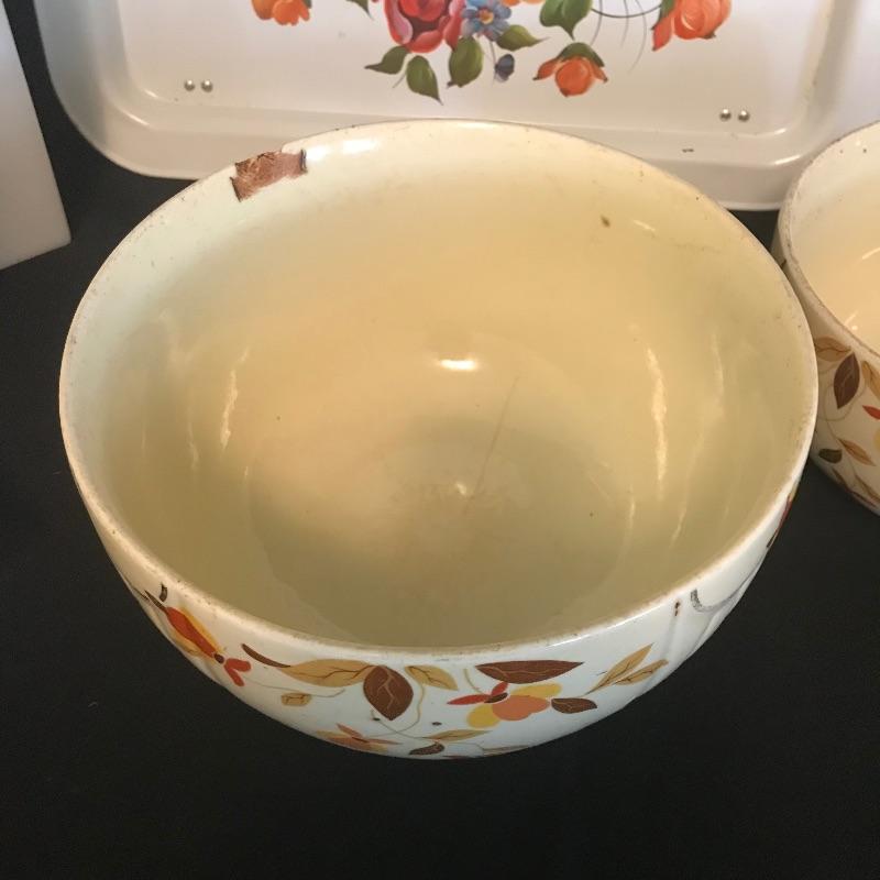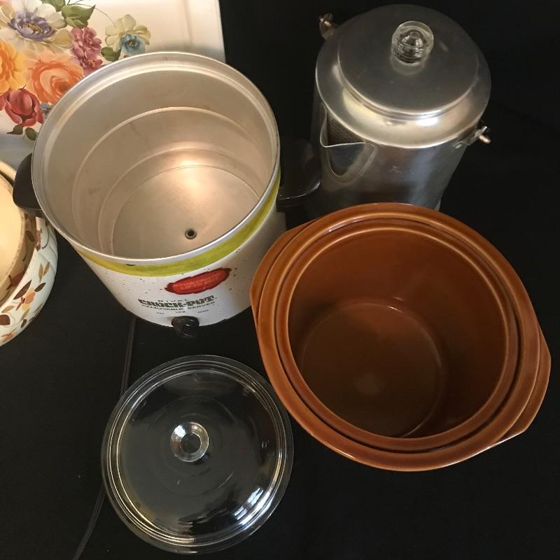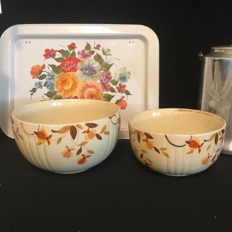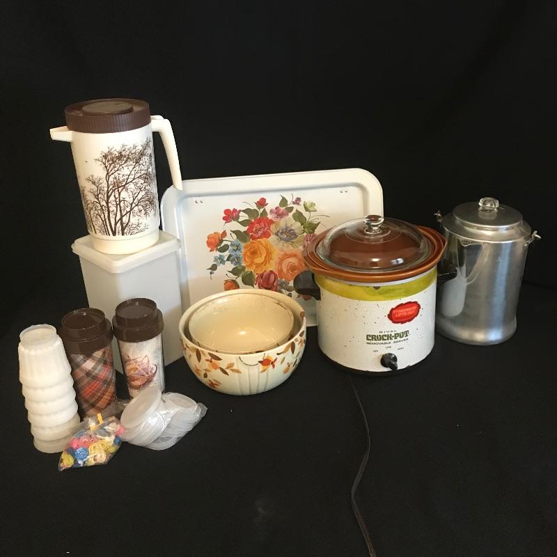 Awesome warm colored finds from a few decades ago! Two matching Hall’s Superior bowls, the largest shows a chip and a crack noted in photos and measures 8.75”d x 4.75”. Lot also features a working Rival Crock-Pot, a set of six Tupperware jello moulds, two vintage to-go coffee cups with fantastic designs and pitcher to boot! A flower adorned lap tray with a metal coffee kettle perfect for outdoor use also included. See photos. No shipping.