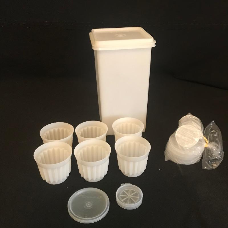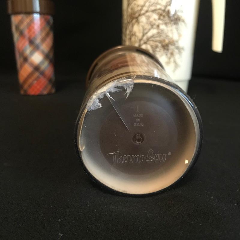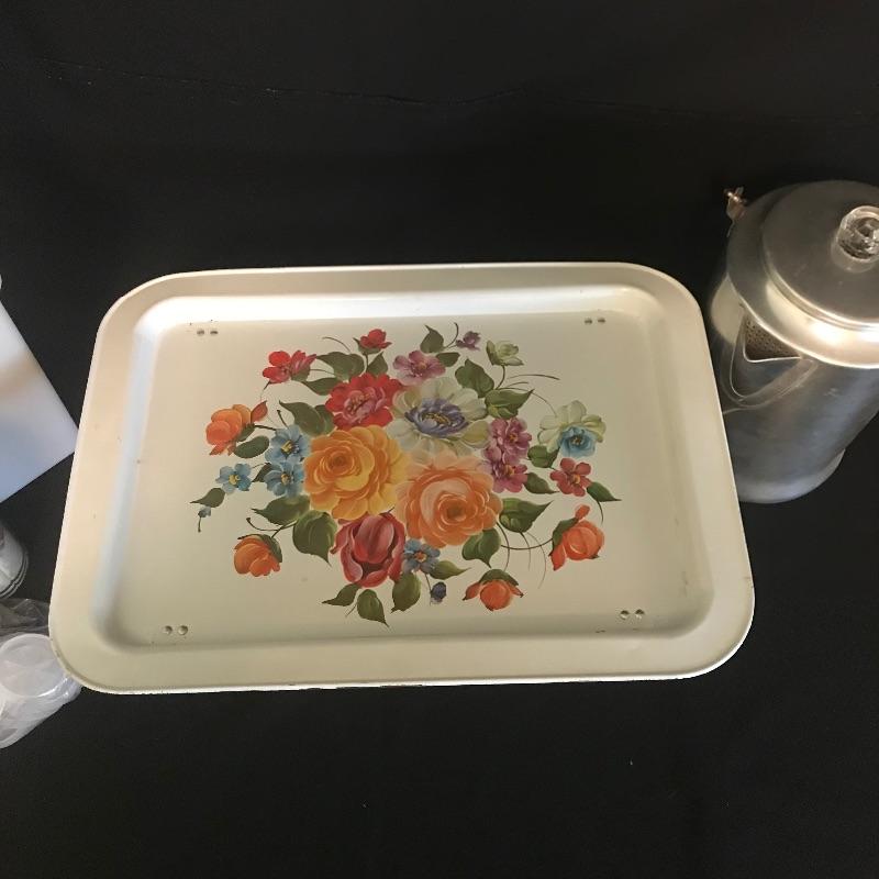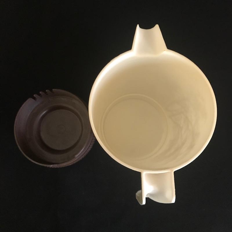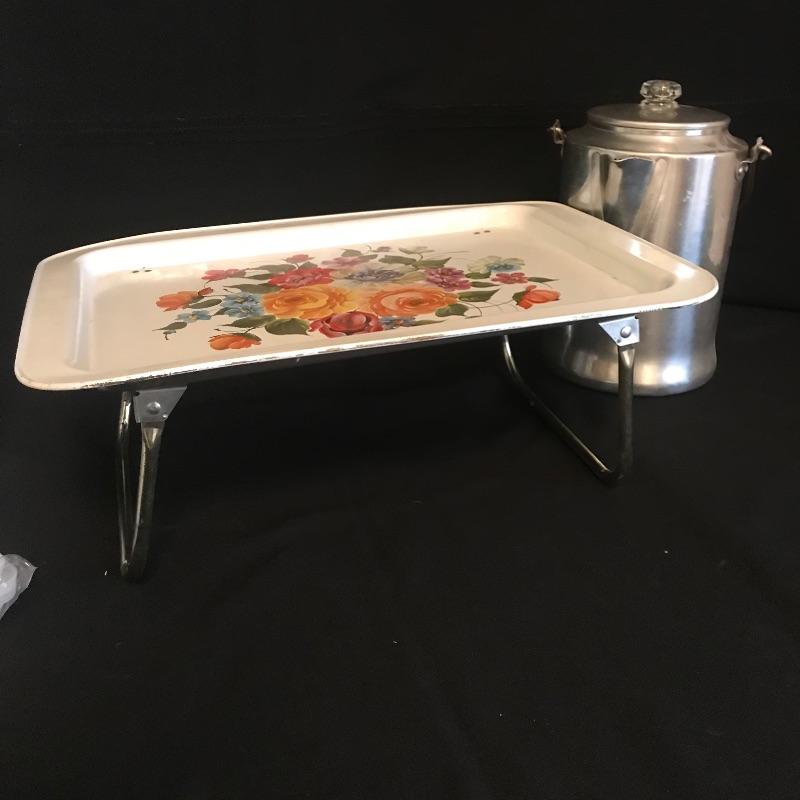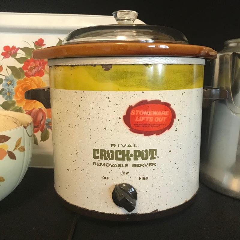 Awesome warm colored finds from a few decades ago! Two matching Hall’s Superior bowls, the largest shows a chip and a crack noted in photos and measures 8.75”d x 4.75”. Lot also features a working Rival Crock-Pot, a set of six Tupperware jello moulds, two vintage to-go coffee cups with fantastic designs and pitcher to boot! A flower adorned lap tray with a metal coffee kettle perfect for outdoor use also included. See photos. No shipping.