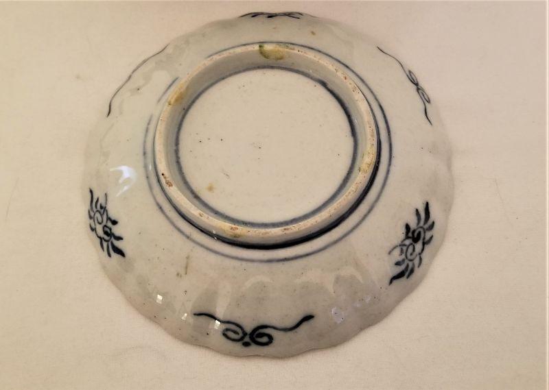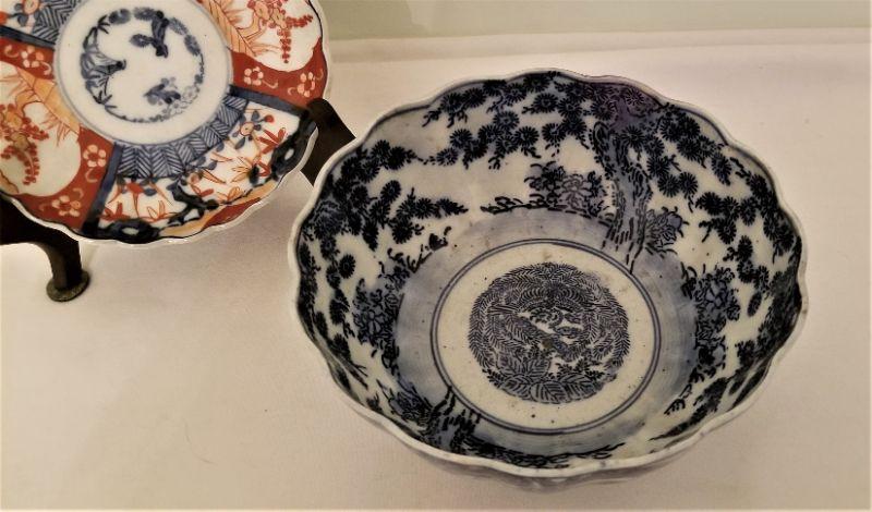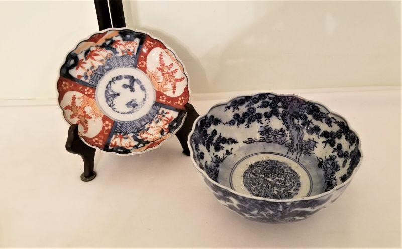 Imari Plate (19th century) is 6" across and is in good antique condition. Blue/white bowl (also antique) is 7.25" across and 3.5" tall.