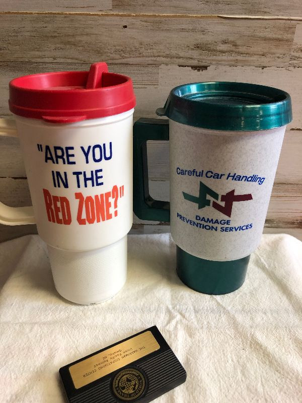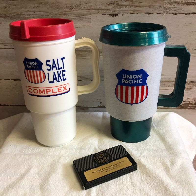 Lot 204 2 plastic Union Pacific Mugs and a tape measure
