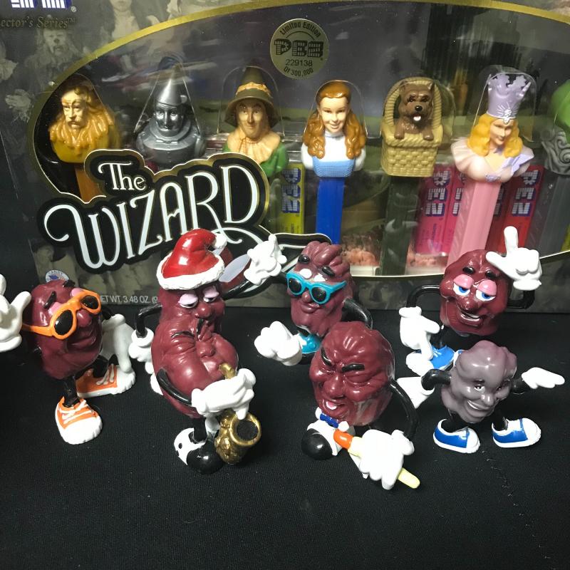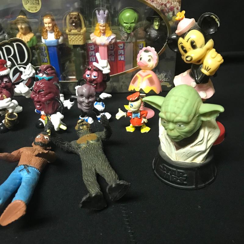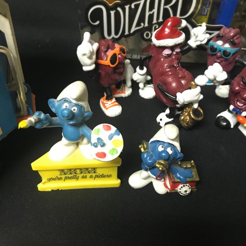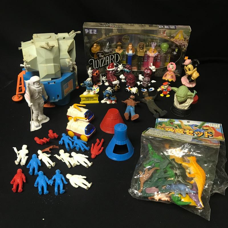 Collectible figurines include, Smurfs, Rasinettes, Wizard of Oz Pez(new in box), Disney characters, Apollo collection and more. Dinosaurs still in packaging from China. Shipping Avaiable.