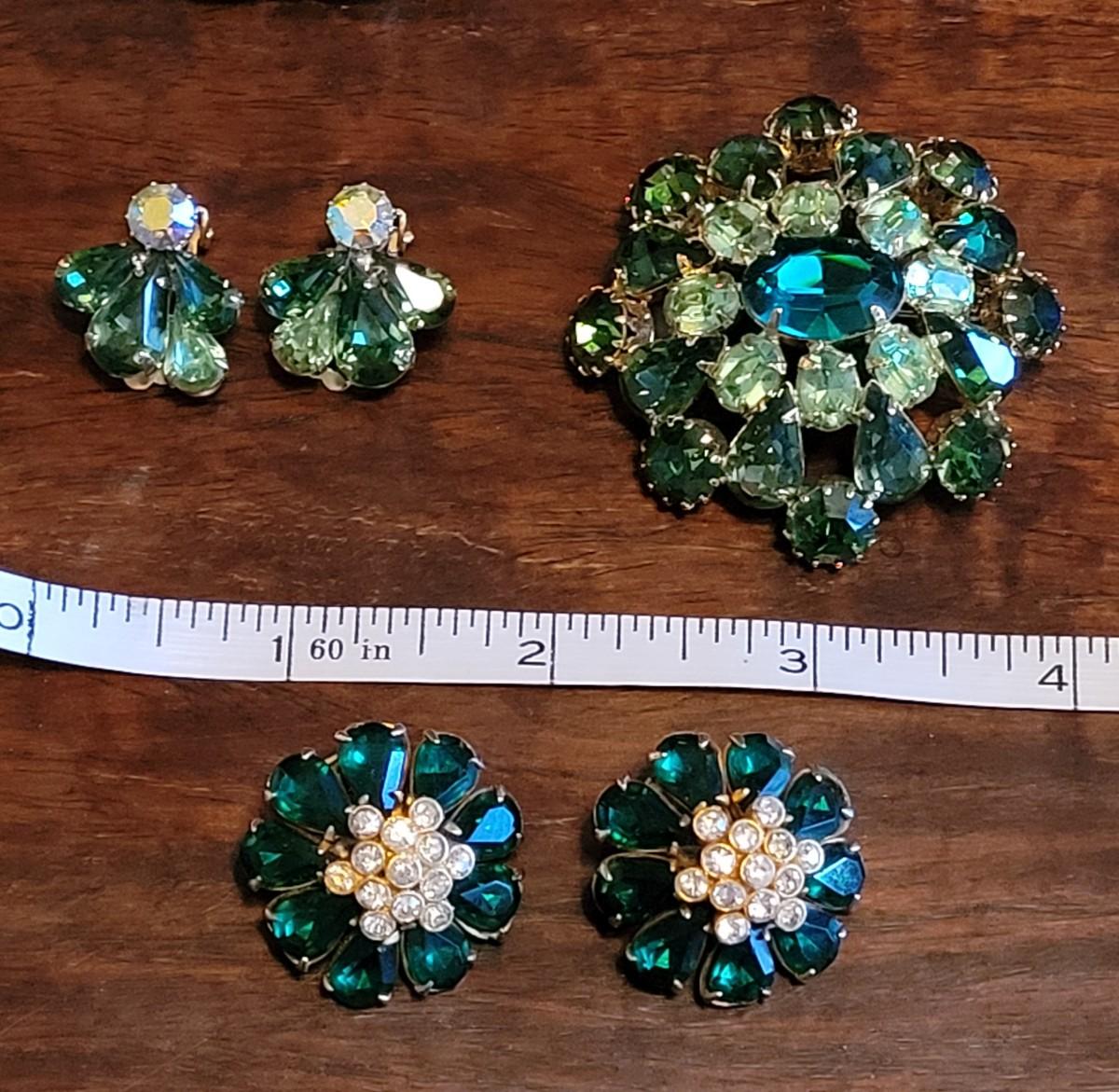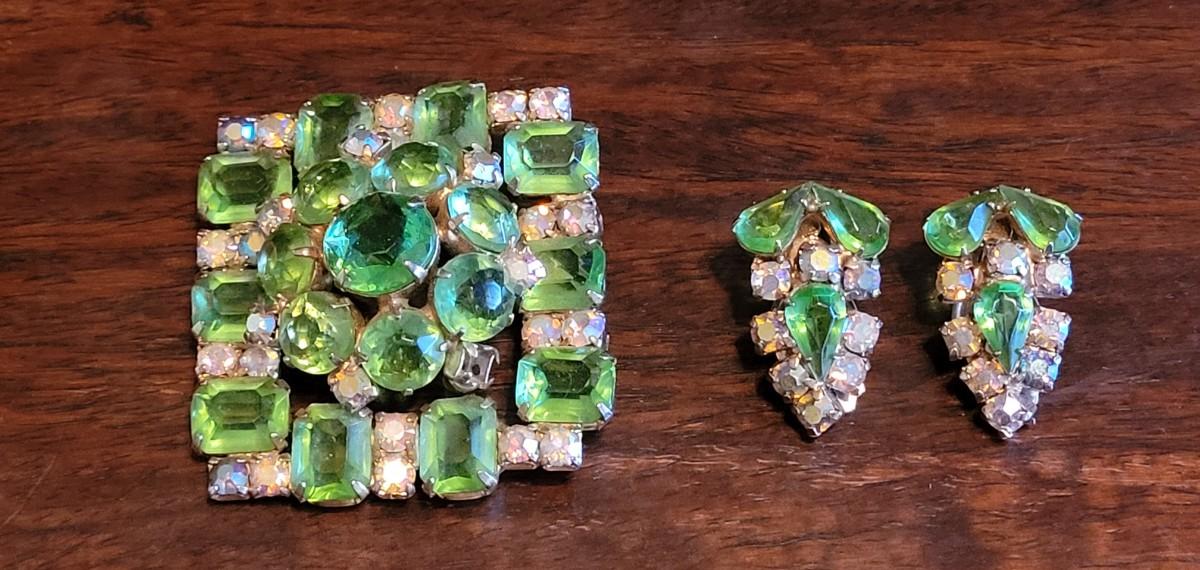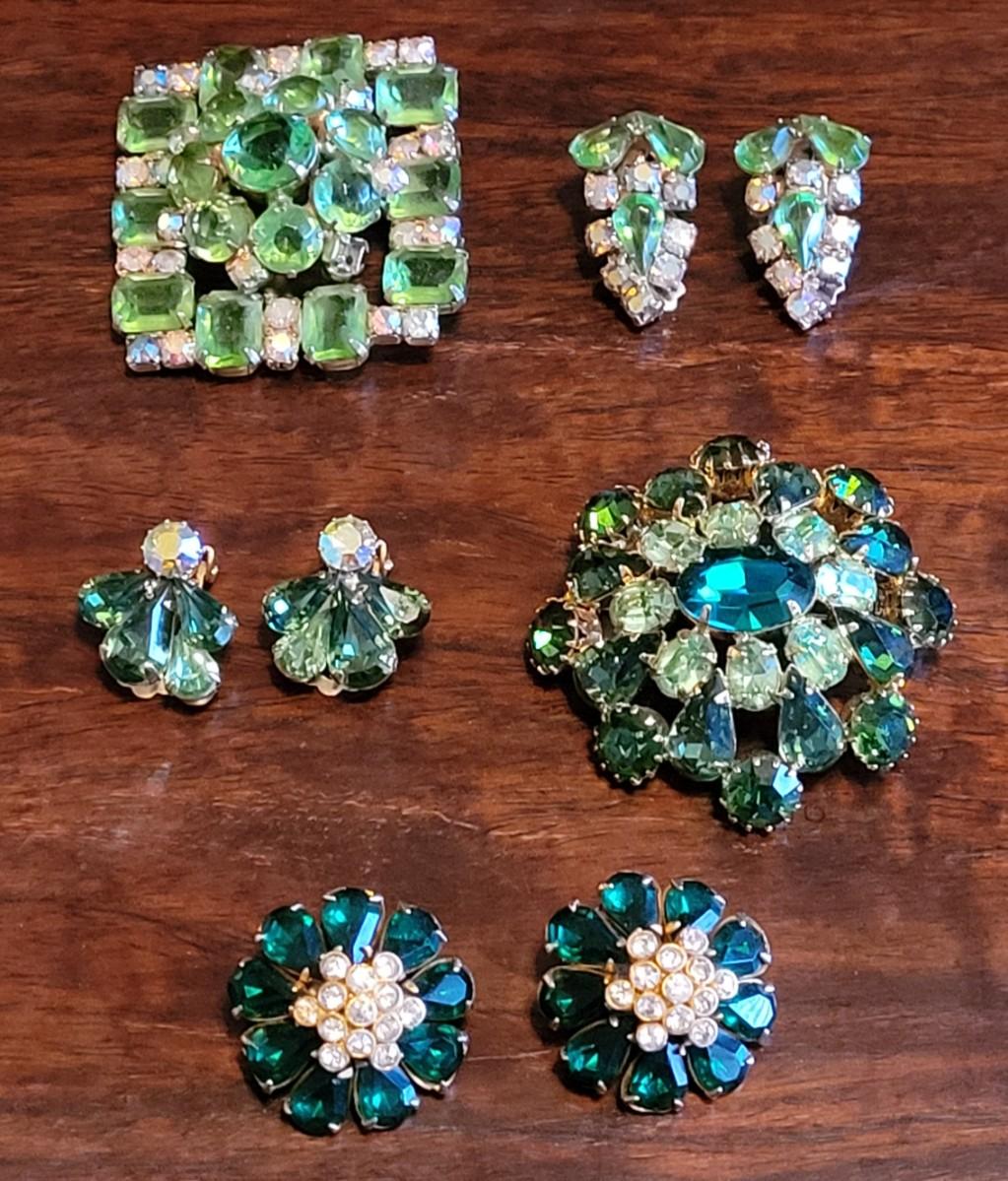 Lot 204: Vintage Green Rhinestone Brooch and Earrings Sets