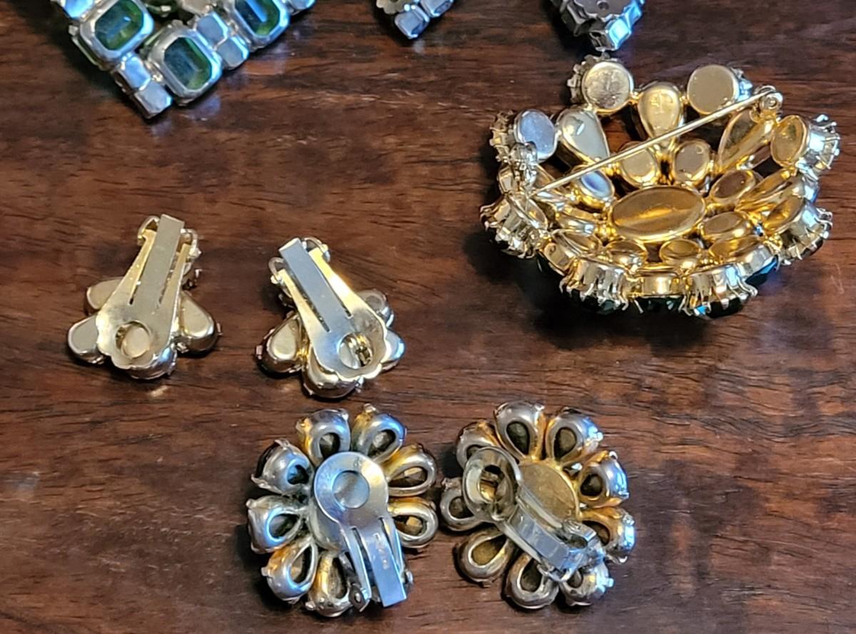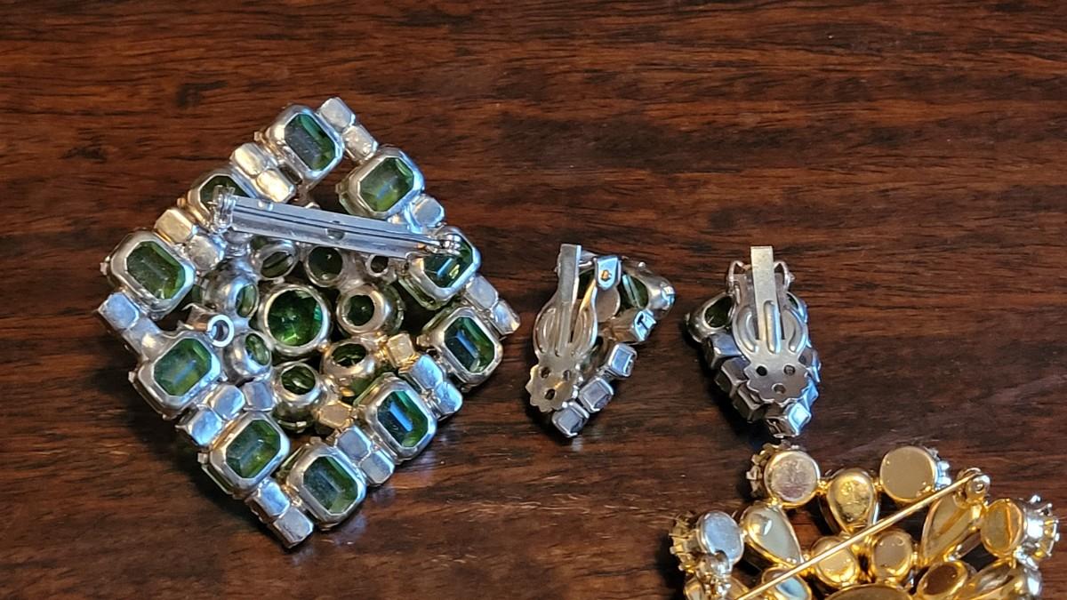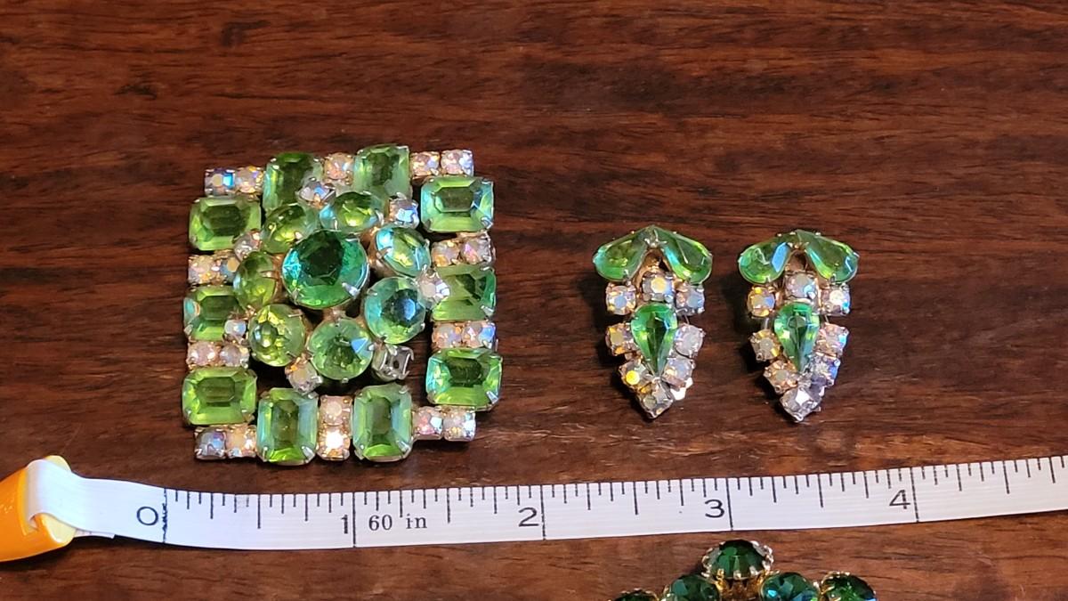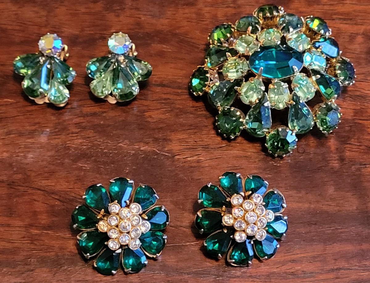 Lot 204: Vintage Green Rhinestone Brooch and Earrings Sets