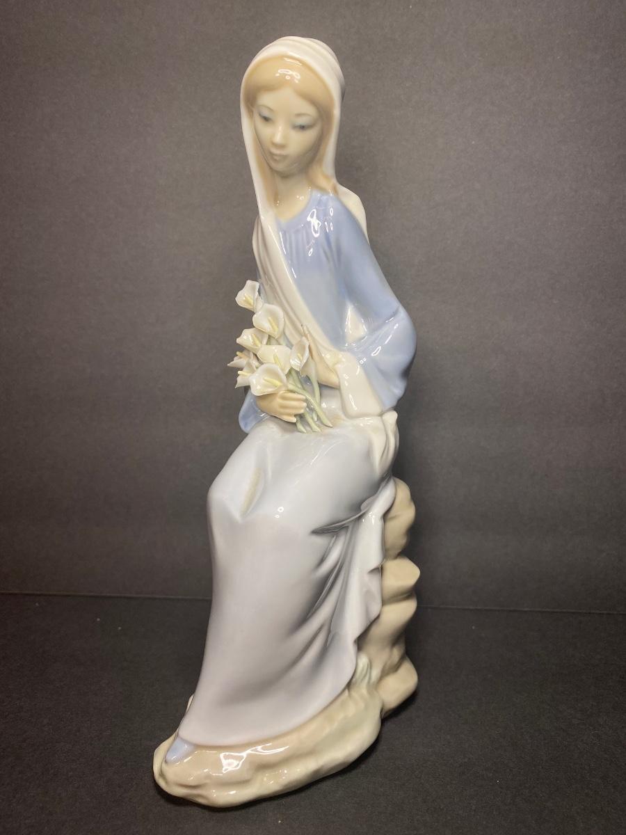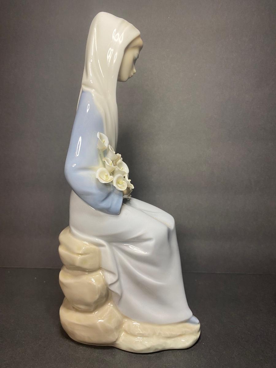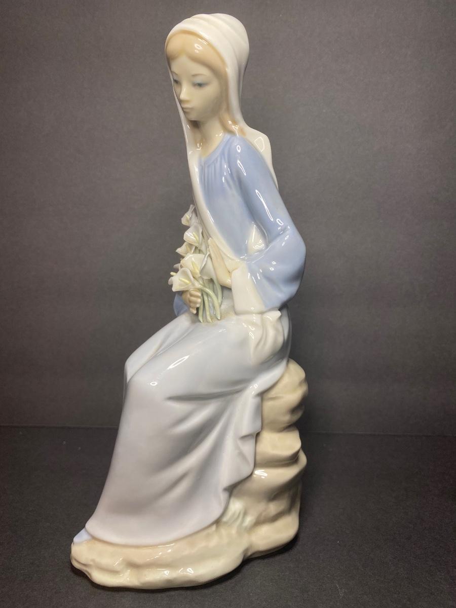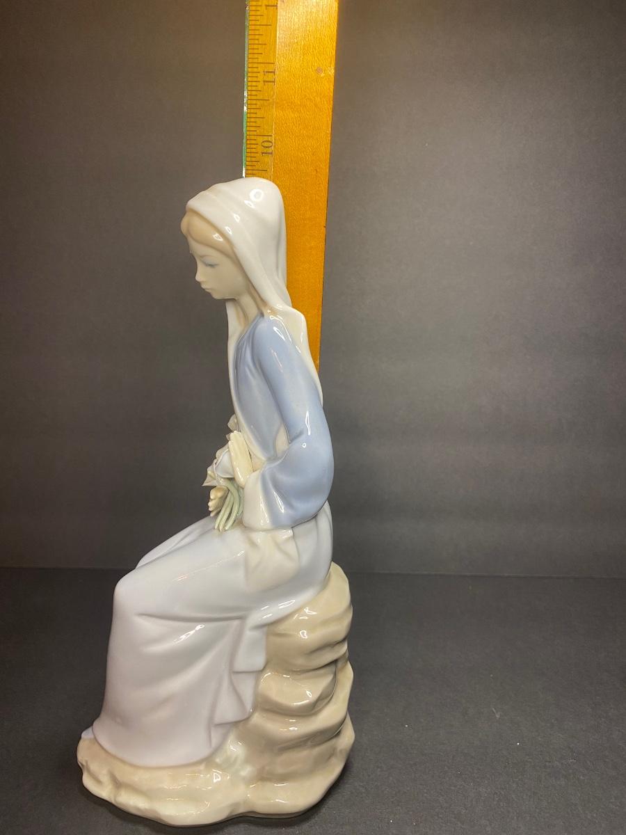 Lladro women sitting on rocks, holding flowers. She is in very good condition. All fingers and flowers have been inspected for chips.