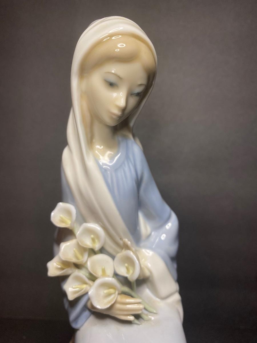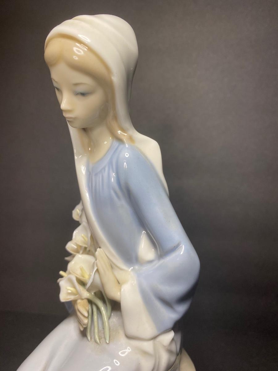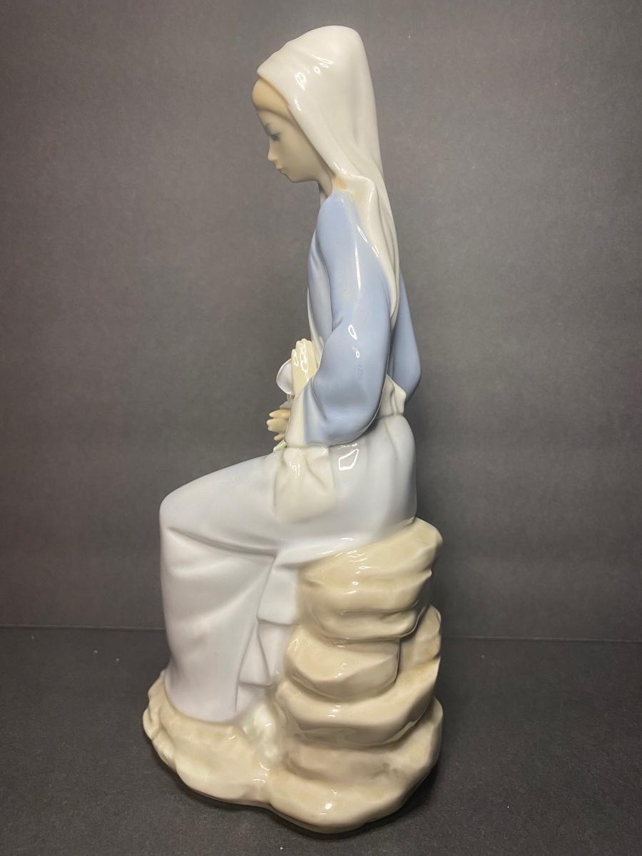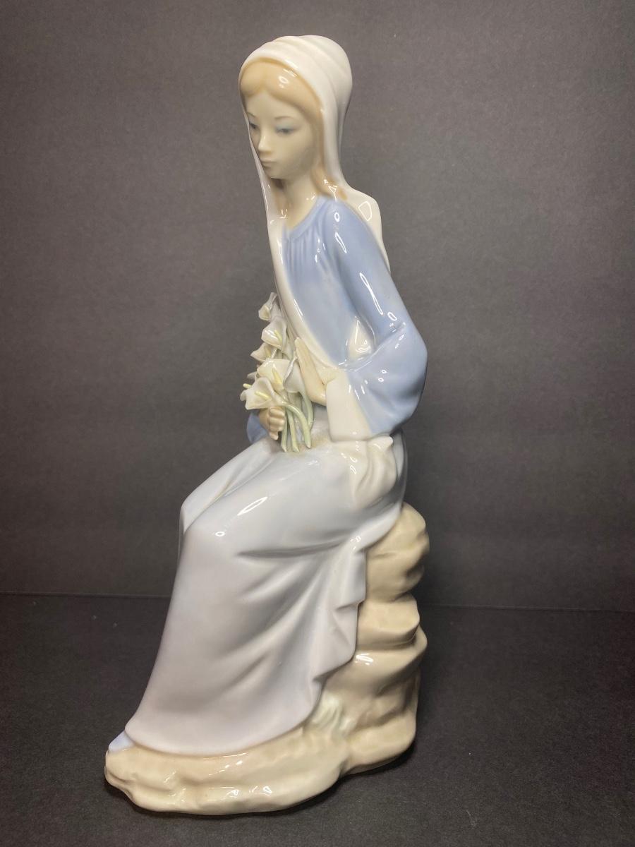 Lladro women sitting on rocks, holding flowers. She is in very good condition. All fingers and flowers have been inspected for chips.
