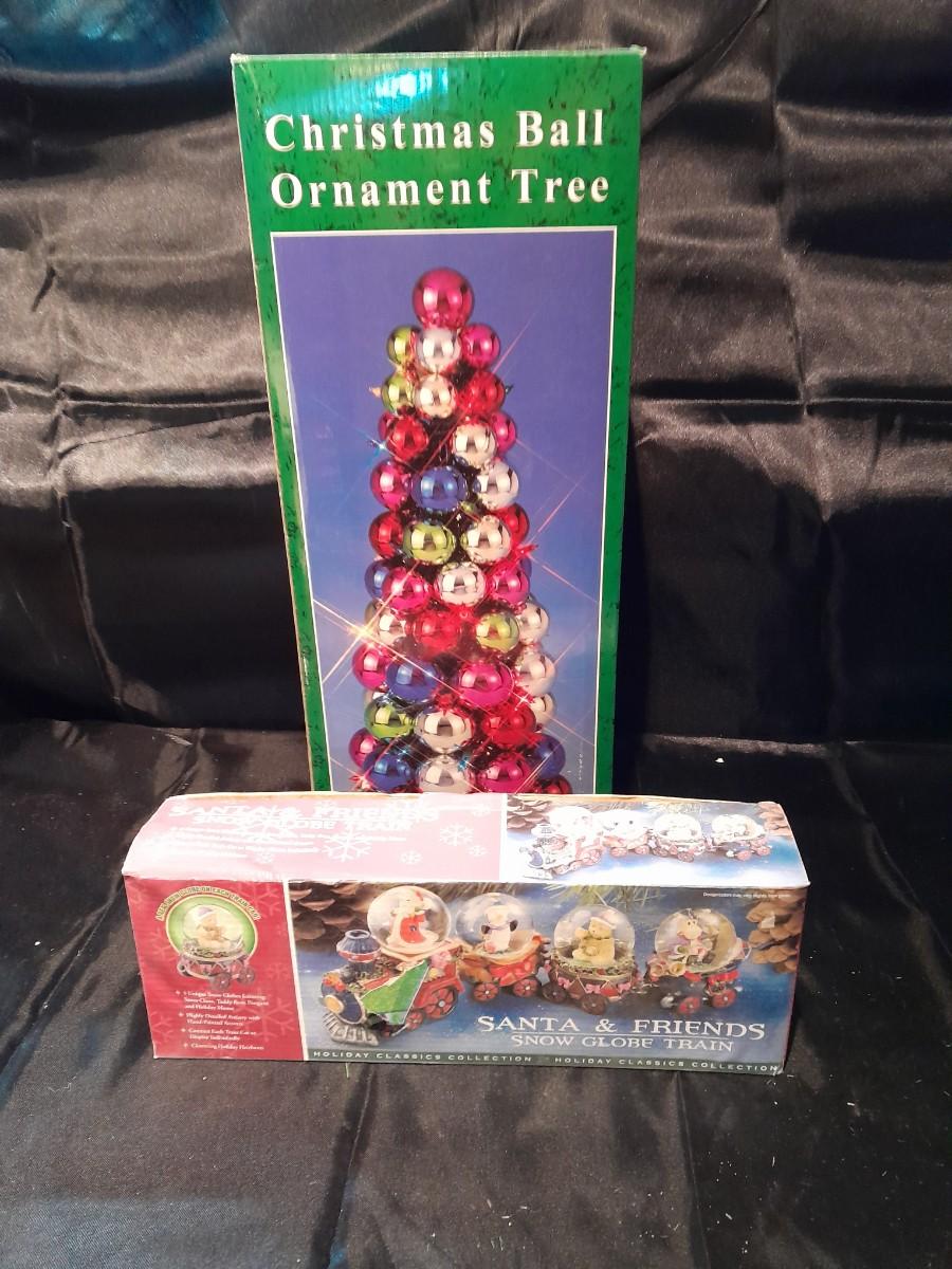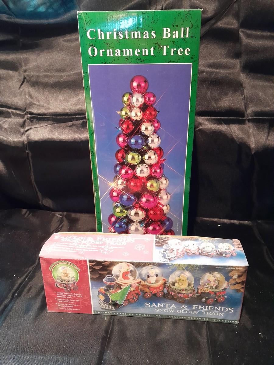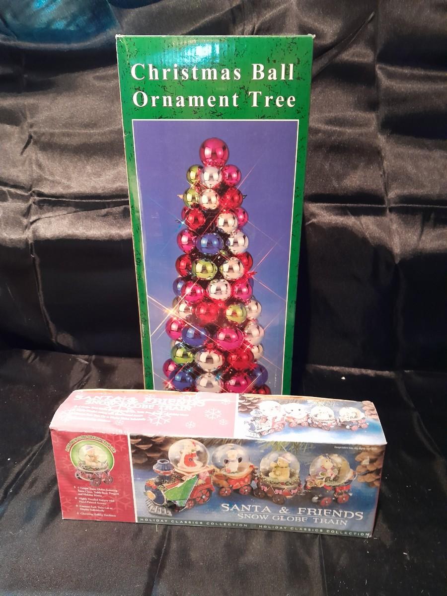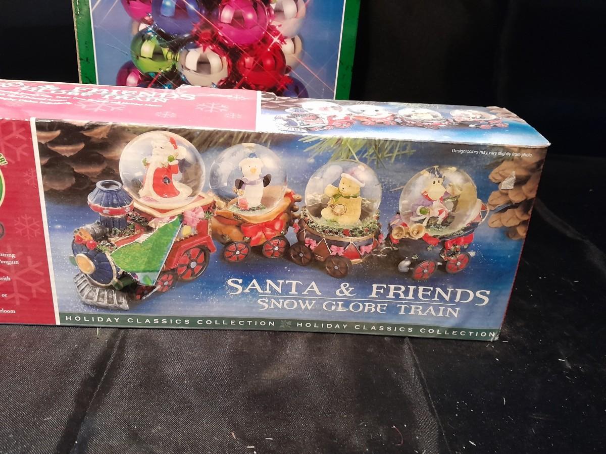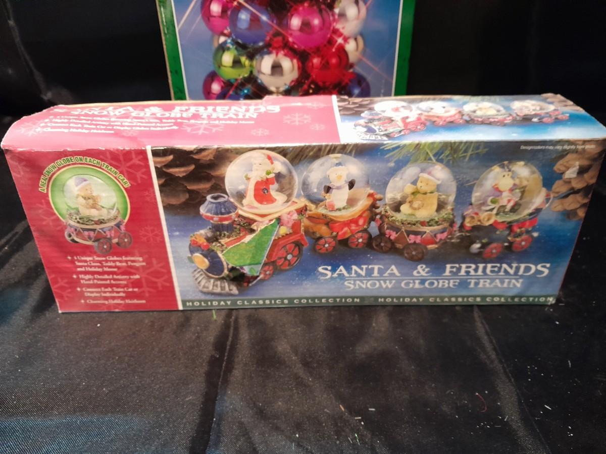 LOT 204 COLORFUL ORNAMENT BALL TREE AND SANTA AND FRIENDS SNOW GLOBE TRAIN