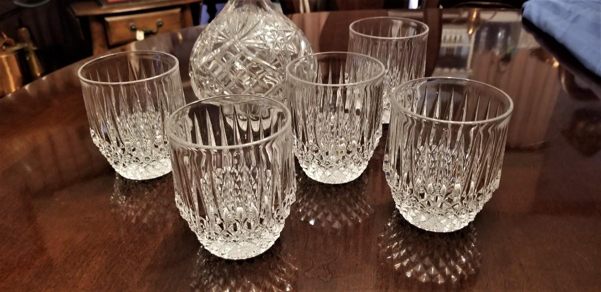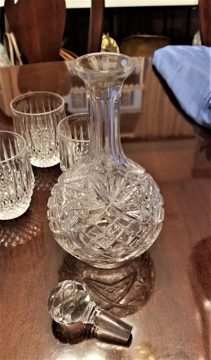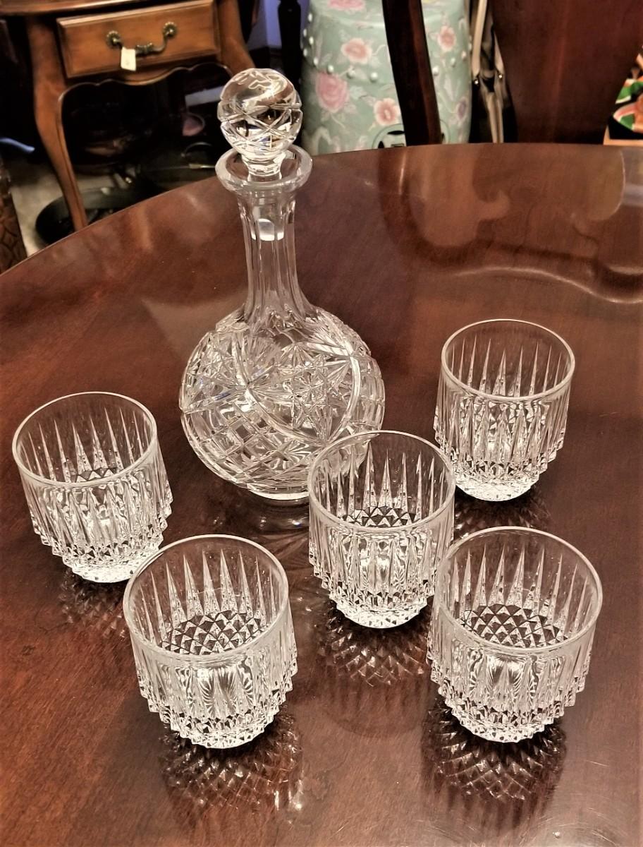 Nice grouping - crystal decanter with ground glass stopper (10.5" tall) and 5 crystal rocks glasses (each 3.75" tall). All unsigned, good condition.