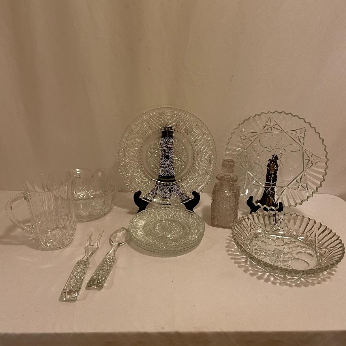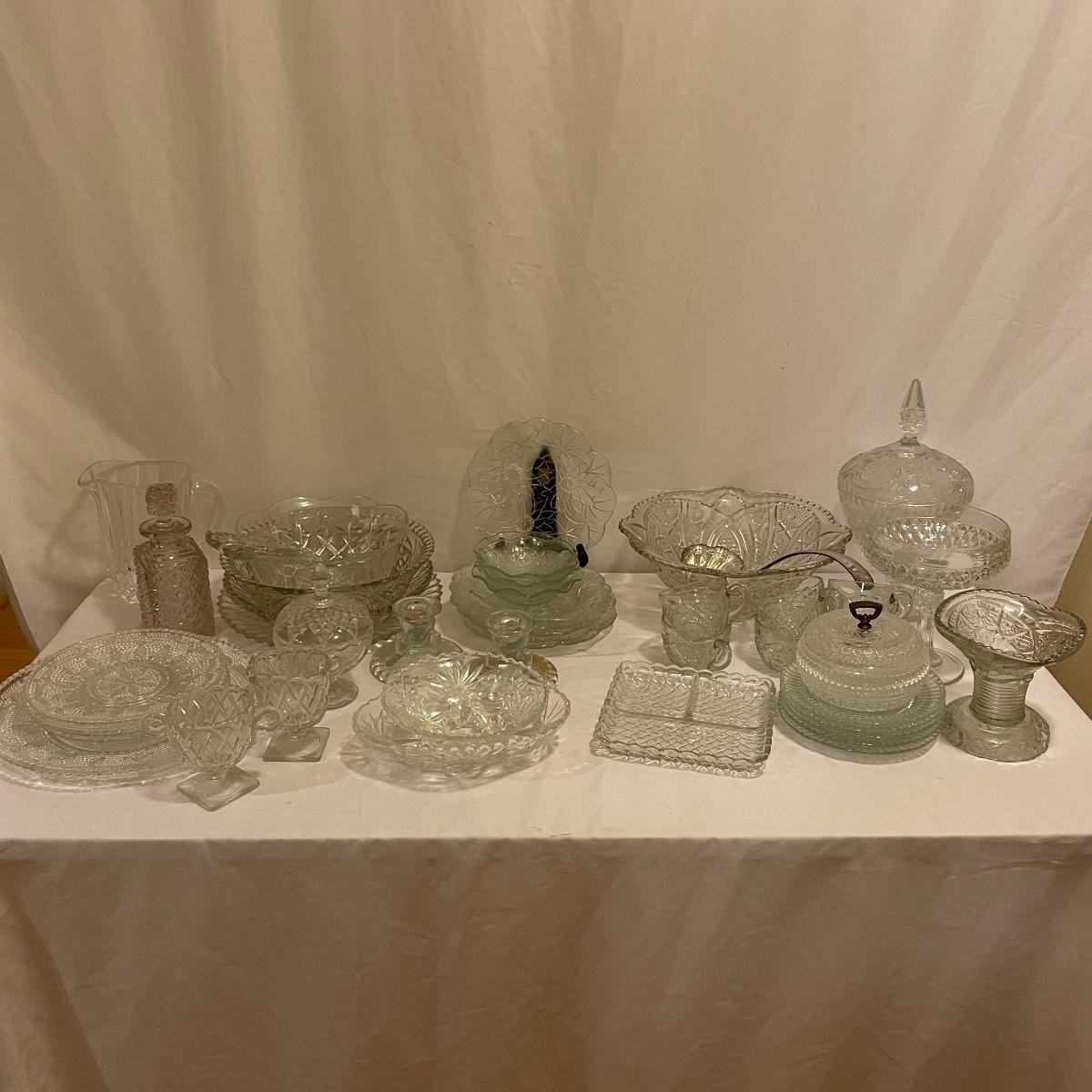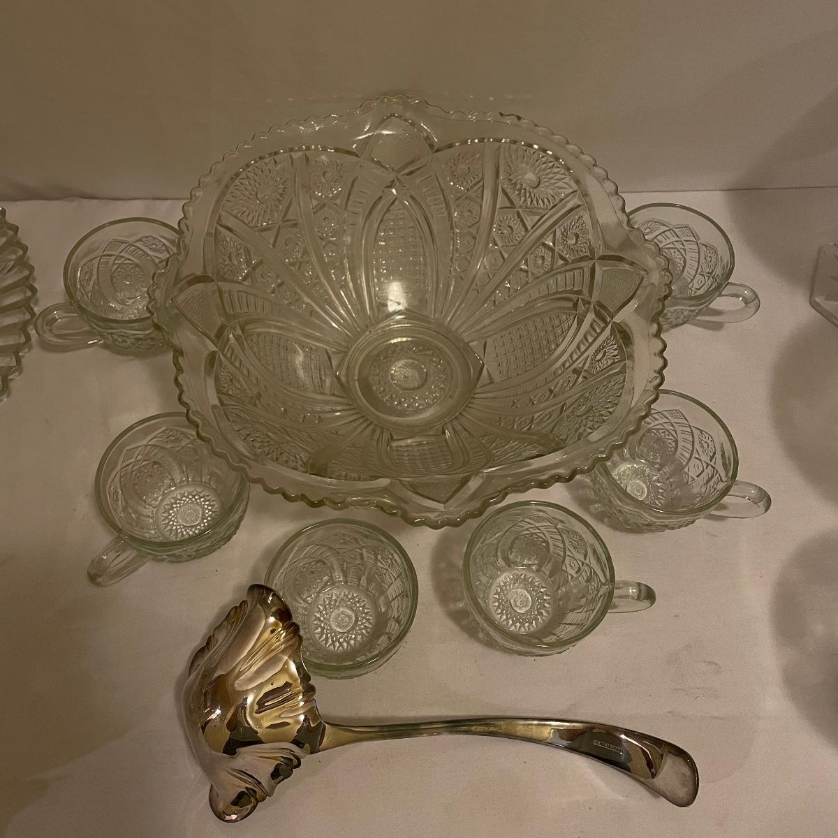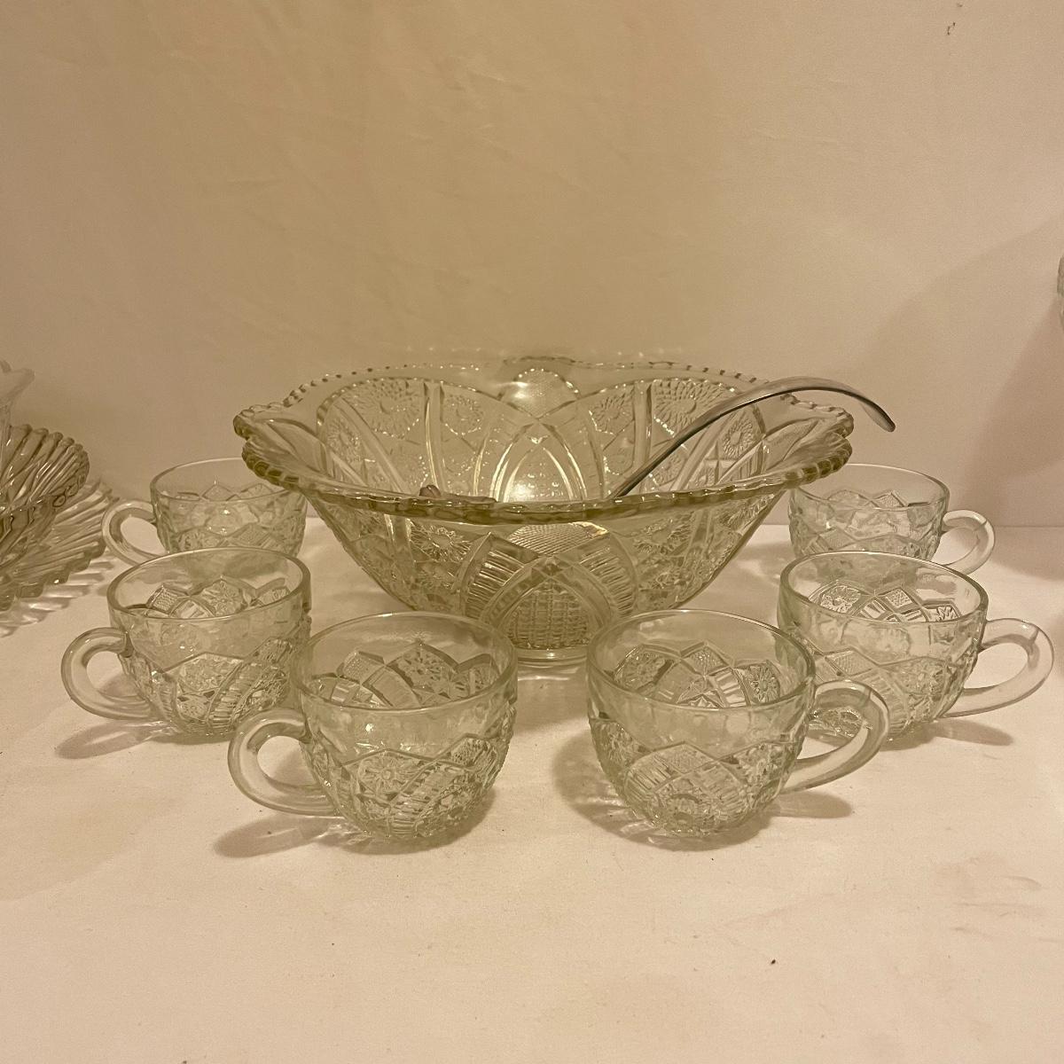 We bet dinner parties will be back with a vengeance sooner rather than later! Showcase the skills you learned over the last year with these elegant cut and formed glass sets. Lot includes a beautiful, heavy 7” tall pitcher and bowl duo, a delicately knobbed 11.5”platter with four matching plates, a punch bowl with six cups and a Sheffield, England ladle. Lot also includes lidded candy dishes, sugar creamer set, amazing glass serving utensils and more! See images. Local pick up only.