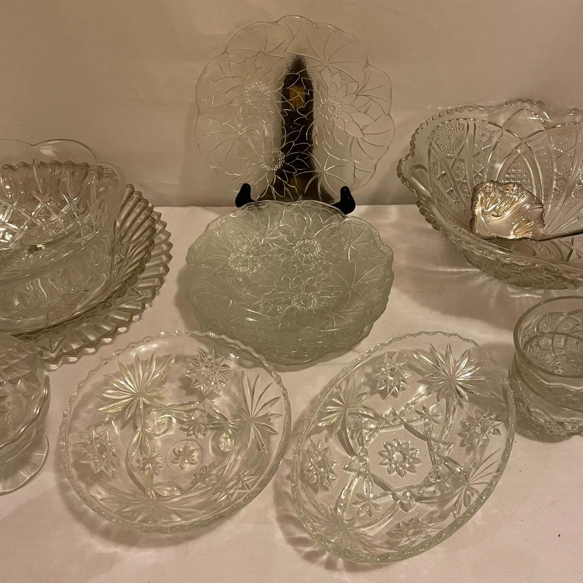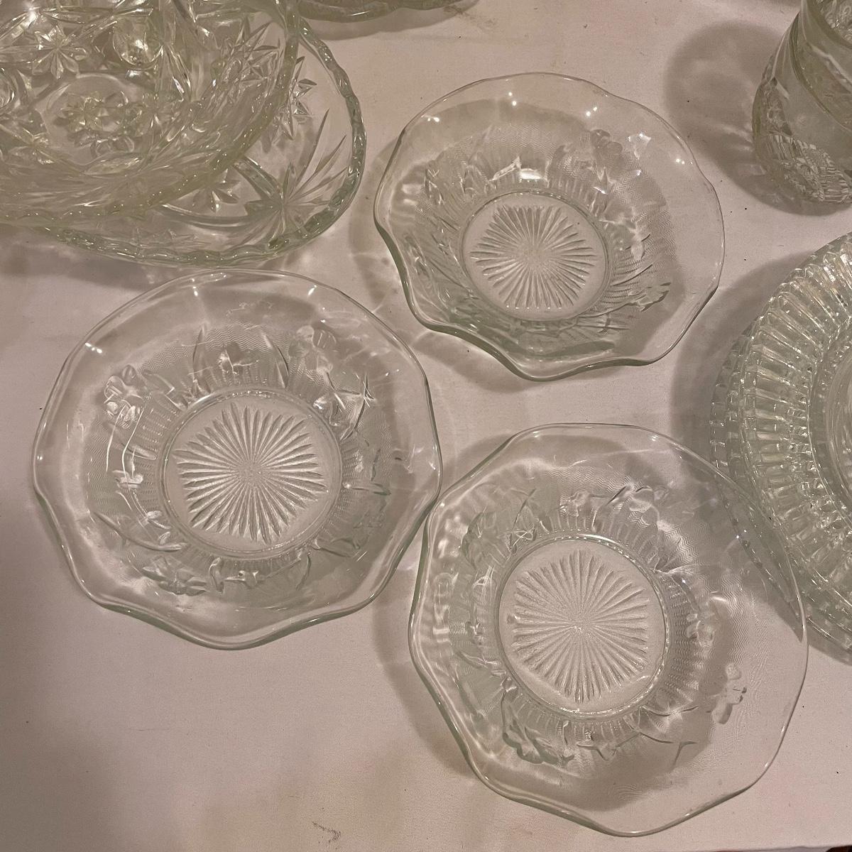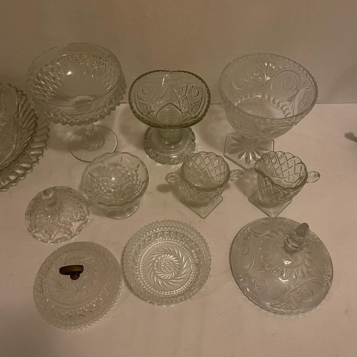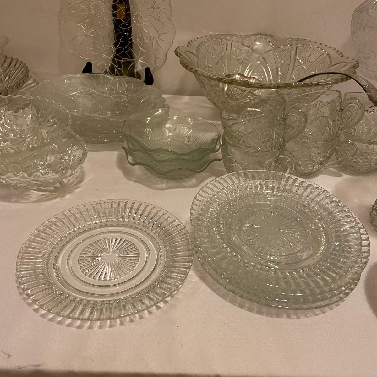 We bet dinner parties will be back with a vengeance sooner rather than later! Showcase the skills you learned over the last year with these elegant cut and formed glass sets. Lot includes a beautiful, heavy 7” tall pitcher and bowl duo, a delicately knobbed 11.5”platter with four matching plates, a punch bowl with six cups and a Sheffield, England ladle. Lot also includes lidded candy dishes, sugar creamer set, amazing glass serving utensils and more! See images. Local pick up only.