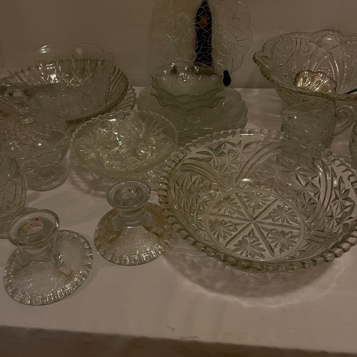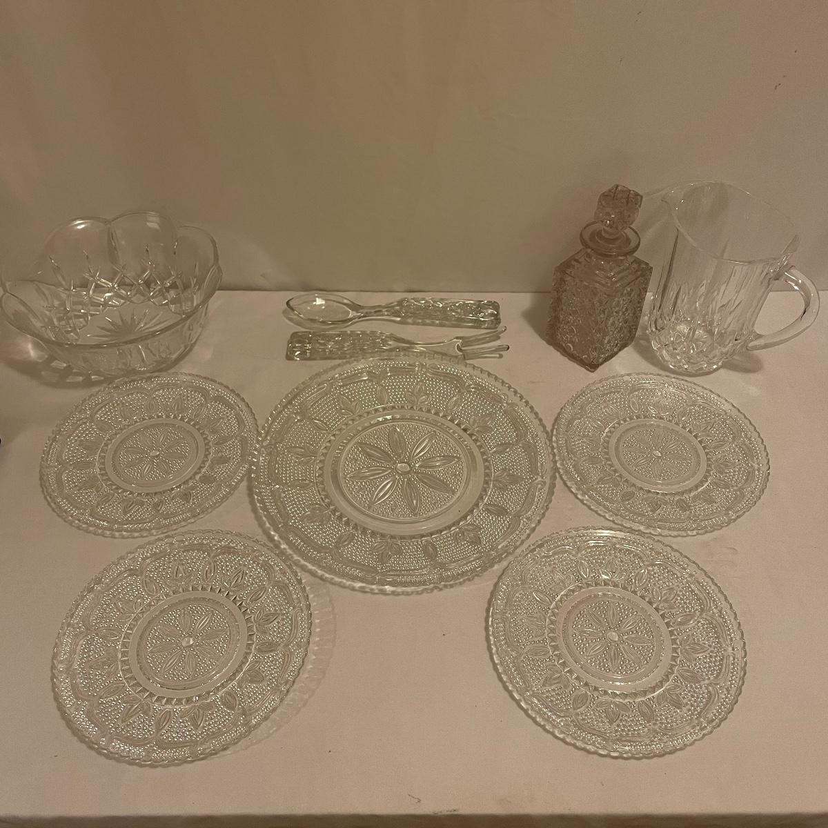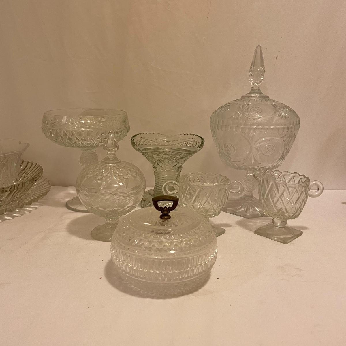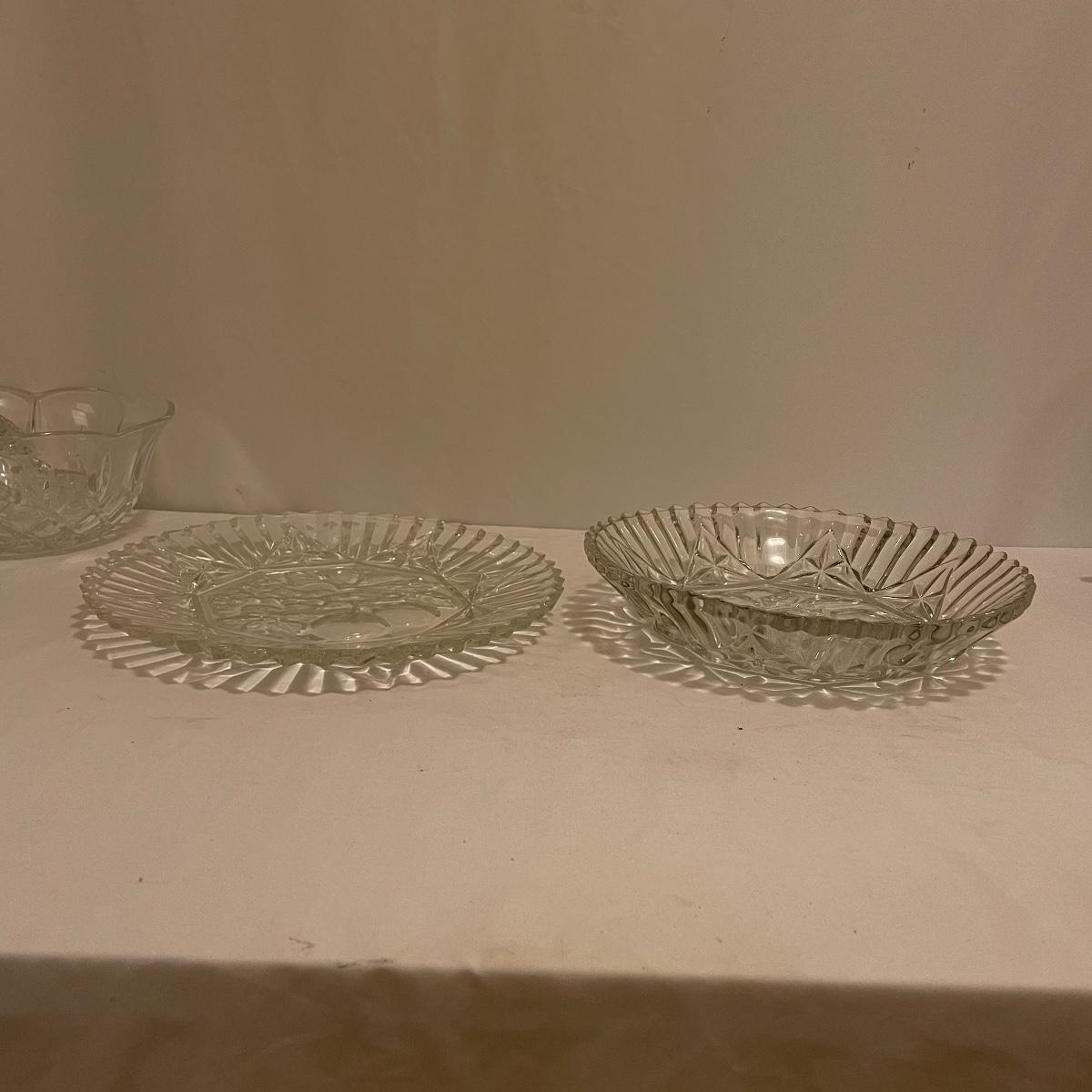 We bet dinner parties will be back with a vengeance sooner rather than later! Showcase the skills you learned over the last year with these elegant cut and formed glass sets. Lot includes a beautiful, heavy 7” tall pitcher and bowl duo, a delicately knobbed 11.5”platter with four matching plates, a punch bowl with six cups and a Sheffield, England ladle. Lot also includes lidded candy dishes, sugar creamer set, amazing glass serving utensils and more! See images. Local pick up only.
