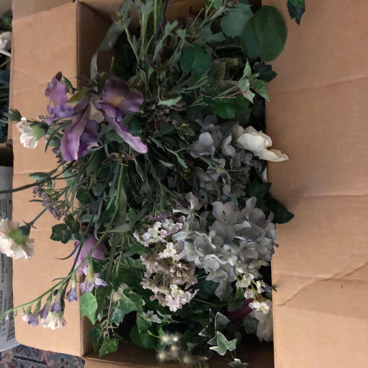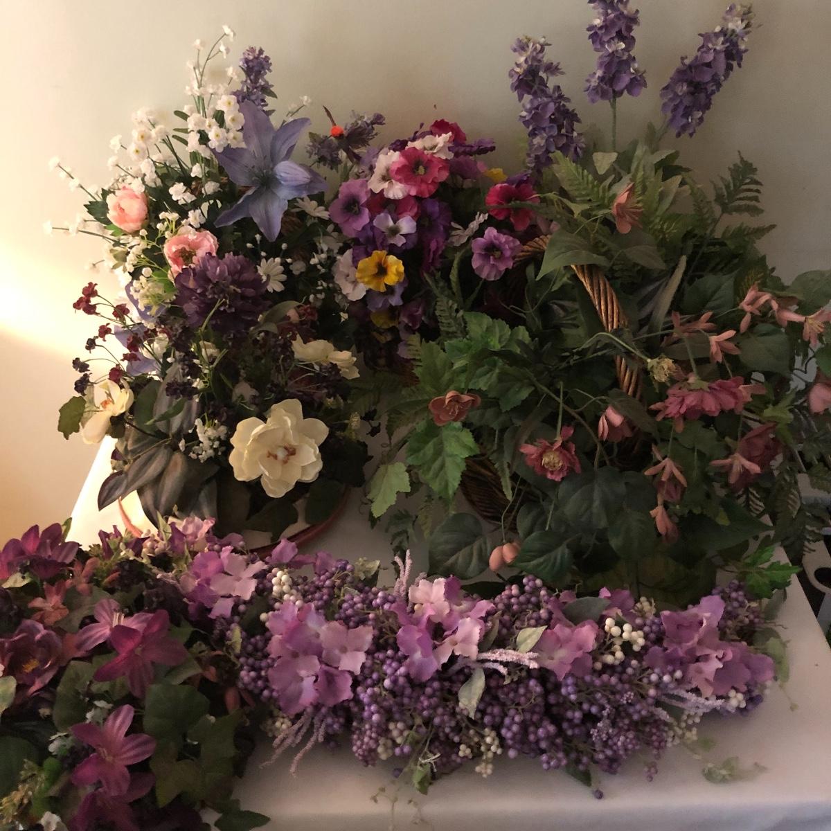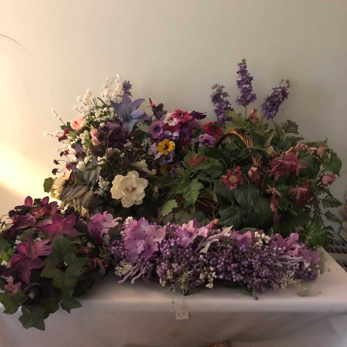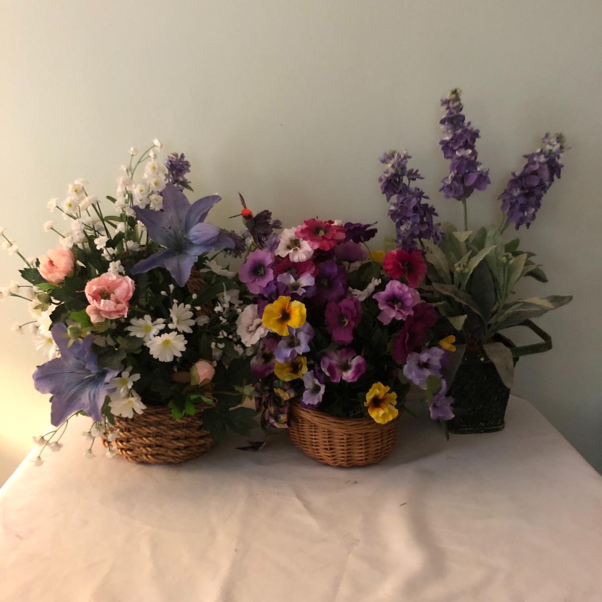 A large selection of faux floral to brighten up your home. Lot includes seven different types of faux floral arrangements in baskets and a pot. Also includes three cardboard boxes with a variety of faux flowers and plants.