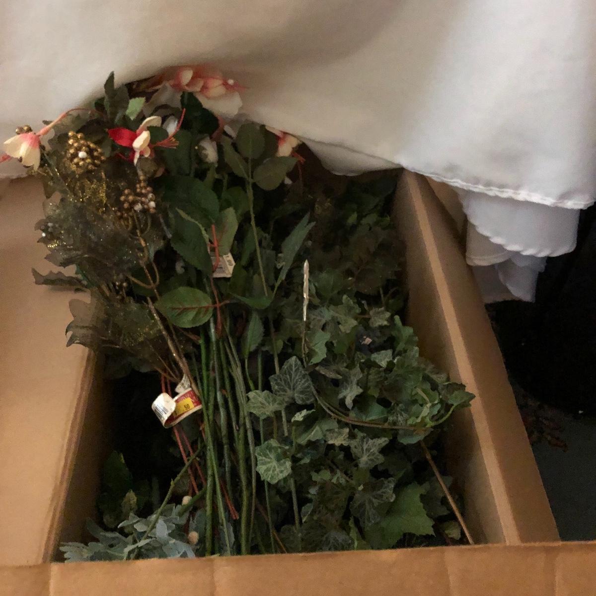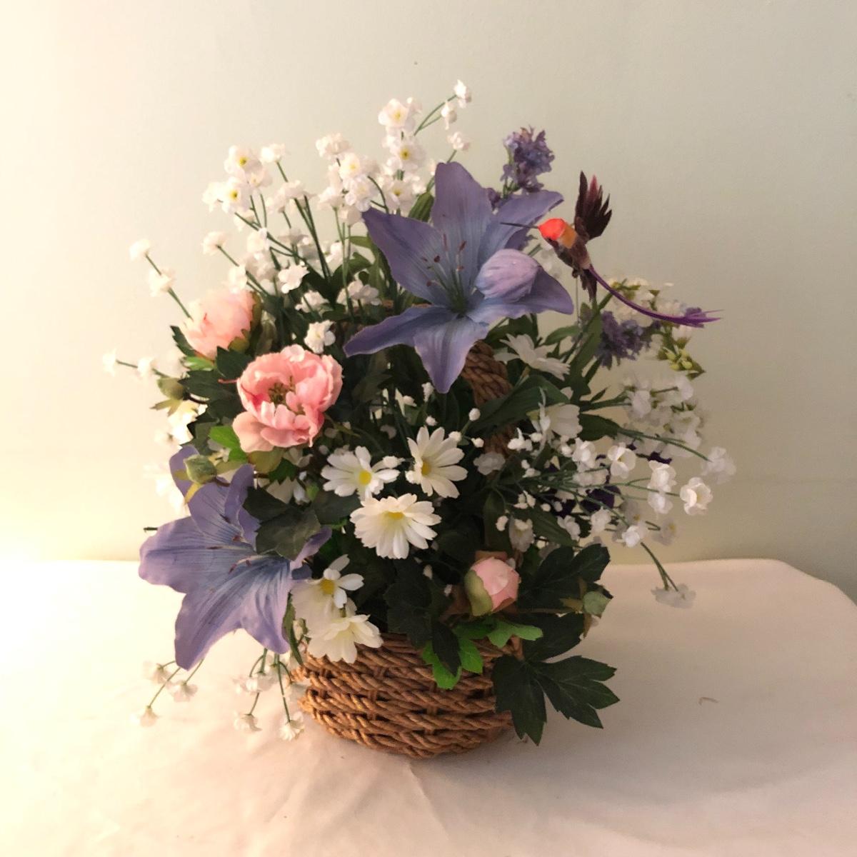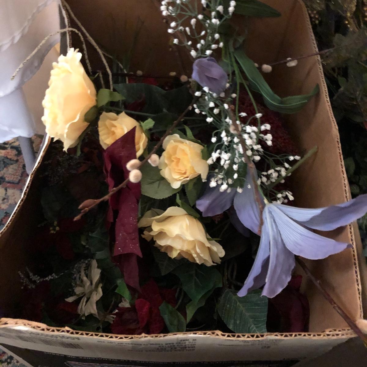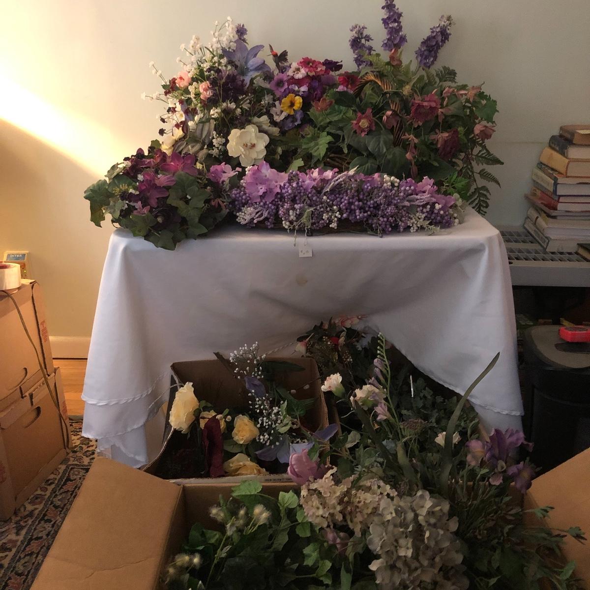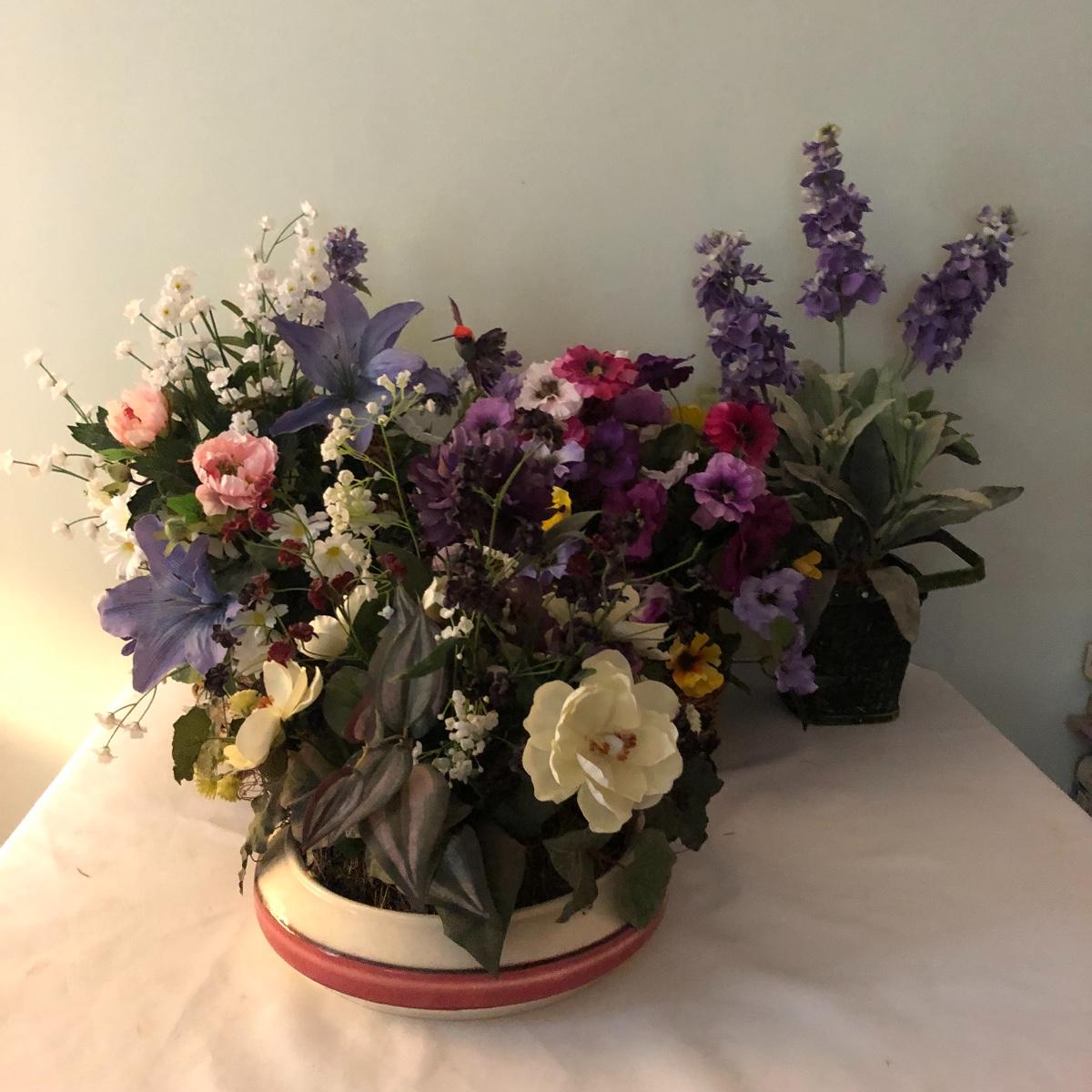 A large selection of faux floral to brighten up your home. Lot includes seven different types of faux floral arrangements in baskets and a pot. Also includes three cardboard boxes with a variety of faux flowers and plants.
