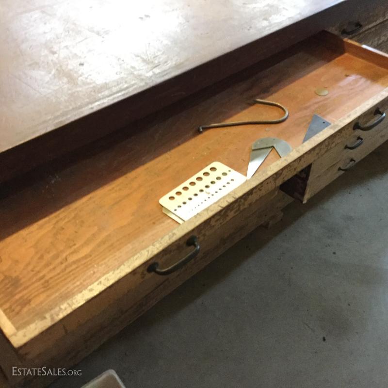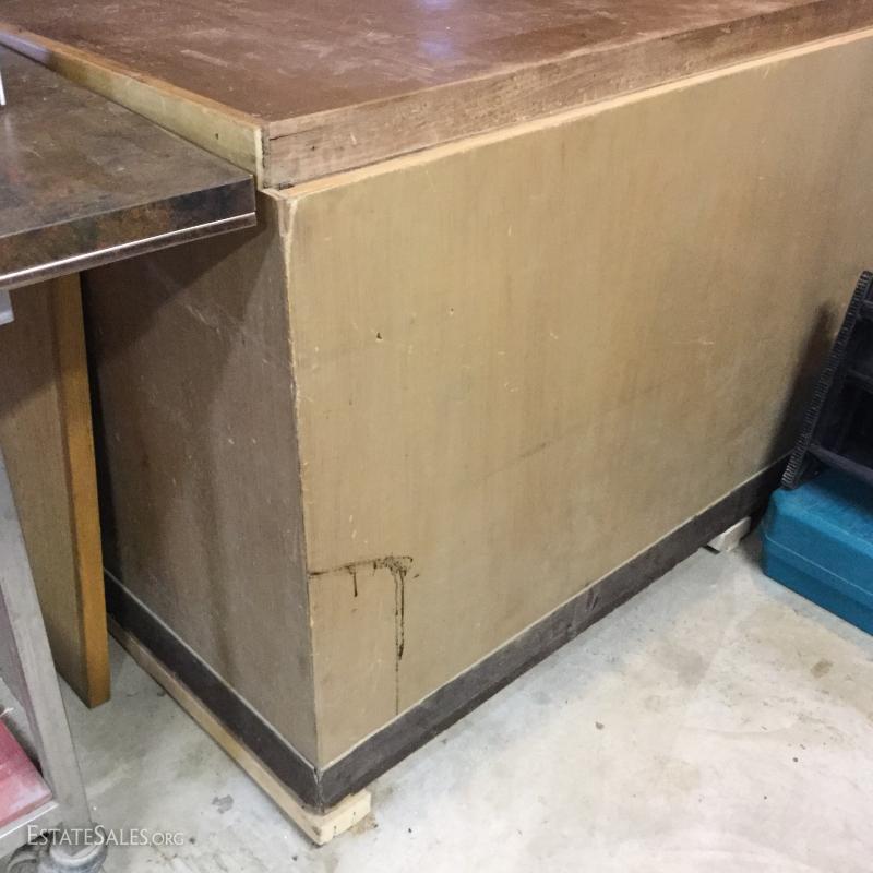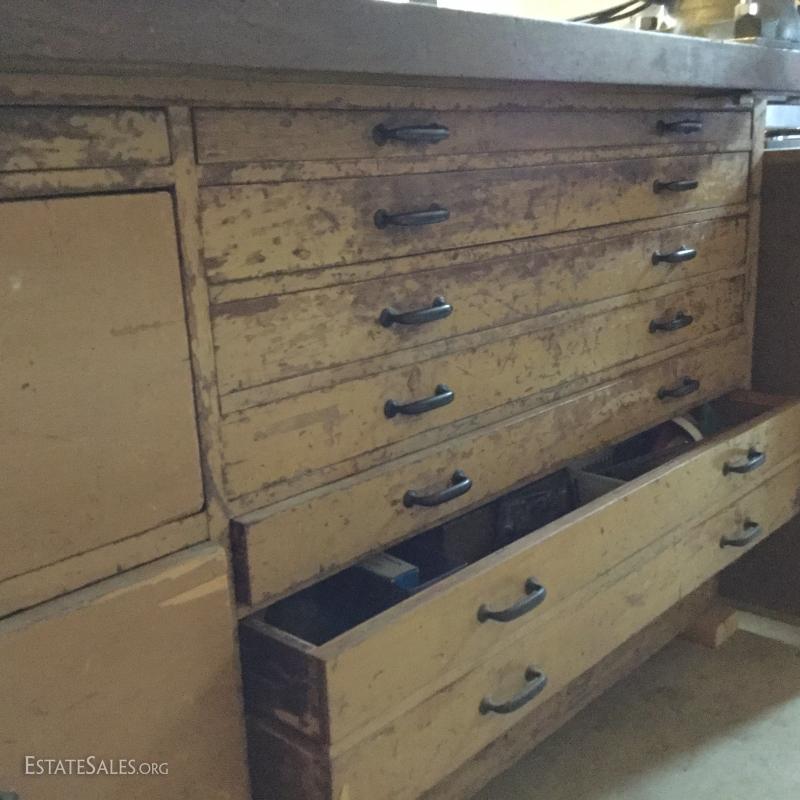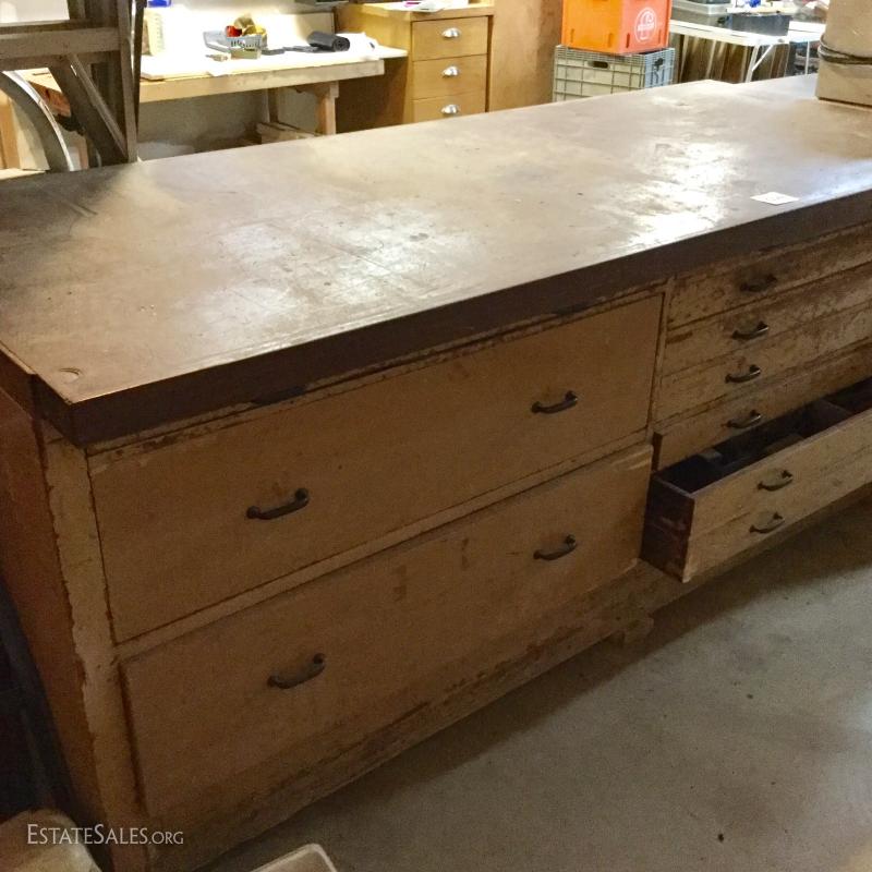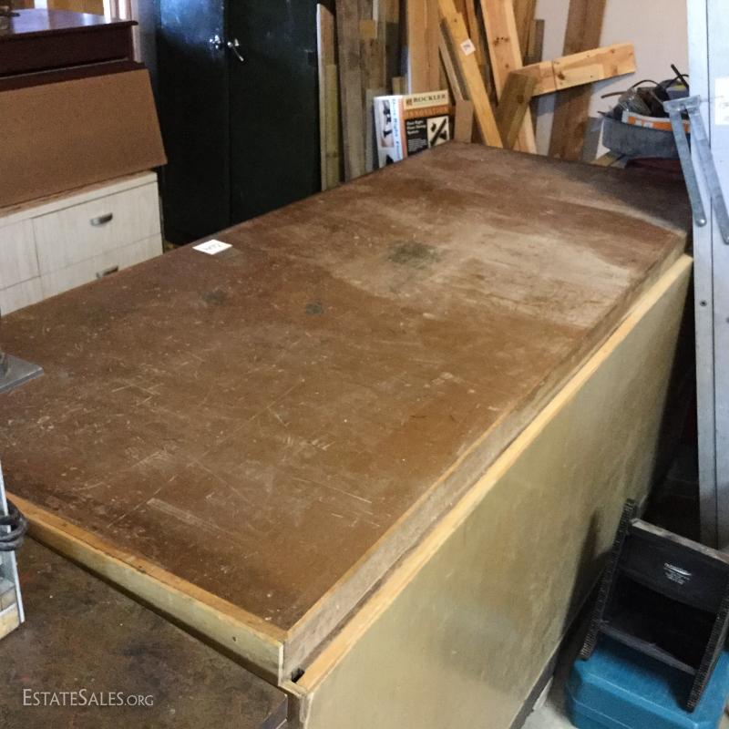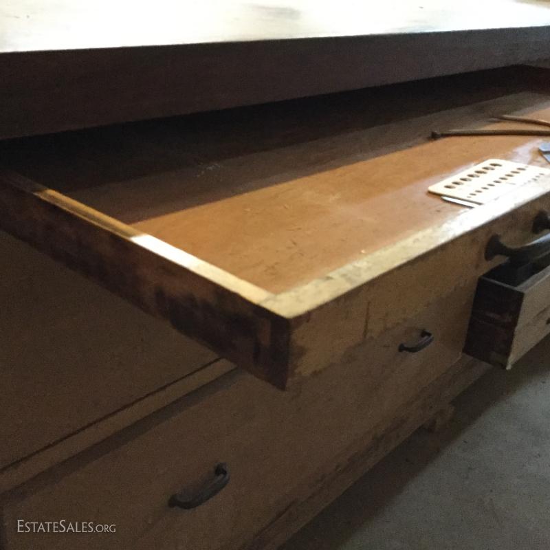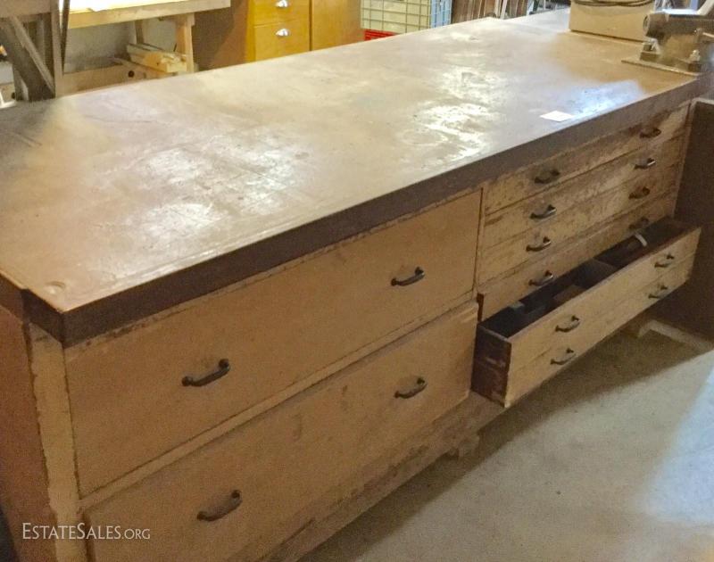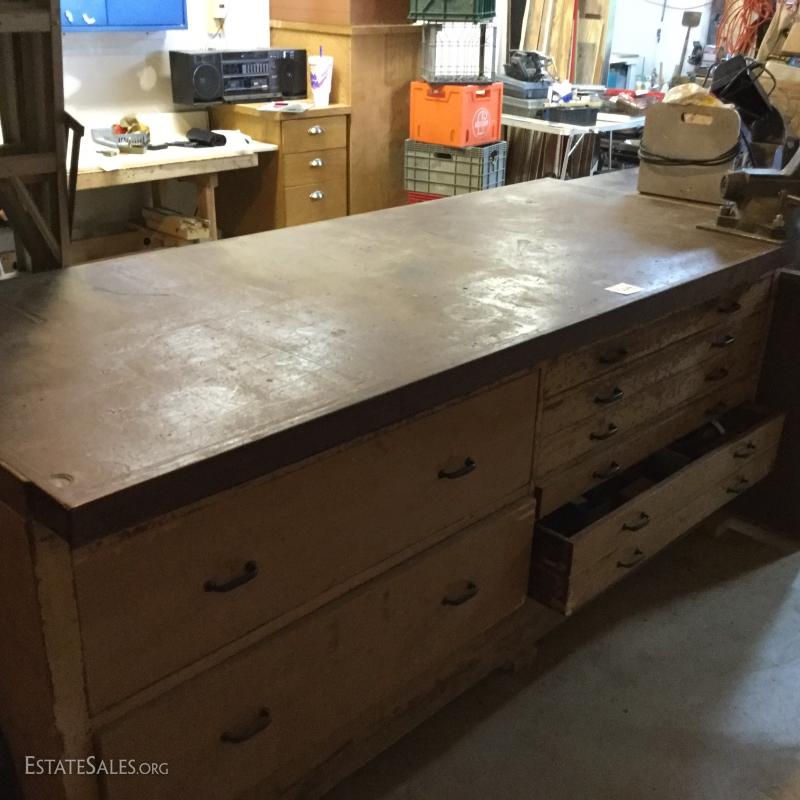 Very large workshop table, 84.5"l x 35"w x 36"h. Incredibly heavy!! Do NOT bid unless you have the means to move it. Will likely need more than just muscle. Bottom is one solid piece. Top is 2.5" thick. Table is super sturdy and comes with drawer contents. Also includes attached vice and brackets.