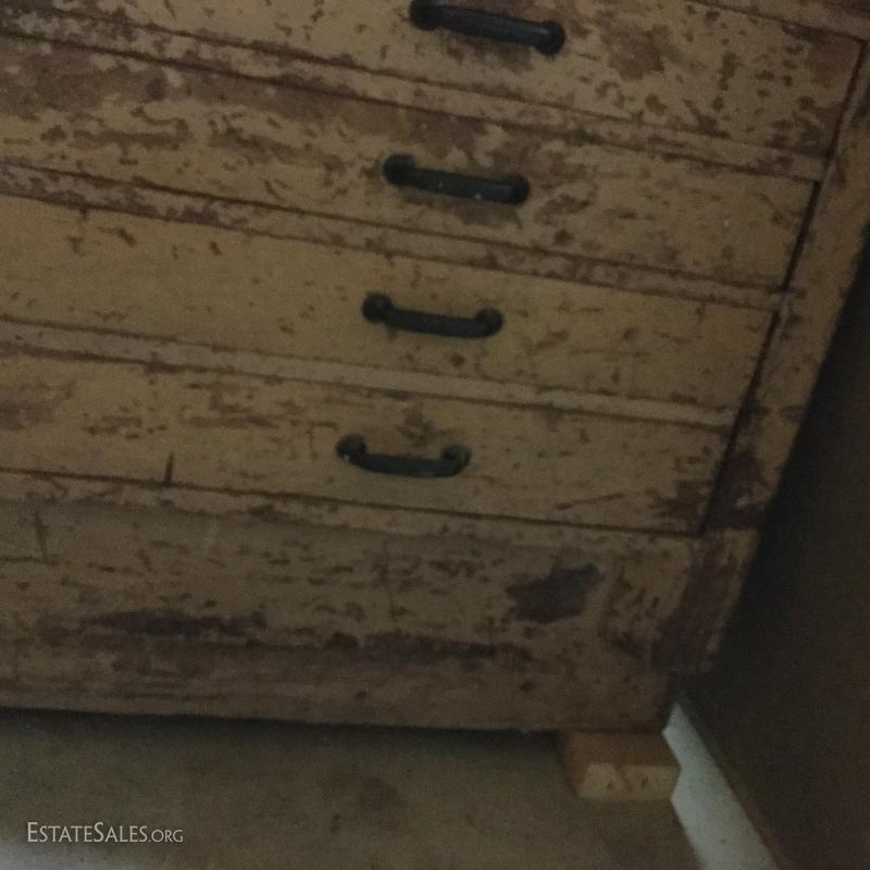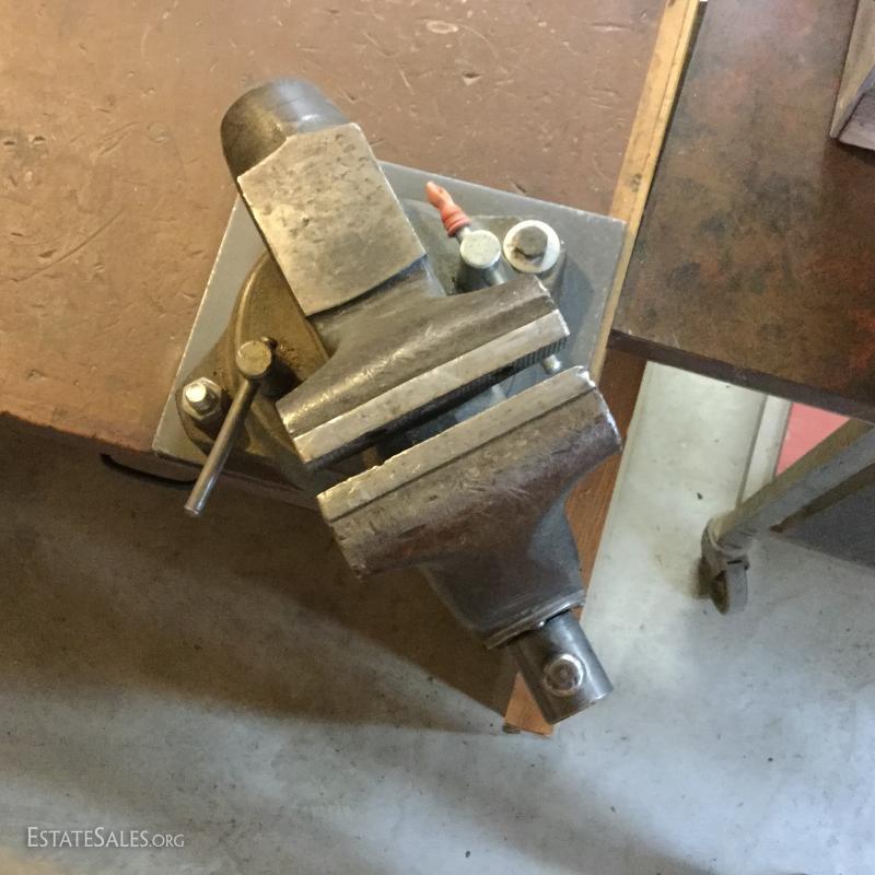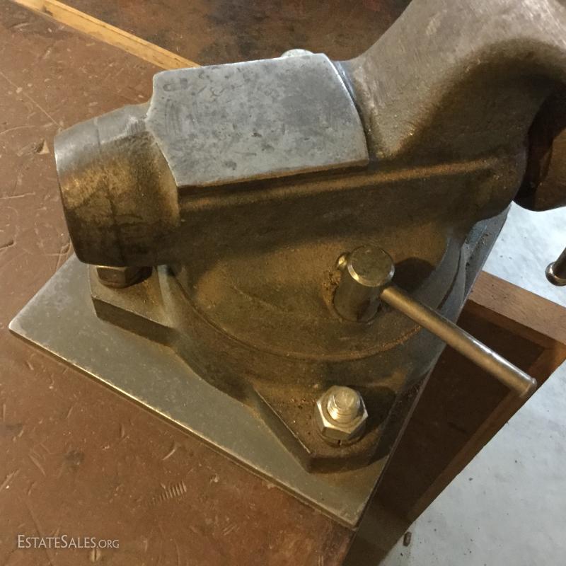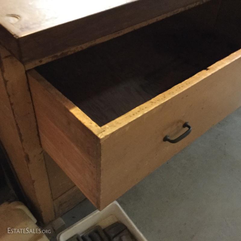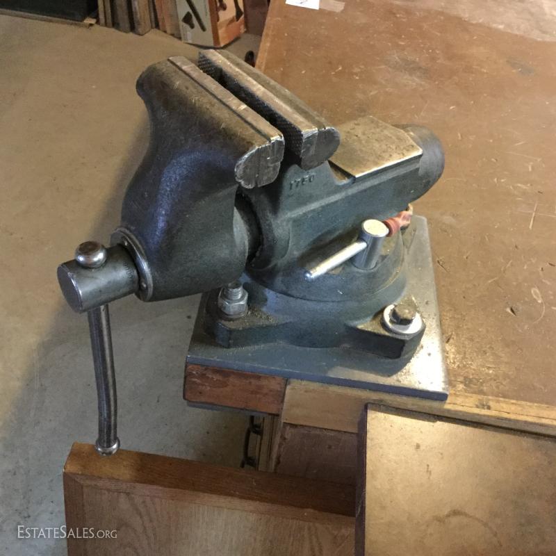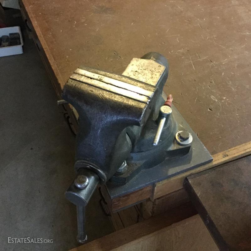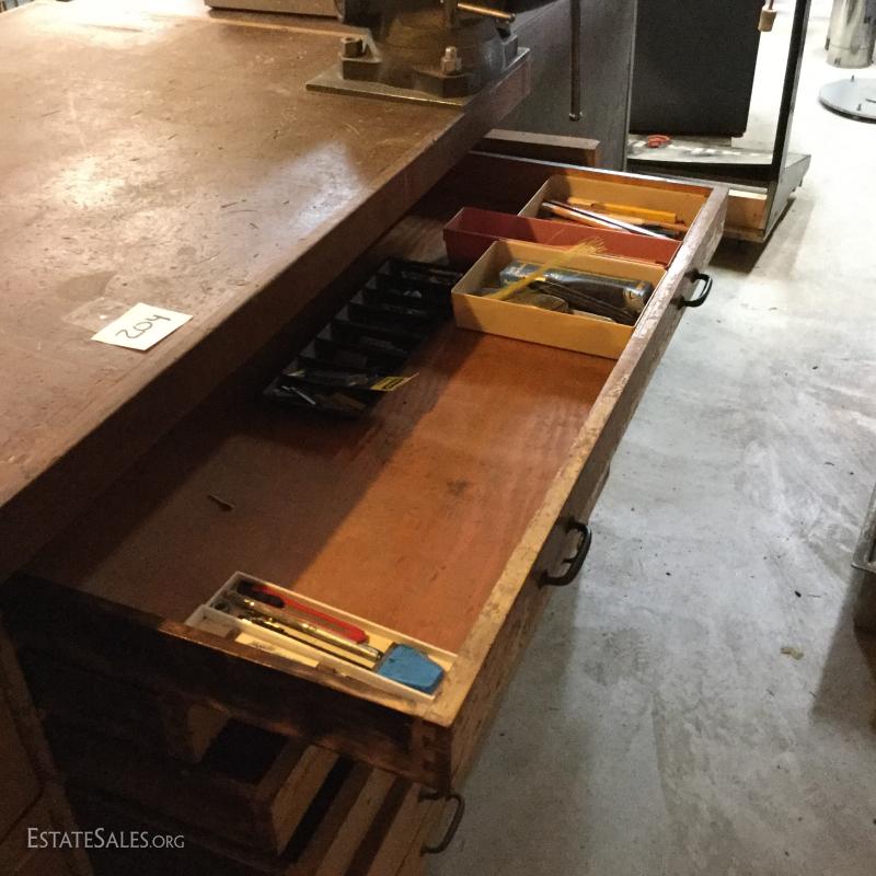 Very large workshop table, 84.5"l x 35"w x 36"h. Incredibly heavy!! Do NOT bid unless you have the means to move it. Will likely need more than just muscle. Bottom is one solid piece. Top is 2.5" thick. Table is super sturdy and comes with drawer contents. Also includes attached vice and brackets.